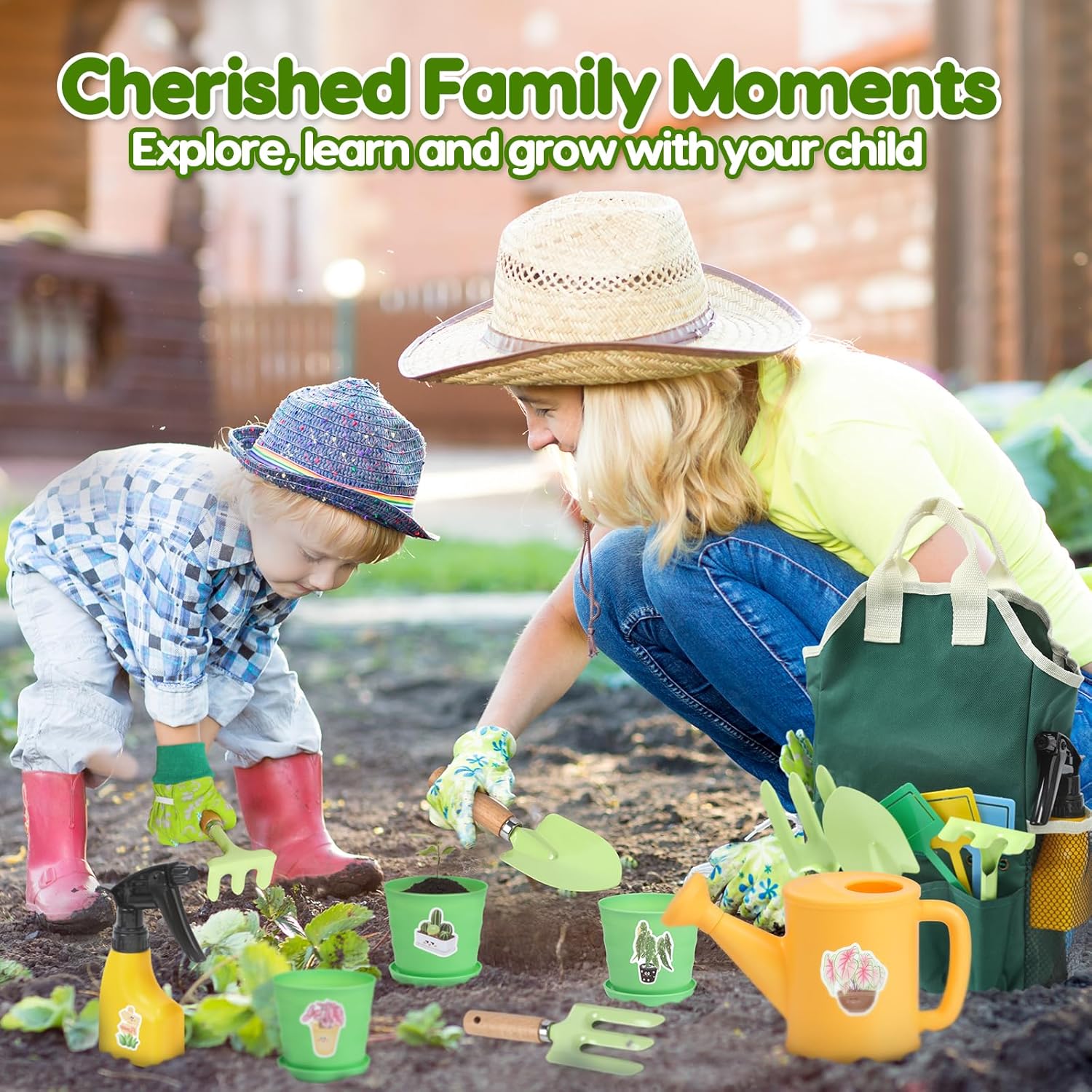 Attrezzi da giardinaggio per bambini: il nostro set di attrezzi da giardinaggio per bambini da 20 pezzi comprende rastrelli in metallo, forchette, cazzuole, flaconi spray, annaffiatoi, guanti, grembiuli, borse per la conservazione e adesivi, perfetti per tutte le esigenze di giardinaggio del tuo bambino. Materiale sicuro e durevole: tutti i nostri giocattoli per attrezzi da giardinaggio sono realizzati con materiali sicuri e di alta qualità con bordi lisci, garantendo durata e sicurezza per i tuoi piccoli. Giocattoli educativi da giardino: questo set da gioco da giardinaggio consente ai bambini di conoscere la crescita delle piante, la natura e il processo di semina e cura delle piante, stimolando al contempo la loro creatività. Gioco all'aperto: i bambini possono utilizzare questi kit di strumenti all'aperto per giocare nella terra o nella sabbia, promuovendo l'attività fisica e l'apprendimento pratico. I genitori possono unirsi al divertimento, creando momenti di legame speciali. OTTIMA IDEA REGALO: grembiuli e borse tote offrono ampio spazio di archiviazione, rendendo facile mantenere tutti gli strumenti organizzati e pronti per la prossima avventura. Questo set di attrezzi da giardinaggio è un regalo perfetto per compleanni, vacanze o qualsiasi occasione speciale. Dimensioni per le mani dei più piccoli: gli strumenti sono dimensionati per le mani dei bambini, rendendoli più facili da usare e maneggiare. I colori vivaci attireranno sicuramente l'attenzione dei tuoi bambini e susciteranno il loro interesse per le attività di giardinaggio