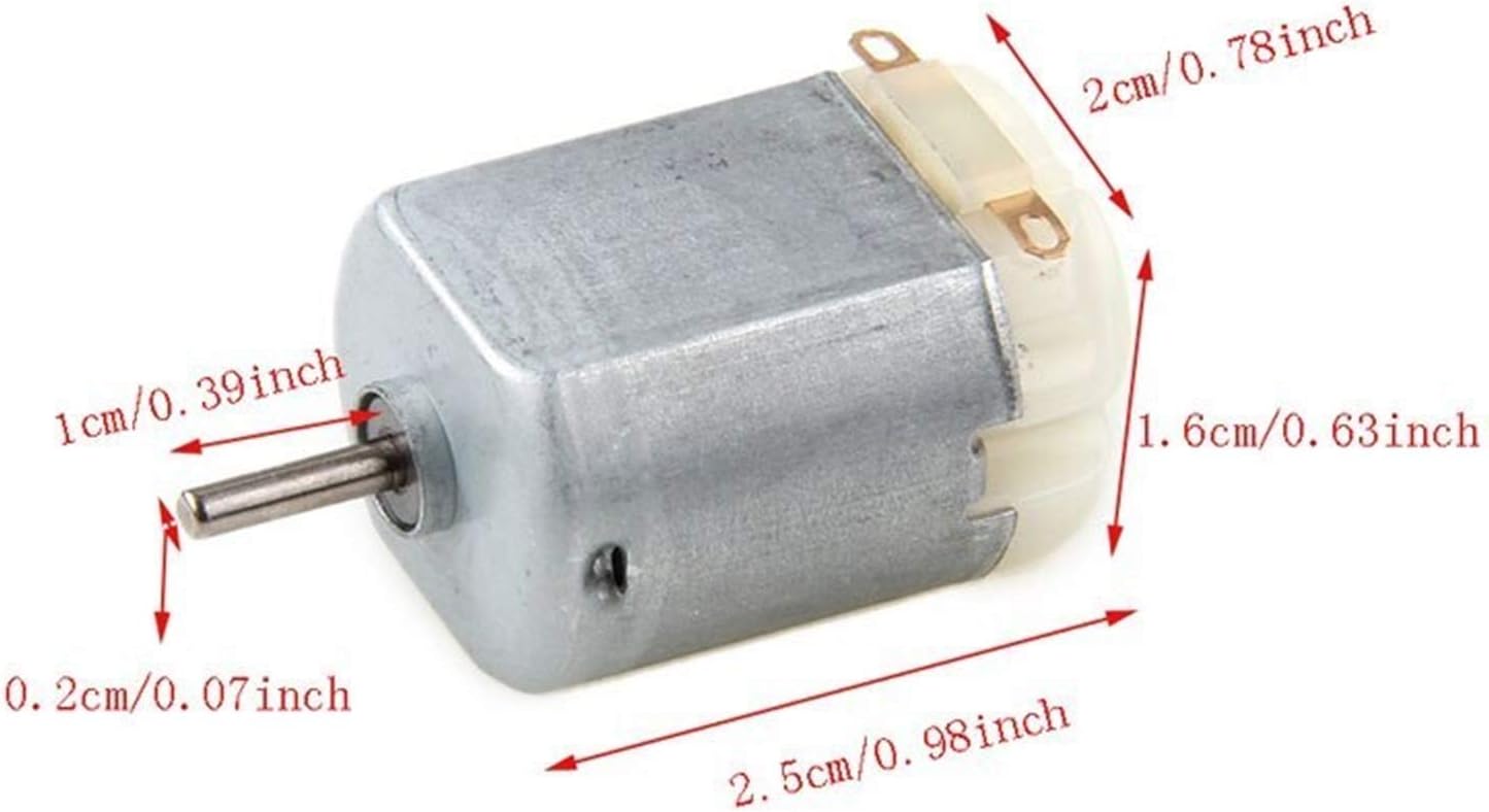 Realizzato con materiali di alta qualità, ha prestazioni stabili, bassa rumorosità ed è molto facile da usare. Alta qualità, elevata resistenza all'usura, prolunga la durata del motore, durevole, leggero, facile da installare. Tensione di ingresso: 3V-6V DC Possibilità di uscita massima (senza carico) 5.000 (3V) fino a 10.000 (6V) Diametro dell'albero: 2mm / 0.07 pollici;Dimensione del corpo del motore: 2.5x2x1.6cm / 0.98x0.78x0.63inch
