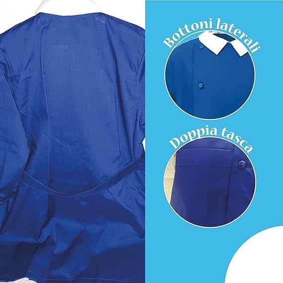 Questo grembiule per la scuola elementare è un capo di abbigliamento essenziale per il tuo piccolo. Realizzato in tessuto resistente Blu con bottoni, questo grembiule è perfetto per proteggere i vestiti dei tuoi bambini durante le attività creative e i pasti. Puoi personalizzarlo con il nome o il personaggio preferito del tuo bambino, rendendolo unico e speciale. Questo grembiule è prodotto in Italia con materiali di alta qualità, garantendo durata e comodità. Ideale per bambine dai 6 ai 15 anni, questo grembiule è facile da indossare e da togliere, incoraggiando l'indipendenza dei tuoi piccoli. Proteggi i vestiti dei tuoi bambini e lascia che si divertano senza preoccupazioni con questo grembiule adorabile e funzionale. DOPPIA TASCHE LATERALI - CHIUSURA CON BOTTONI - Colletto Bianco