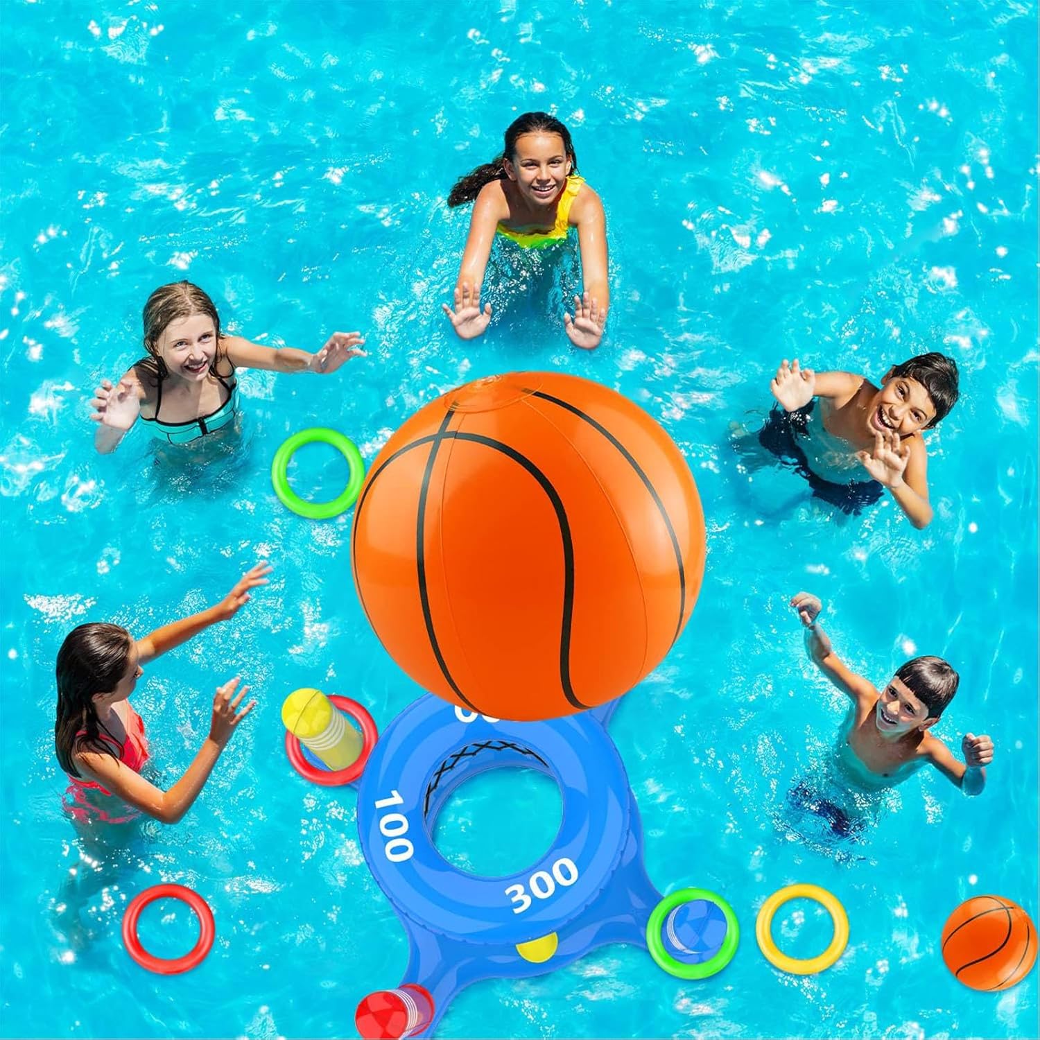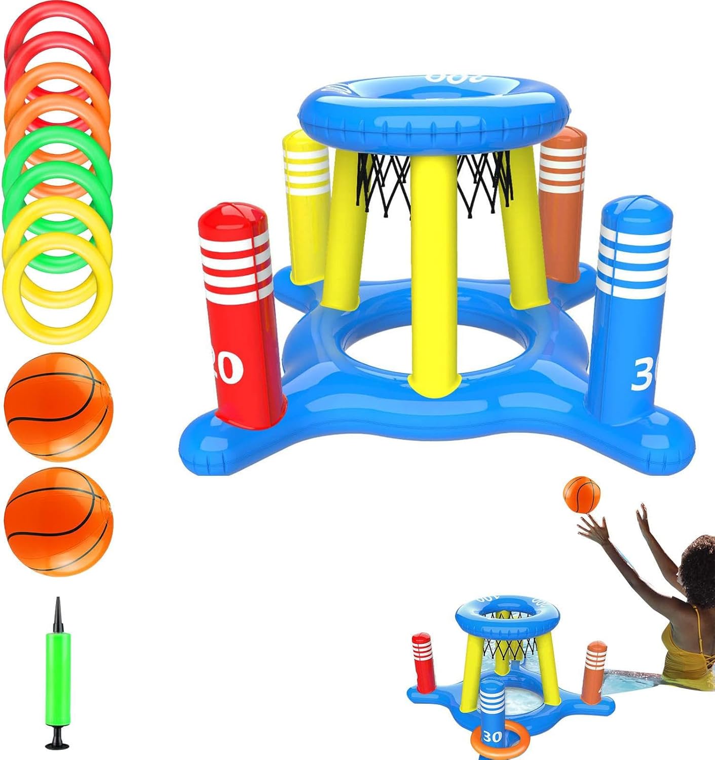 Materiale in PVC forte: questo da basket da piscina è realizzato in materiale in PVC resistente che lo protegge da e perdite. Puoi divertirti a giocare a basket in acqua per molto . Compatto e divertimento: non c'è bisogno di preoccuparsi di installazione o strumenti complicati. Questo da basket da piscina si gonfia in pochi minuti e si sgonfia rapidamente quando non è in uso. È conveniente da trasportare e archiviare ovunque tu voglia. Incredibile set di giochi in piscina: questo da basket da piscina comprende 2 basket gonfiabili, 1 giocattolo a lancio a incrociato, 1 da basket gonfiabile e 8 cerchi gonfiabili per varie attività idriche. È un ottimo modo per godersi il in piscina con la tua famiglia e Vasta applicazione: sia che tu voglia goderti giochi da spiaggia o attività all'aperto come feste in piscina, questo da basket piscina è il giocattolo estivo ideale per te. Può essere usato per varie occasioni come feste di compleanno, feste in spiaggia o giochi da cortile. È anche adatto a tutte le età e livelli di abilità, quindi tutti possono unirsi al divertimento. Set di giocattoli a piscina multifunzione: questo da basket da piscina ti consente di goderti sia i giochi di basket che il lancio del in acqua. Ha un aspetto e colorato che lo rende più attraente per bambini e adulti. Questo giocattolo in piscina migliora la tua esperienza di gioco idrico e ti aiuta a sviluppare coordinamento e abilità motorie per gli occhi.