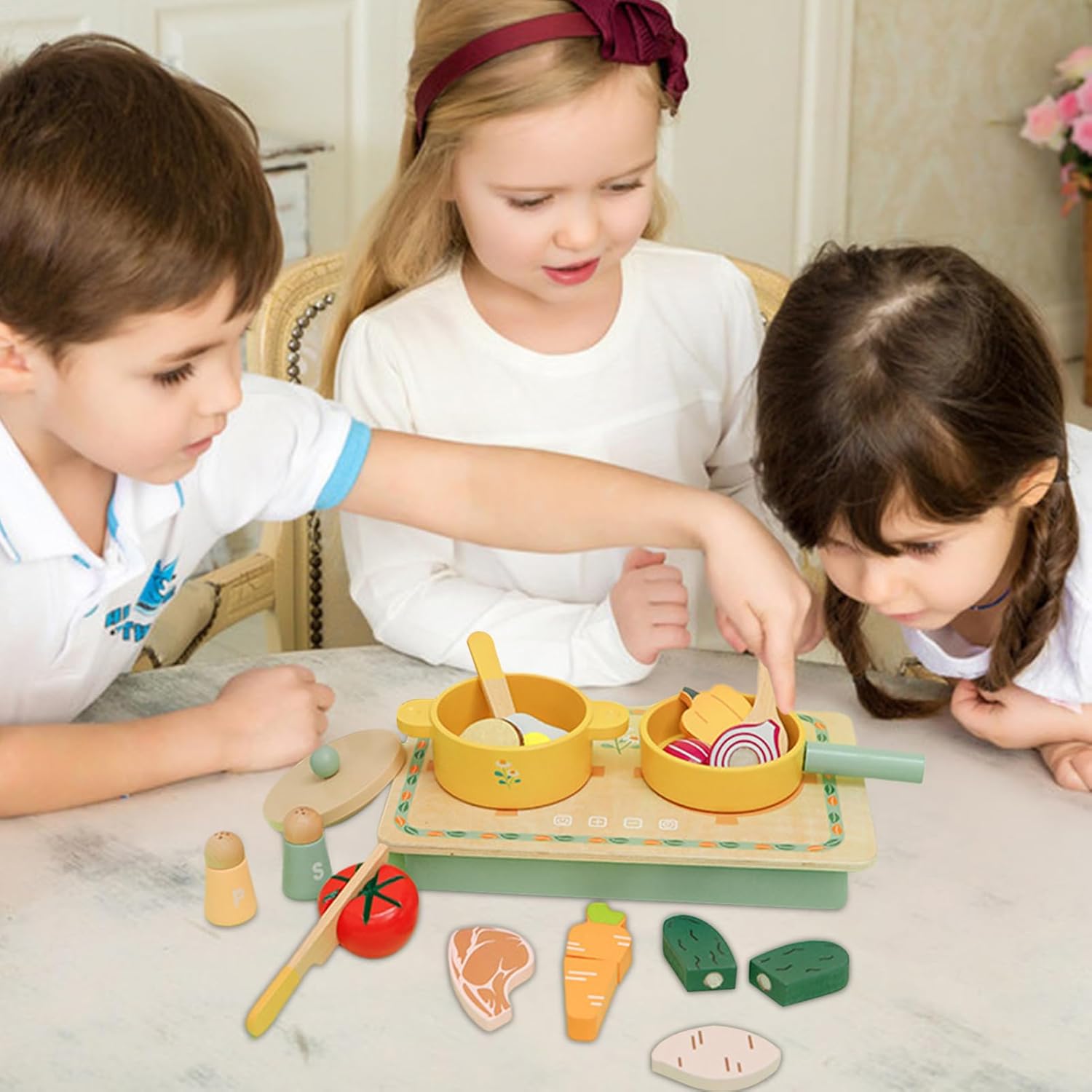 Materiale forte: costruito con materiali selezionati di alta qualità, il nostro set da cucina in legno di lunga durata garantisce un tempo di gioco sicuro e innocuo per i bambini di tutte le età Design creativo: versione impressionante con eccellente artigianato, garantendo durata e fascino estetico per ore di gioco fantasioso, questo set da cucina offre un'esperienza visivamente impressionante Incoraggia le abilità di gioco di ruolo: piena di una varietà di ingredienti simulati e strumenti da cucina, consentendo ai bambini di lanciare creatività illimitata nelle scene culinarie Buon regalo: incoraggia il tempo di gioco fantasioso con questo set da cucina simulato, un buon regalo per compleanni, vacanze come il Ringraziamento e Natale o altro Facile da trasportare: senza sforzo portatile e leggero, questo set di cottura simulato consente ai bambini di usarlo in qualsiasi momento, ovunque con le sue squisite scatole di imballaggio