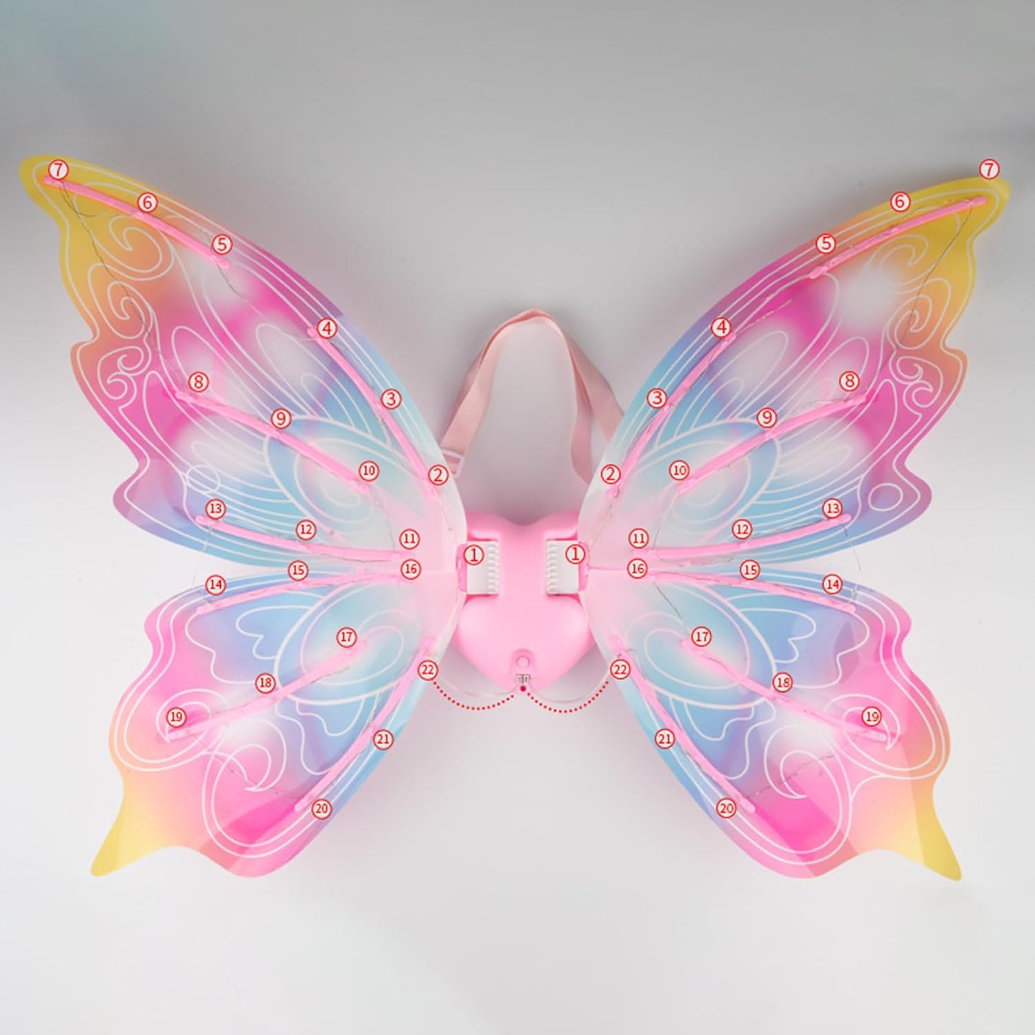 Stimola la creatività: alimentate dal desiderio di bellezza, le nostre ali elettriche da fata trasporteranno il tuo bambino in un mondo sognante di più possibilità. Creatività ispiratrice e risate Divertimento musicale: le nostre ali offrono una ricca esperienza sensoriale di luce e musica, e con il lettore musicale integrato, i bambini possono suonare i loro brani preferiti per ore di intrattenimento felice Design colorato e abbagliante: le nostre ali elettriche da fata presentano un design incredibilmente scintillante e incantevole che sembra ali di farfalle, irresistibile per i bambini. Le strisce illuminate sulle ali si illuminano al buio Regalo premuroso: queste ali elettriche da fata per ragazze sono un regalo unico per sorprendere la tua ragazza speciale. Diffondi amore e gioia con questa pratica idea regalo perfetta per amici e familiari come regalo per le vacanze o sorprese quotidiane Comfort per lunghe ore: queste ali sono leggere e confortevoli, garantendo che i bambini di diverse età possano indossarle comodamente per ore con il design della tracolla regolabile