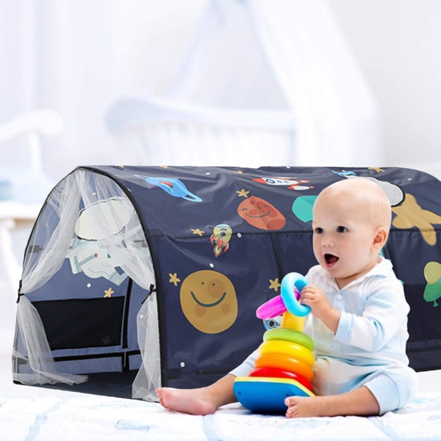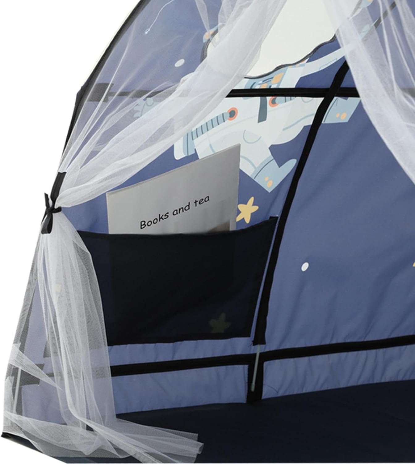 Design con motivi carini: progettato con stelle dei cartoni animati, luna e spazio, la tenda da letto è molto utile per l'allenamento visivo precoce del bambino abbinando immagini e colori. Mondo privato per: le tende da gioco per i bambini offrono un mondo privato alle età, dotate di piccole finestre in rete sulla parte superiore e tende, ideali per leggere, giocare e dormire. Funzione 2 in 1: si adatta a due letti singoli, la tenda da gioco per interni utilizza una cucitura a doppio filo solida e stabile, senza collasso, senza piegatura, senza telaio metallico e senza crepe. Confortevole per dormire: una tenda per dormire facile da montare e leggera, le tende interne per bambini permettono al vostro bambino di addormentarsi sotto le stelle comodamente come nel proprio letto, portando fuori nella vostra camera da letto. Tende a scomparsa compatte: la tenda da letto per bambini si piega facilmente e si ripone nella borsa da trasporto, ha cavi antiurto e non ha bisogno di attaccarli al telaio del letto, si apre facilmente in un minuto grazie al telaio a scomparsa.