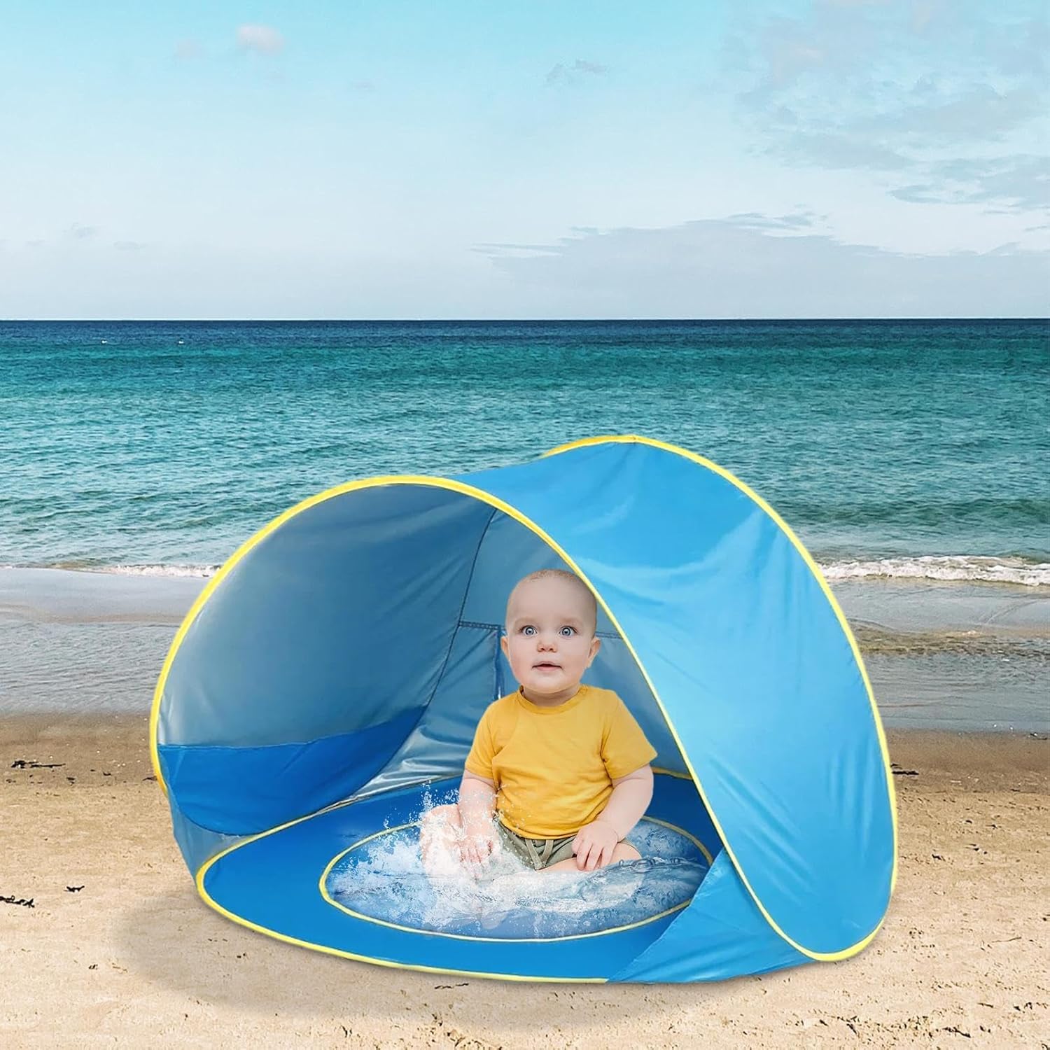 Mini parco giochi acquatico: la nostra spiaggia è realizzata per misurare i bambini sotto i 3 anni, dotata di una mini piscina sul fondo per il divertimento estivo in spiaggia. Lasciate che i vostri bambini giochino in modo sicuro e rimangano freschi in acqua mentre sono protetti da dannosi raggi UV. Protezione UV migliorata: mantieni la tua famiglia dai forti raggi del sole con il nostro parasole da spiaggia. Il tessuto rivestito in argento migliora gradualmente la difesa dei raggi UV, fornendo un livello di protezione più elevato per una piacevole avventura all'aperto. Facile da trasportare: leggero e facile da trasportare, questo cappello da spiaggia si apre senza sforzo per l'installazione e viene fornito un parasole rimovibile. Non solo per la spiaggia: usala come una comoda scatola da trasporto o come tenda da gioco per i bambini. Dimensioni ideali: proteggi il tuo bambino dai dannosi raggi UV divertendosi in acqua con questo ombrellone da spiaggia. Le dimensioni di apertura adeguate, 117x79x70 cm e le dimensioni dell'imballaggio di 53x53 cm, rendono facile portarli in spiaggia. Set utile: non solo perfetto per i viaggi in spiaggia, questa spaziosa tenda, dotata di 2 tasche laterali e una finestra con cerniera, funge anche da riparo da campeggio; include 1 borsa, 4 chiodi per un montaggio sicuro.