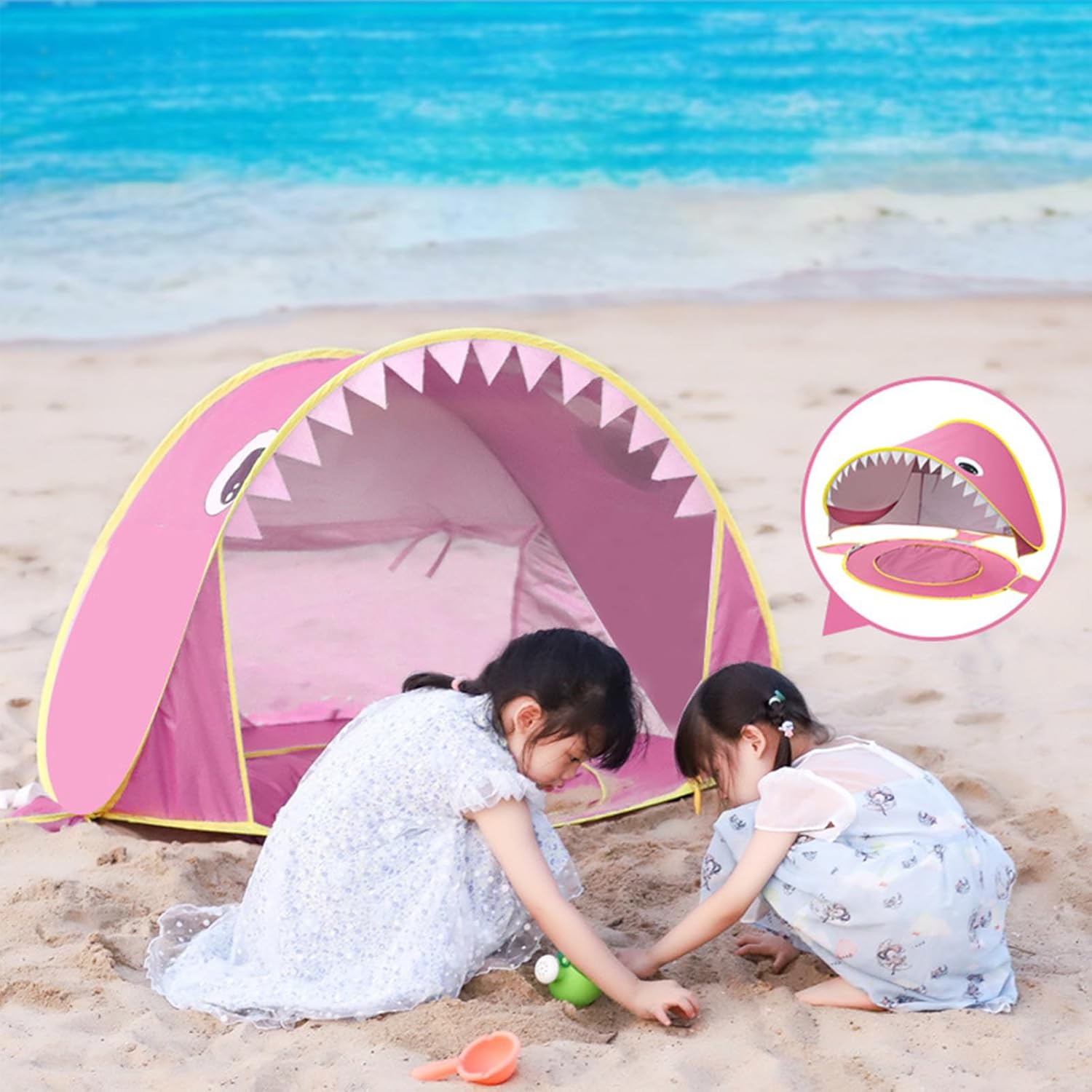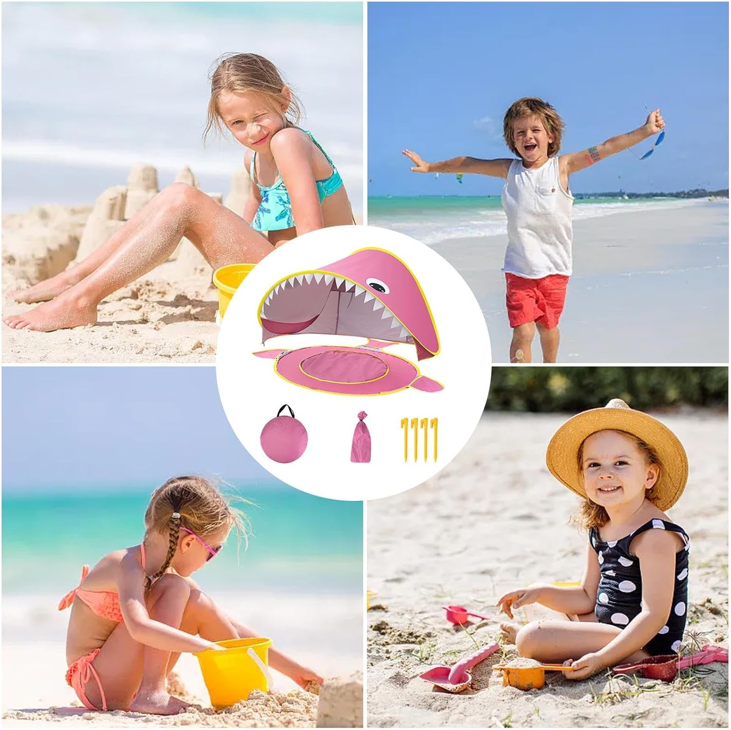 Materiale durevole: questa tenda progettata con un eccellente materiale in poliestere garantisce un tempo di gioco più lungo e offre proprietà impermeabili e antigraffio per gestire facilmente diversi ambienti come le gite in spiaggia Caratteristica integrata della piscina: include l'integrazione creativa del design della piscina per garantire Stabilità e portabilità: dispone di due sacchi di sabbia e quattro inserti per un fissaggio affidabile durante l'uso e si piega ordinatamente nelle borse di trasporto fornite per un comodo trasporto e stoccaggio Tenda a tutto tondo con accessori: la tenda da gioco dispone di una gamma completa di accessori, tra cui giocattoli da spiaggia e quattro ganci di sicurezza che consentono ai bambini di godersi in sicurezza ore di giochi fantasiosi in qualsiasi ambiente Vantaggio del rivestimento anti-UV: la tenda offre un'efficiente protezione UV grazie al suo speciale rivestimento anti-IV e blocca efficacemente i dannosi raggi UV migliorando la sicurezza all'aperto