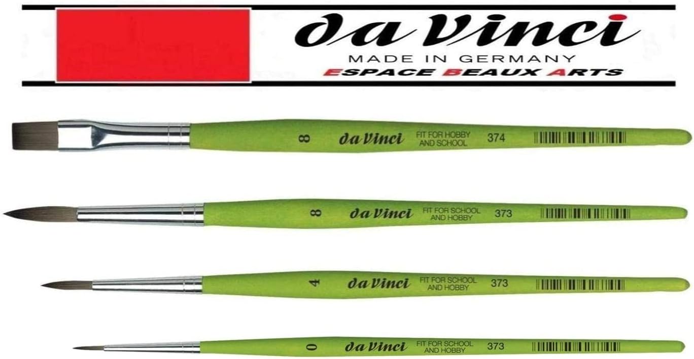 da Vinci Série 373 pennelli Rotondi Sintetici di da Vinci no° 0,4, 8 .da Vinci Serie 374 Pennello Piatto, in Fibra Sintetica, Verde, no° 8 (Set 4pcs) ibre sintetiche grigie, molto elastiche, puntale senza cuciture, questo prodotto innovativo offre prestazioni migliori rispetto al tradizionale pennello da scuola con capelli naturali Manico verde opaco con una texture superficiale di nuova concezione Appartamenti e luminosi per le aree di lavoro, questo prodotto innovativo offre prestazioni migliori rispetto al tradizionale pennello da scuola con capelli naturali, tondi per dettagli e lavoro preciso Sono accessibili e funzionano! Rivestimento uniforme e n capelli randagi, e questi pennelli sono facili da pulire e curare. Finora, le bande metalliche sono andate bene e in ordine. DaVinci ESPACE BEAUX ARTS Made in Germany