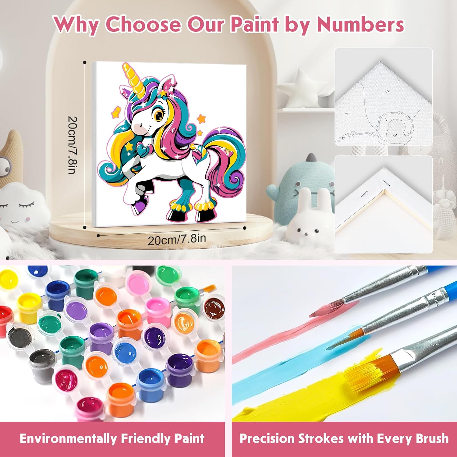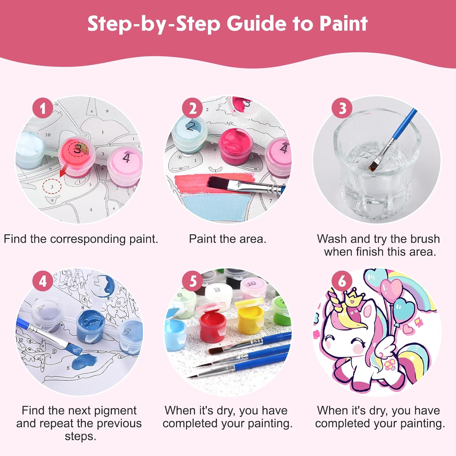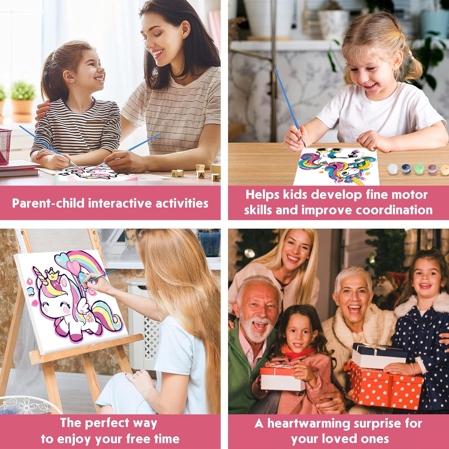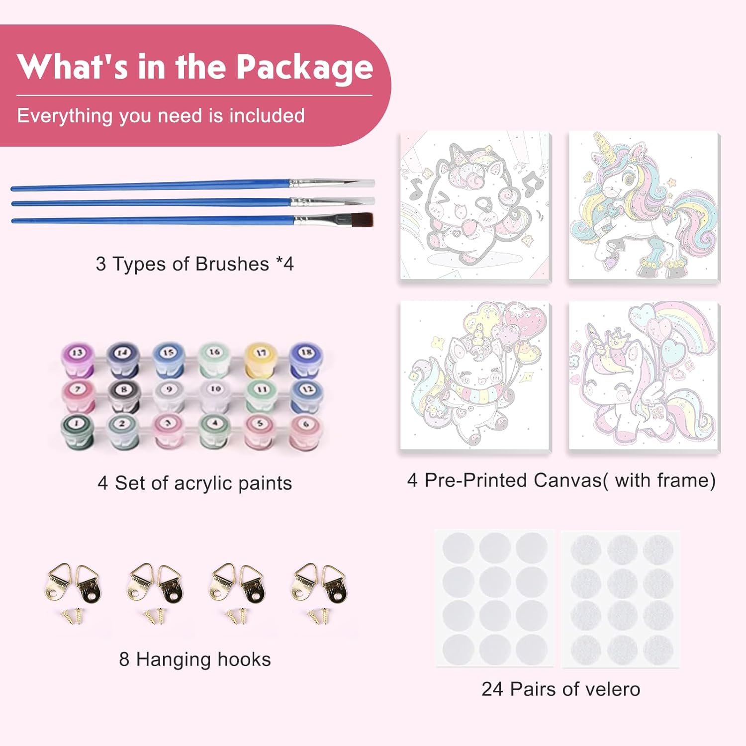 Kit di pittura con i numeri per bambini: La pittura con i numeri per bambini è una forma d’arte che utilizza pigmenti a base di olio su tela. Aiuta a migliorare le abilità pratiche, alleviare lo stress, rilassare le emozioni, dare un senso di realizzazione, aumentare la fiducia in sé stessi e sviluppare la pazienza. Facile da dipingere: Le tele DAERLE per dipingere con i numeri sono semplici da usare. Basta abbinare i numeri dei colori a quelli stampati sulla tela e riempire le aree corrispondenti seguendo le istruzioni passo dopo passo. Non sono necessarie competenze di pittura. Adatto a principianti adulti, anziani e bambini. Tela ad alta definizione: La tela di alta qualità è resistente e facile da dipingere. Le aree numerate sono chiaramente stampate e leggibili, permettendo di applicare con precisione i colori giusti nelle zone designate. Ampio utilizzo e regalo perfetto: La pittura con i numeri è il regalo ideale per amanti dell’arte, amici e familiari. Abbellisci ogni stanza con l’eleganza e la raffinatezza di un dipinto a olio, perfetto per salotto, camera da letto o ufficio. Contenuto della confezione: Il kit contiene 4 tele strutturate pre-stampate (con cornice), 4 set di colori acrilici, 12 pennelli professionali per pittura con i numeri, 8 ganci da appendere e 24 coppie di adesivi.