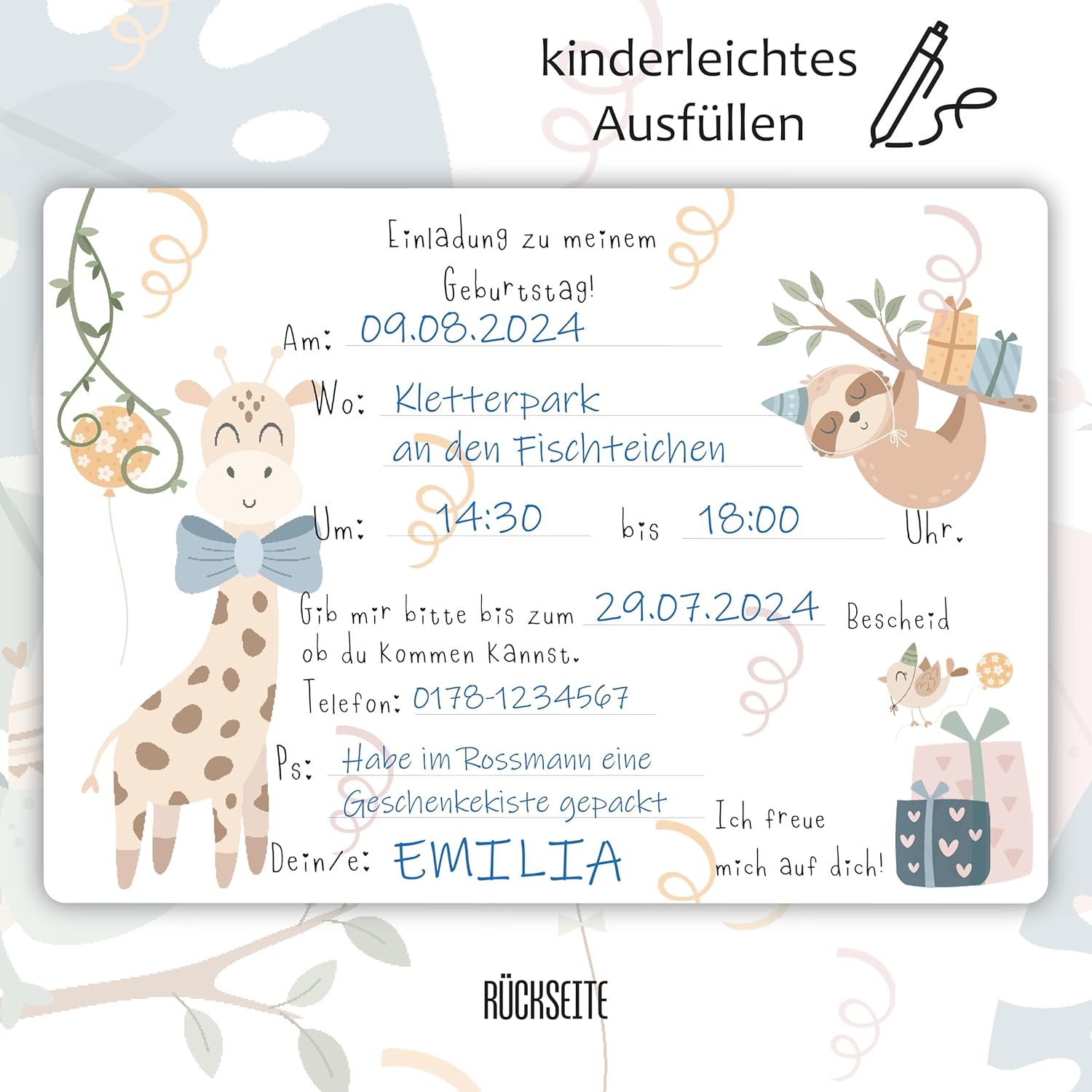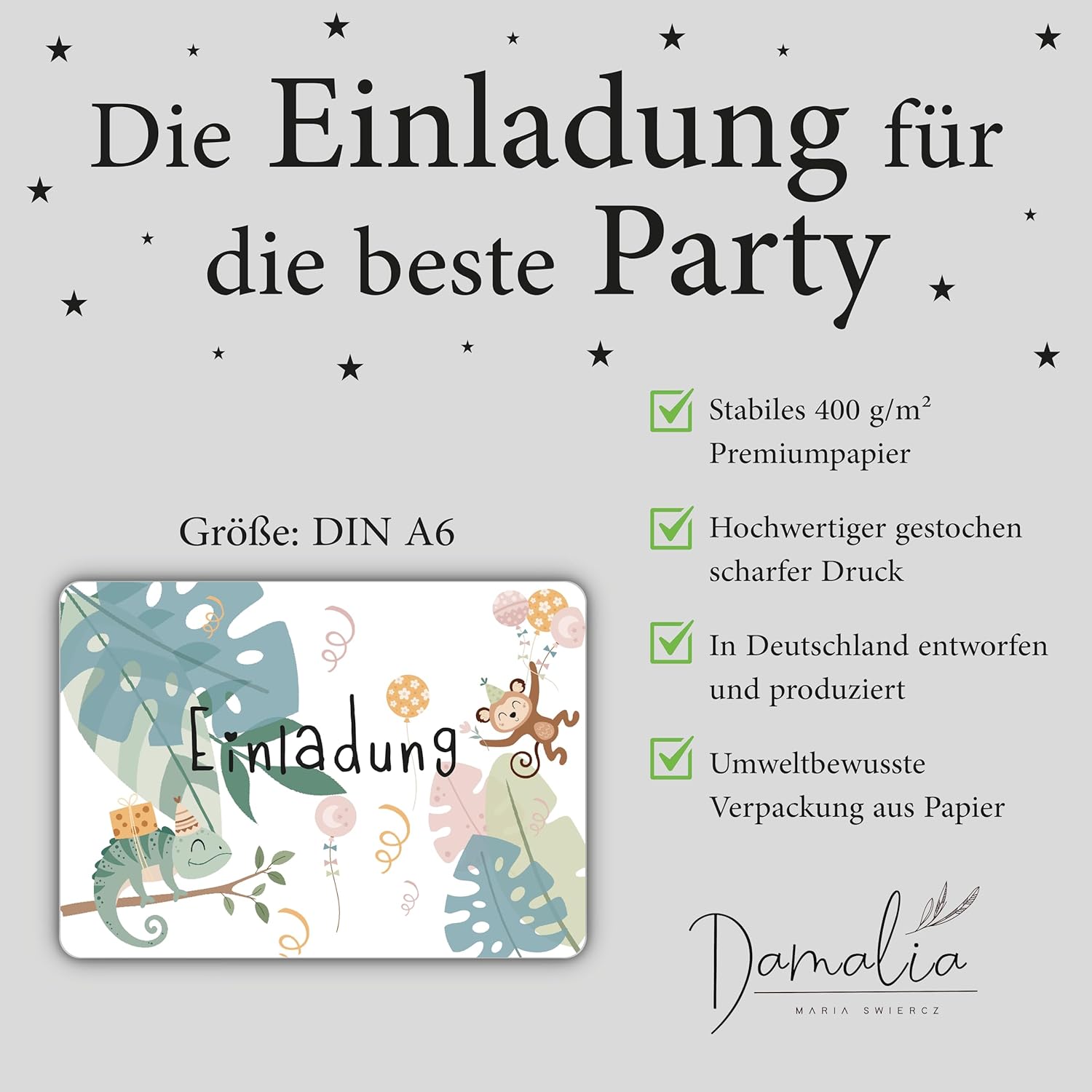 12 biglietti di invito, stampati in formato DIN A6. Tutti i nostri disegni di carte sono progettati da soli. Facile da compilare: il festeggiato può compilare facilmente i propri biglietti d'invito grazie ai campi indicati sul retro. Prodotto in Germania: i nostri biglietti d'invito sono particolarmente resistenti e di alta qualità, da 400 g/m², quindi possono essere distribuiti senza buste.