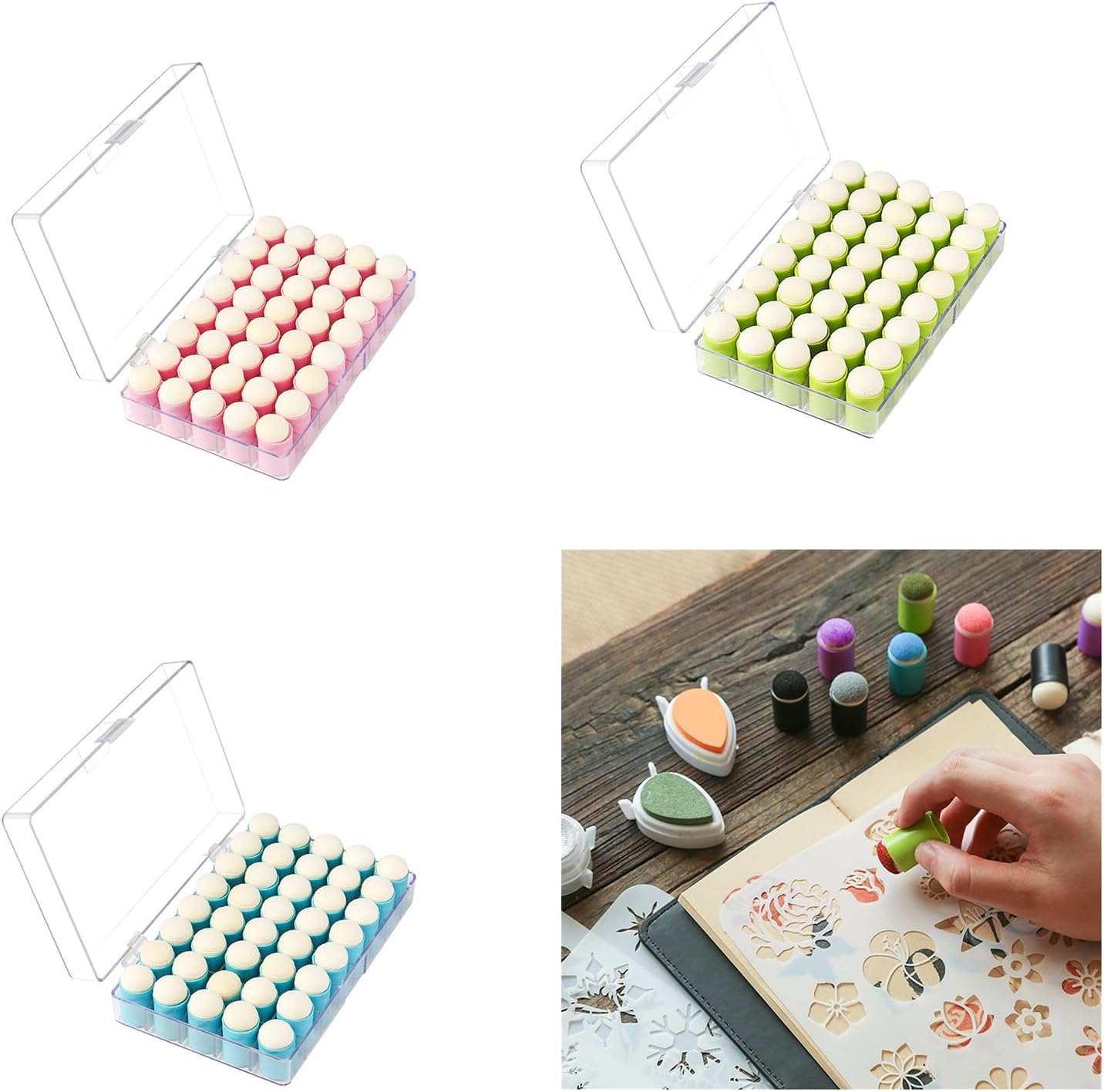 Funziona perfettamente con tamponi di inchiostro colorati, pittura ad acquerello, vernice acrilica, gouache glitterate, ecc. Perfetto per dipingere o su carta, tela, legno, tessuto, plastica e altri oggetti. La confezione contiene 40 tamponi di spugna per le dita. Spugna di qualità, sicura, non tossica, morbida, molto assorbente, facile da colorare. Con custodia trasparente, impermeabile, resistente alla polvere, compatta e portatile. Manico in plastica antiscivolo, ideale per le mani piccole. Ottimi strumenti di disegno per i bambini che imparano a dipingere precoce, sviluppare l'immaginazione e la creatività dei bambini, ecc. Ampiamente usato per feste di compleanno per bambini, feste per bambini, Halloween, Natale, feste di festival, giochi per asilo, genitori e bambini, progetti di artigianato a scuola. Ideale per pittura, biglietti di auguri fatti a mano, biglietti di auguri di festival, album di ritagli, diari, taccuini, pianificatori, calendari, album fotografici, ecc.