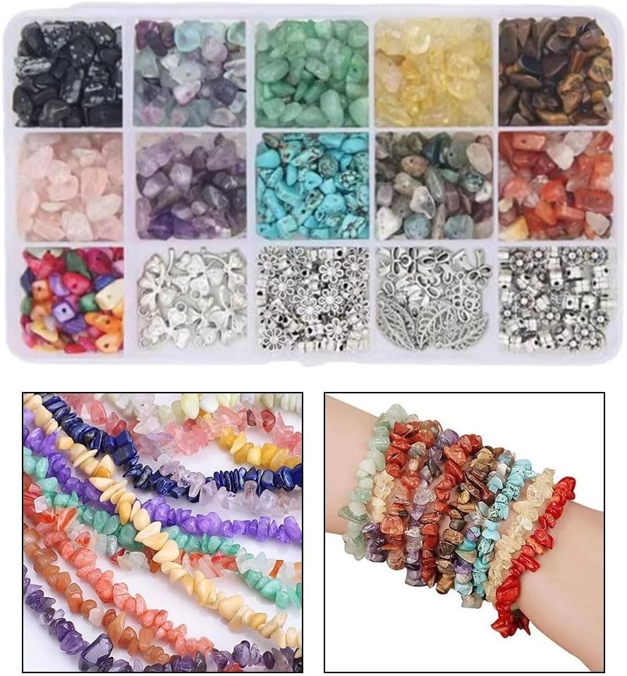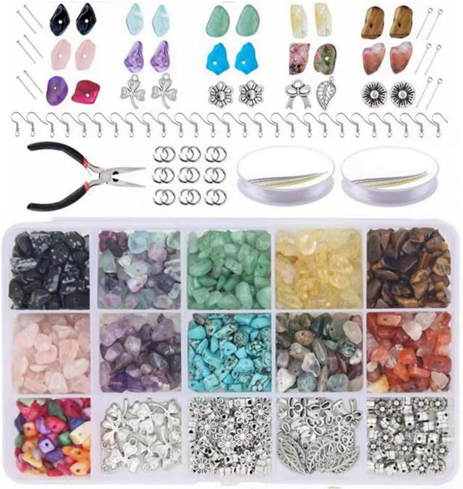 Kit versatile per la creazione di gioielli: questo set per la creazione di gioielli fai da te include 11 griglie di 40 accessori in lega di zinco, 100 ganci per orecchie, 100 aghi a fondo piatto da 22 mm, 100 aghi a forma di nove da 22 mm, 100 anelli in ferro da 6 mm, 2 corde elastiche da 8 mm, una scatola e un paio di pinze a becchi ad ago. Perline colorate e irregolari: il kit per la creazione di gioielli offre circa 660 perline in vari colori vivaci. Queste perline sono accuratamente lucidate in forme irregolari con fori da 1 mm, consentendo infinite possibilità di creare gioielli belli e unici. Infinite possibilità creative: ideale per braccialetti fai da te, collane, cavigliere, orecchini, spille, anelli, nonché alberi di gioielli e altri mestieri. Lascia correre la tua immaginazione e progetta accessori personalizzati che mettono in mostra il tuo stile. Materiale: realizzato con s e lega, resistente e lucentezza duratura per i tuoi gioielli fatti a mano. Confezione conveniente: tutti i componenti essenziali sono ordinatamente organizzati in una scatola, rendendolo facile da riporre e trasportare. Questo kit è perfetto sia per principianti che per esperti produttori di gioielli.