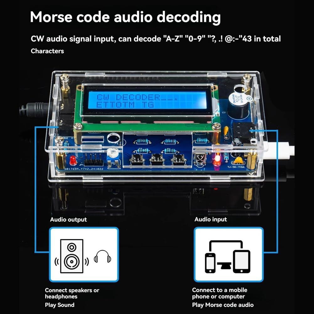 4. Regolare il tempo di ricezione del codice Morse; Funzioni: 1. Ingresso segnale audio CW; 3. Decodificare l'audio del codice Morse ricevuto in caratteri; 2. Visualizzare il codice Morse ricevuto; 5. Pulsante CW esterno per esercitarsi nell'invio del codice Morse;