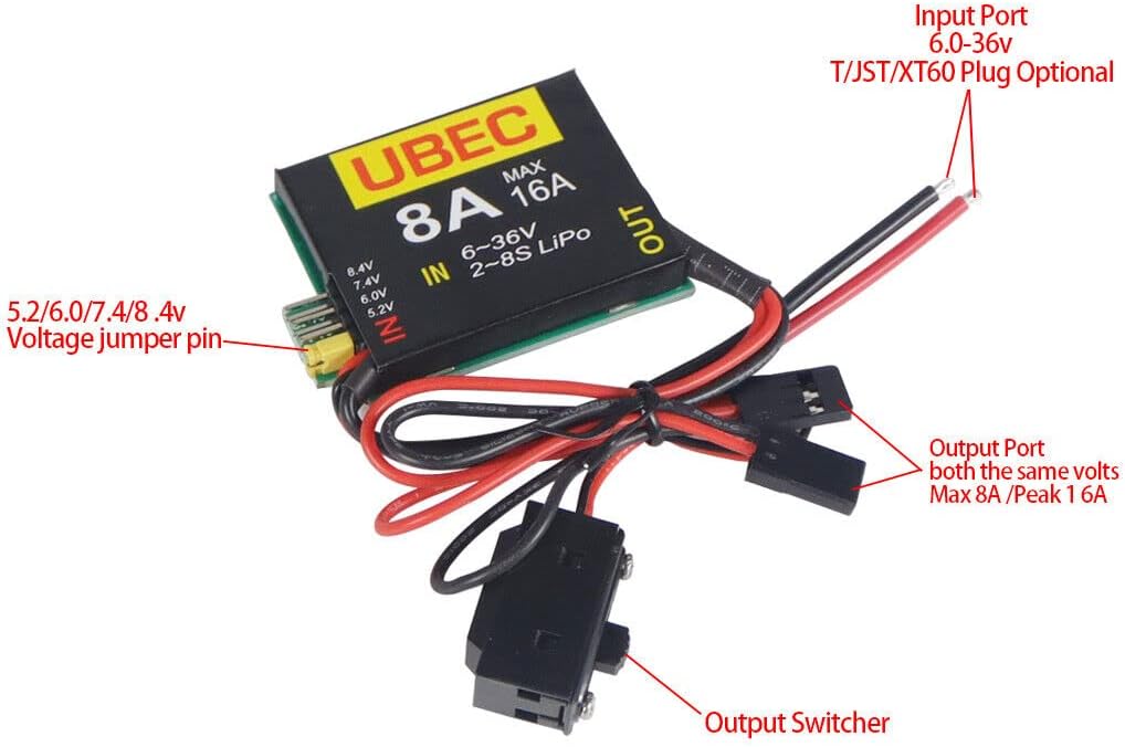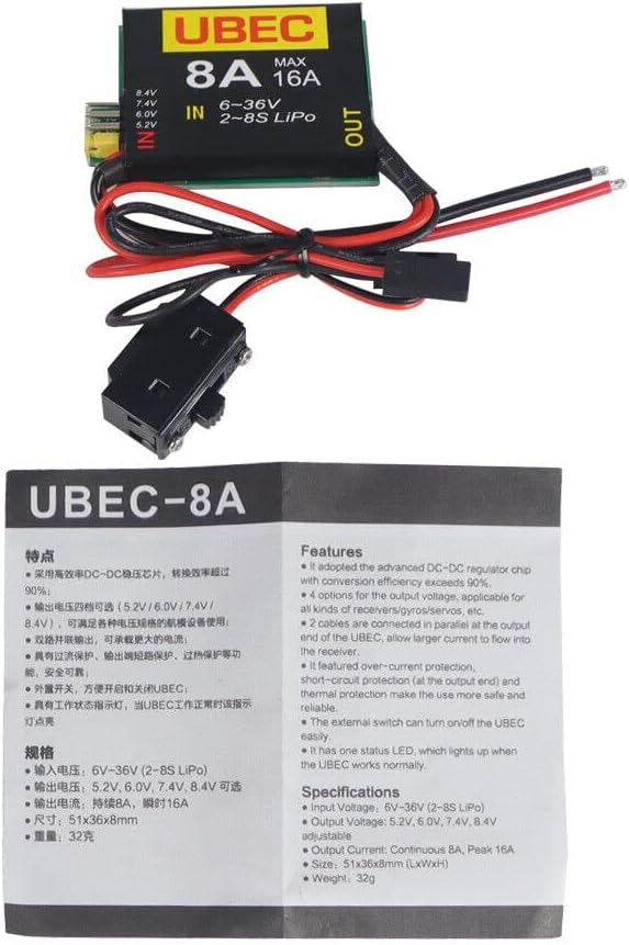 1. Facendo uso del chip del regolatore di tensione CC-CC ad alta efficienza, l'efficienza di conversione supera il 90% 2. La tensione di uscita può essere selezionata in quattro ingranaggi (5.2/6.0/7.4/8.4V), che possono soddisfare l'uso di attrezzature modello di aeromobili di varie specifiche di tensione 3. Doppia uscita parallela, può trasportare più grande corrente 4. Con protezione da sovracorrente, protezione da cortocircuito in uscita, protezione da surriscaldamento e altre funzioni, sicuro e affidabile 5. Interruttore esterno, facile da aprire e chiudere UBEC