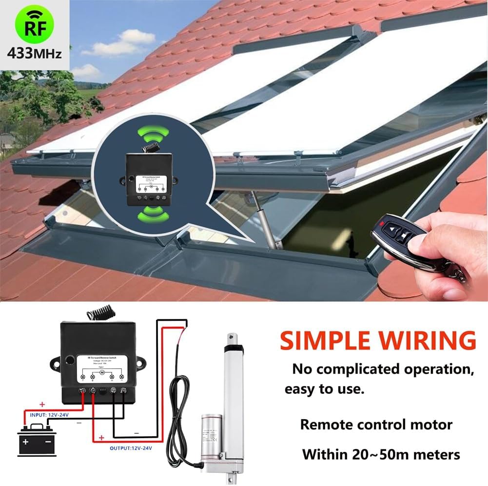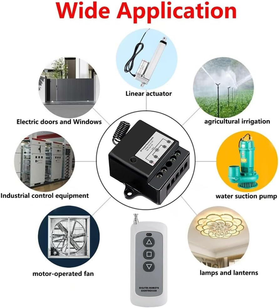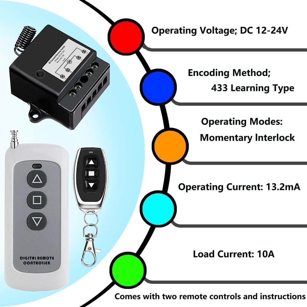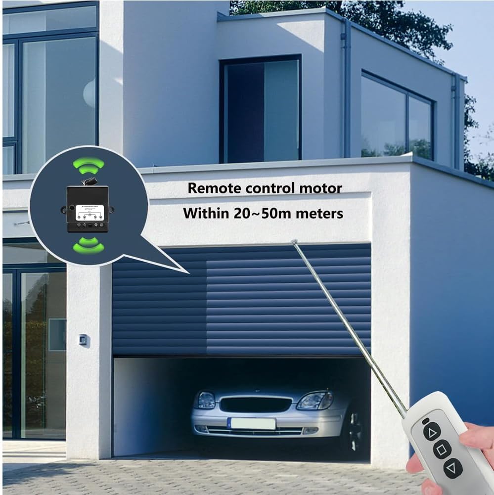 Specifiche complete: questo interruttore funziona in un intervallo di tensione da DC12V a 24V e ha una corrente di di 13,2 mA, una corrente di riposo di 13 mA e una capacità di corrente di carico di 10 A. Funziona a una frequenza di 433 MHz e ha una dimensione compatta di 42 mm x 52 mm x 25 mm, ideale per diverse installazioni. Versatile funzionalità: dotato di modalità operativa, autobloccante e (impostazione predefinita), questo mini interruttore a offre flessibilità per diverse applicazioni. È sufficiente passare da una all', a seconda delle necessità. Istruzioni dettagliate possono essere trovate nel manuale. Portata estesa del : utilizza la tecnologia wireless avanzata per un controllo ostacoli fino a 50 metri. Questo interruttore remoto garantisce un funzionamento affidabile attraverso pareti e porte, rendendolo perfetto per il controllo remoto e conveniente di vari dispositivi. Ampia applicazione: ideale per una vasta gamma di applicazioni, tra cui attuatori lineari, ed elettrodomestici. Il suo fattore di forma ridotto consente l'installazione in spazi ristretti ed è adatto per porte da garage, tende elettriche e dispositivi che richiedono il controllo direzionale.