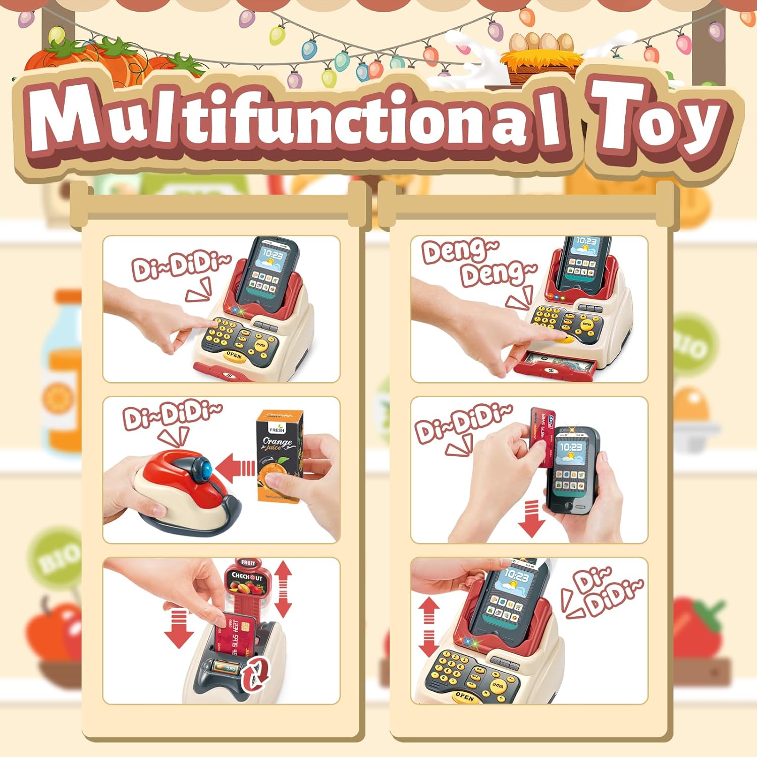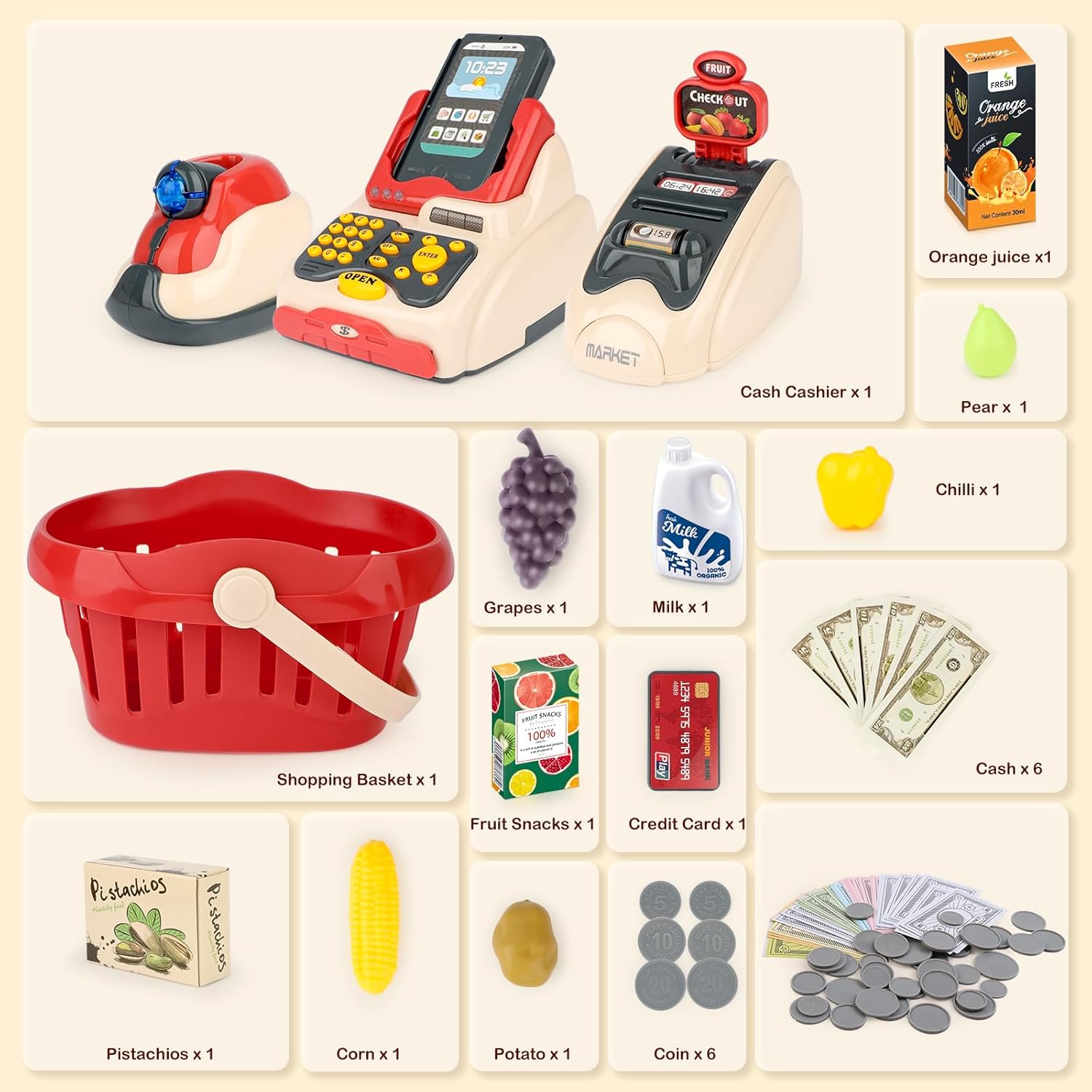 Set da gioco per registratore di cassa del supermercato: divertimento didattico per i piccoli eroi dello shopping: questo set da gioco per registratore di cassa da 24 pezzi di alta qualità delizia i piccoli venditori e clienti dai 3 anni in su! Con caratteristiche realistiche e accessori adorabili, offre ore di divertimento nei giochi di ruolo promuovendo abilità importanti. Il perfetto registratore di cassa entry-level per bambini con scanner e suono per le loro prime esperienze in negozio con tanti dettagli emozionanti. Funzioni realistiche per un autentico piacere dello shopping: il set dispone di effetti luminosi e sonori impressionanti: lo scanner riconosce tutti i prodotti forniti e il sistema vivavoce integrato rende il gioco ancora più vivace. La particolarità: grazie allo schermo rimovibile è possibile scansionare la carta bancaria allegata, proprio come fanno mamma e papà al supermercato! Registratore di cassa per bambini Importante dal punto di vista pedagogico: registratore di cassa giocattolo Imparare giocando: mentre i bambini sono impegnati a scansionare e incassare merci, allenano anche le loro abilità aritmetiche, linguistiche e la coordinazione occhio-mano. Il gioco di ruolo creativo promuove anche l'immaginazione e l'intelligenza sociale: un giocattolo didattico ideale per i bambini in età prescolare! Set completo per scene di shopping realistiche