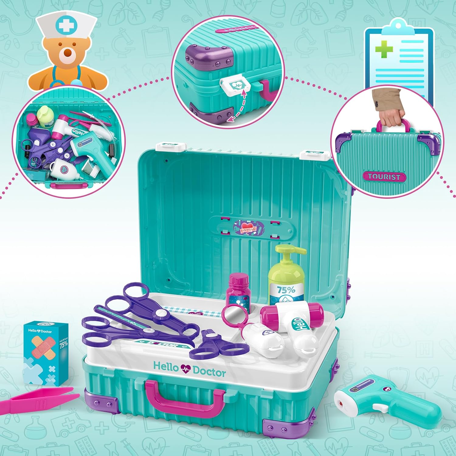 Set di giocattoli medici portatili: Migliorate il gioco del vostro bambino con il nostro kit di strumenti da medico per bambini. La scatola dei giocattoli del dottore portatile è facile da trasportare e trasforma ogni stanza in un potenziale ambulatorio. Questo set da gioco per medici include set realistici per flebo, termometri, torce elettriche, specchi orali, radiografie e altro ancora, perfetti per il gioco immaginativo e l'apprendimento. Autentico gioco di ruolo medico: date al vostro bambino l'opportunità di giocare al dottore con il nostro set di gioco medico progettato per bambini dai 3 anni in su. Con accessori dettagliati per il gioco di ruolo del medico, come pinzette di plastica, termometri e cerotti, lo studio medico prende vita, favorendo il gioco immaginativo e l'esplorazione educativa. Esperienza di apprendimento interattiva: Il nostro set di giocattoli medici interattivi è stato progettato per gli strumenti medici dei bambini, stimolando il pensiero del bambino. Il set comprende vari strumenti medici giocattolo per aiutarli a capire il ruolo del medico, promuovendo le capacità cognitive e l'interazione sociale attraverso il gioco di ruolo. Design resistente e portatile: I nostri giocattoli medico per bambini sono progettati per durare e facilitare l'uso, in grado di sopportare innumerevoli ore di gioco. Il carrello portatile permette ai bambini di spostare l'ambulatorio ovunque desiderino. Il regalo perfetto per i futuri medici: Il nostro set di giocattoli medici è il regalo ideale per compleanni, Natale o qualsiasi altra ricorrenza, aggiungendo un tocco speciale a ogni occasione. Questo set medico aggiunge un tocco di realismo agli scenari di gioco di ruolo, rendendoli educativi e divertenti.