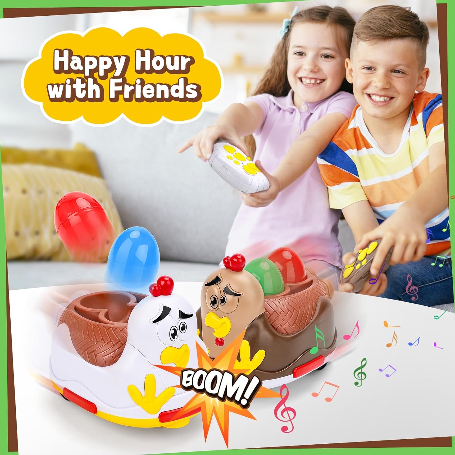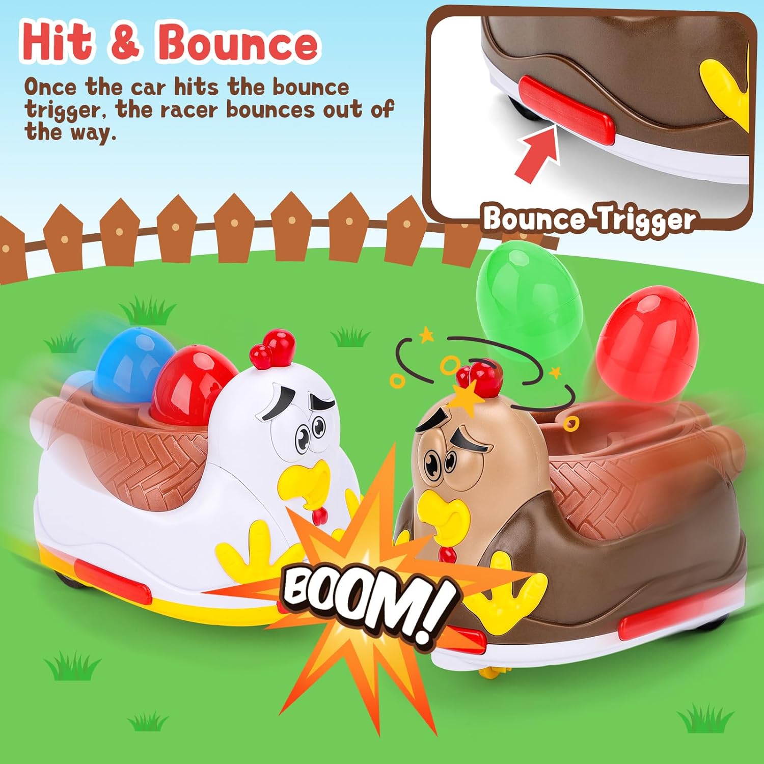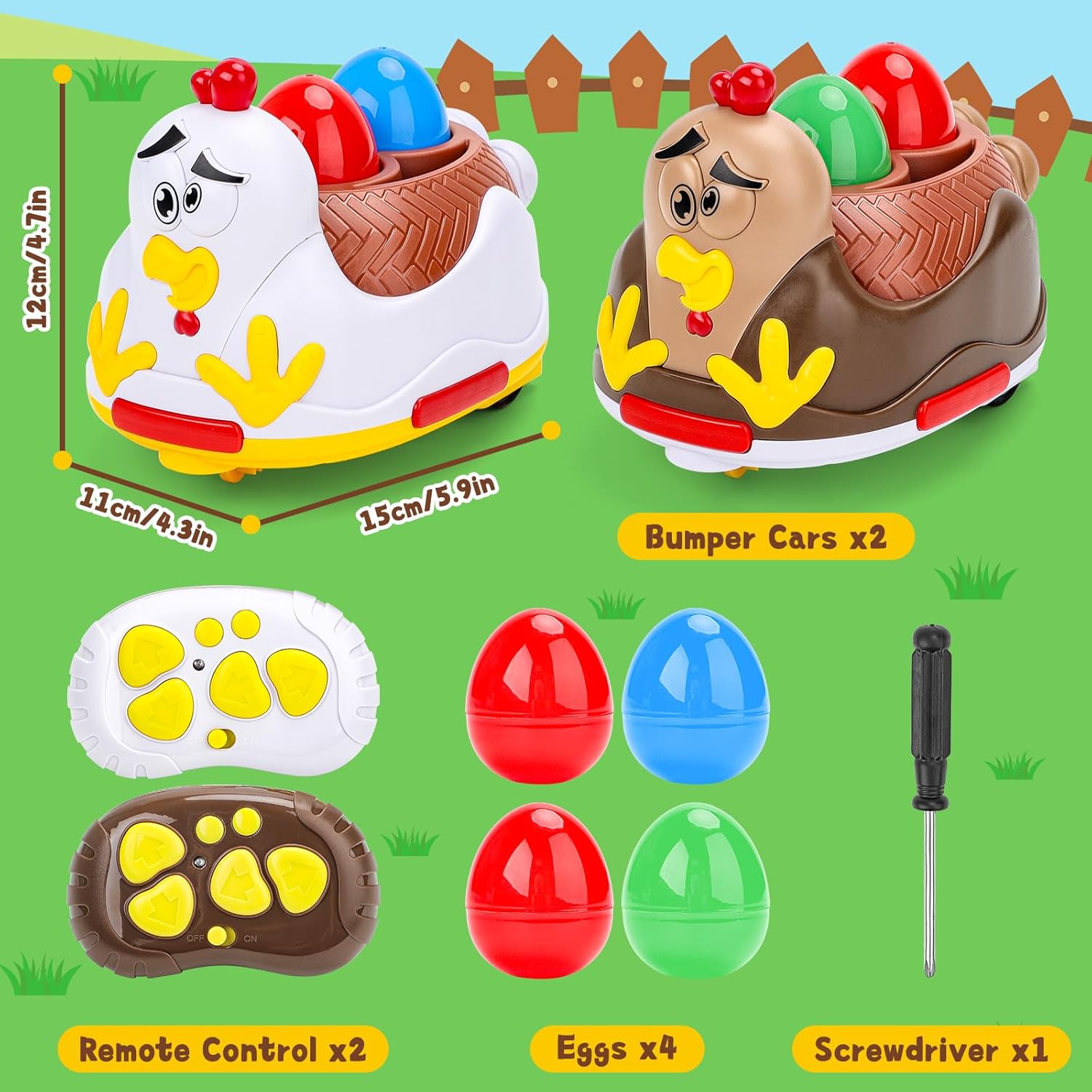 Set di Autoscontri Telecomandati: Include 2 auto telecomandate, 4 uova e 2 telecomandi, che consentono ai bambini di partecipare a emozionanti battaglie e gare con amici o familiari. Utilizzate i telecomandi per gareggiare e scontrarvi tra voi fino a quando le uova non vengono espulse. NOTA: i pulsanti di espulsione delle uova si trovano su entrambi i lati delle auto. Controllo Facile e Veloce: Le auto telecomandate possono essere azionate a distanza senza interferire tra loro. Il telecomando è dotato di pulsanti per il movimento in avanti, indietro, a sinistra e a destra, consentendo ai bambini di controllarle in modo indipendente. Le auto possono ruotare di 360 gradi. L'auto richiede 3 batterie AA (non incluse), il telecomando richiede 2 batterie AAA (non incluse). Emozionante Difesa Delle Uova: L'auto emette realistici versi di gallina, immergendo i giocatori nell'azione di gara per proteggere le uova. Naturalmente, il suono può essere disattivato tramite il pulsante del telecomando per un gioco più silenzioso. Questo lo rende la scelta perfetta sia per un gioco emozionante che rilassante. Creare Sorprese: Quattro uova sono vuote, consentendo di aprire i gusci e riempirli con piccoli regali o premi di gara. Durante il gioco, le uova saltano fuori e cadono mentre i gusci si aprono, creando piacevoli sorprese per entrambi i giocatori. Costruzione Resistente: L'auto telecomandata presenta un design robusto che garantisce resistenza agli urti e longevità. I suoi affascinanti personaggi dei cartoni animati, la gallina e l'uovo, i colori vivaci e gli effetti sonori aiutano lo sviluppo della percezione dei colori e dell'udito dei bambini. Un regalo ideale per compleanni, festa dei bambini, Natale, Pasqua, Halloween o feste.