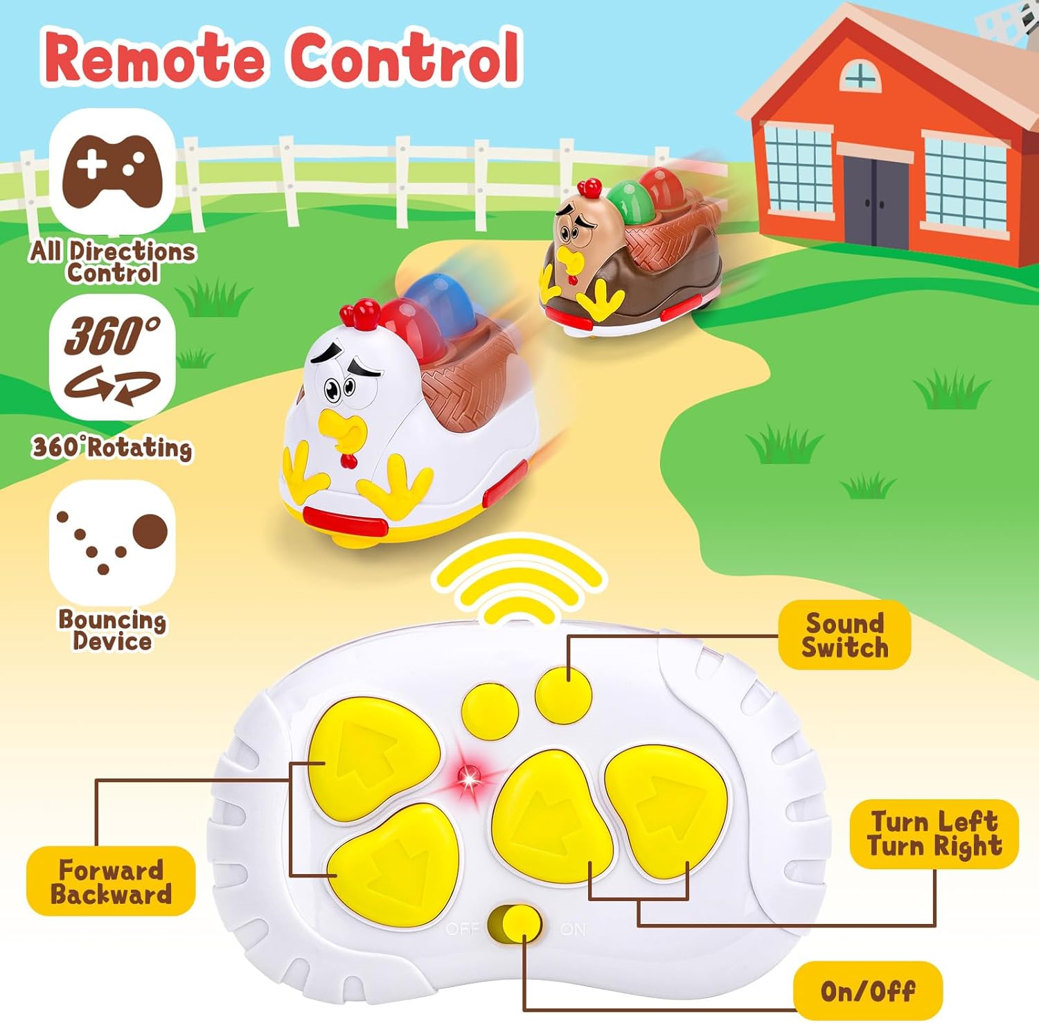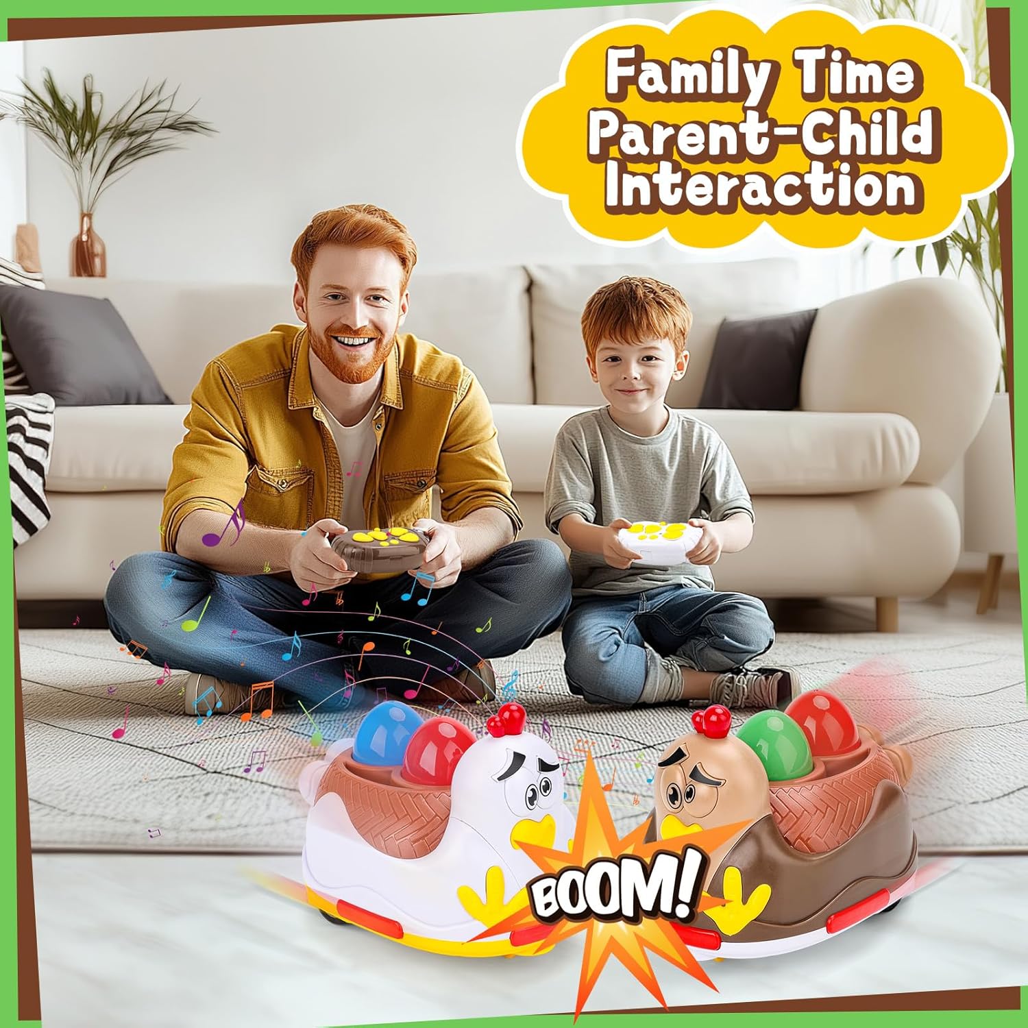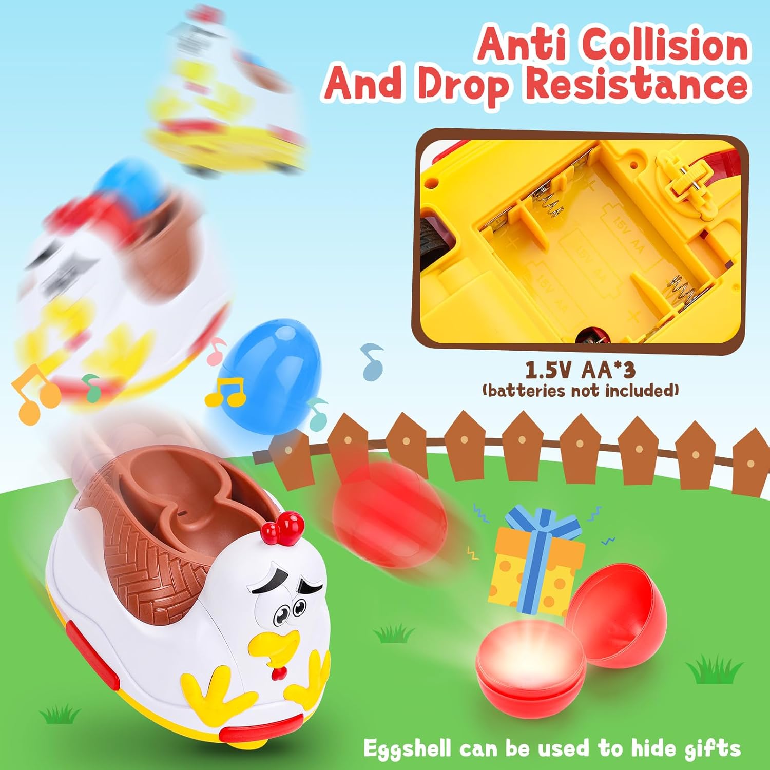 Set di Autoscontri Telecomandati: Include 2 auto telecomandate, 4 uova e 2 telecomandi, che consentono ai bambini di partecipare a emozionanti battaglie e gare con amici o familiari. Utilizzate i telecomandi per gareggiare e scontrarvi tra voi fino a quando le uova non vengono espulse. NOTA: i pulsanti di espulsione delle uova si trovano su entrambi i lati delle auto. Controllo Facile e Veloce: Le auto telecomandate possono essere azionate a distanza senza interferire tra loro. Il telecomando è dotato di pulsanti per il movimento in avanti, indietro, a sinistra e a destra, consentendo ai bambini di controllarle in modo indipendente. Le auto possono ruotare di 360 gradi. L'auto richiede 3 batterie AA (non incluse), il telecomando richiede 2 batterie AAA (non incluse). Emozionante Difesa Delle Uova: L'auto emette realistici versi di gallina, immergendo i giocatori nell'azione di gara per proteggere le uova. Naturalmente, il suono può essere disattivato tramite il pulsante del telecomando per un gioco più silenzioso. Questo lo rende la scelta perfetta sia per un gioco emozionante che rilassante. Creare Sorprese: Quattro uova sono vuote, consentendo di aprire i gusci e riempirli con piccoli regali o premi di gara. Durante il gioco, le uova saltano fuori e cadono mentre i gusci si aprono, creando piacevoli sorprese per entrambi i giocatori. Costruzione Resistente: L'auto telecomandata presenta un design robusto che garantisce resistenza agli urti e longevità. I suoi affascinanti personaggi dei cartoni animati, la gallina e l'uovo, i colori vivaci e gli effetti sonori aiutano lo sviluppo della percezione dei colori e dell'udito dei bambini. Un regalo ideale per compleanni, festa dei bambini, Natale, Pasqua, Halloween o feste.