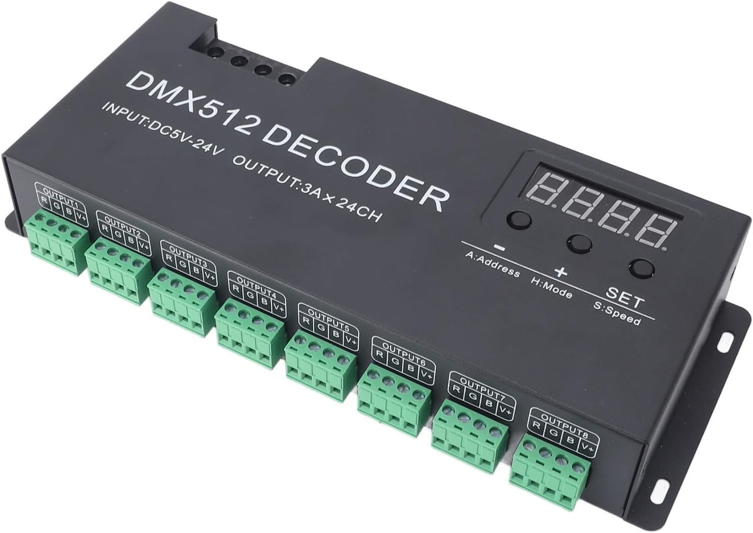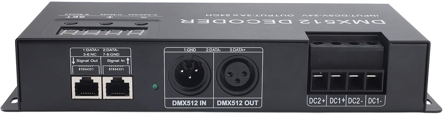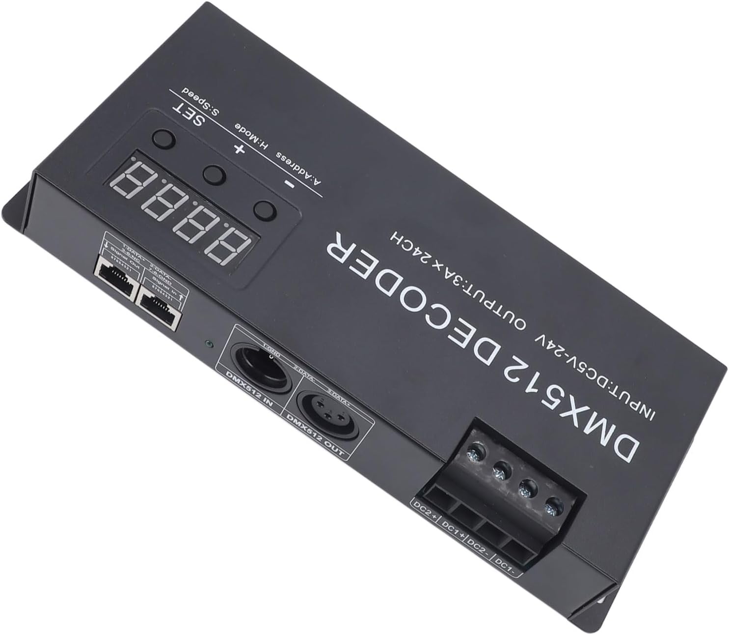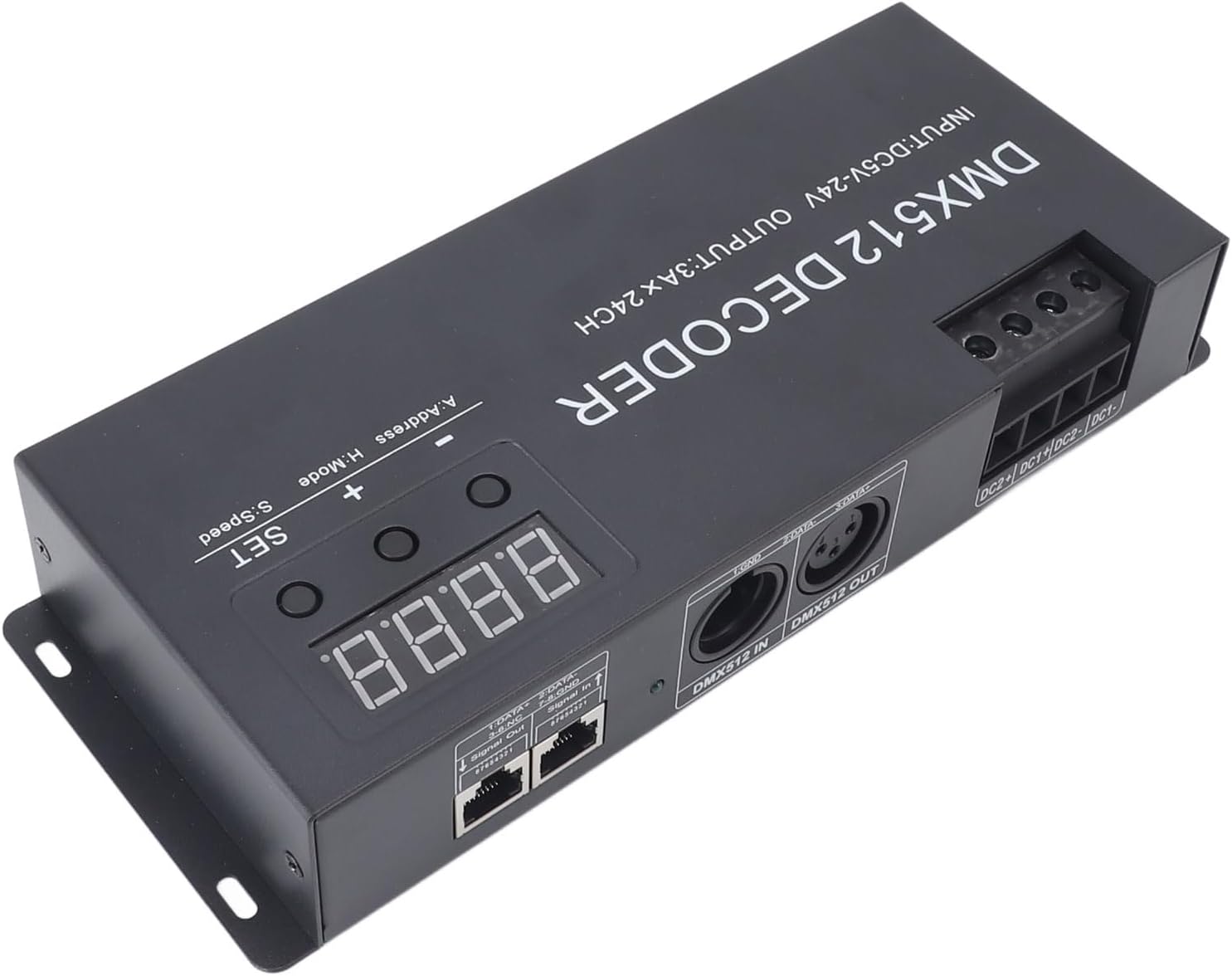 [Controllo 512 avanzato] Questo decodificatore presenta un chip di controllo del computer avanzato che converte perfettamente i segnali digitali standard 512 in segnali controller PWM per guidare le luci a LED. L'ingegneria di precisione garantisce transizioni di colore fluide e vibranti, rendendolo ideale per le configurazioni di illuminazione professionale. Sperimenta una sincronizzazione impeccabile e prestazioni superiori con questa soluzione ad alta tecnologia. [Output del canale espandibile] Collegare questo decodificatore a 24 canali con una console digitale per espandere i canali di output senza sforzo. Ottieni effetti di oscuramento intricati e modifiche dinamiche del programma per installazioni su larga scala. Il design scalabile consente l'integrazione senza soluzione di continuità con più decodificatori, offrendo infinite possibilità creative per i tuoi progetti di illuminazione. [Controller a doppia funzione] Quando non è collegato a una console , questo decodificatore funge da un potente controller di sincronizzazione. Può gestire contemporaneamente più decodificatori e luci a LED, garantendo effetti di illuminazione uniformi attraverso l'installazione. per eventi e installazioni in cui il controllo dell'illuminazione costante è cruciale. [Display digitale intuitivo] dotato di un tubo digitale LED luminoso, questo decodificatore 512 visualizza chiaramente il codice dell'indirizzo per una facile configurazione. I controlli dei pulsanti intuitivi consentono di aumentare o ridurre le regolazioni rapide, rendendo il funzionamento flessibile e senza problemi. Il display chiaro garantisce un monitoraggio e una personalizzazione senza sforzo. [Applicazione versatile] Progettato per progetti ed eventi di decorazione esterna a LED su larga scala, questo decodificatore a 24 canali offre effetti di sbiadimento e lisciatura perfetti. Migliora la ricchezza dei colori a LED e crea splendidi display visivi con questo controller affidabile e ad alte prestazioni. Ideale per progettisti di illuminazione professionistica e organizzatori di eventi.