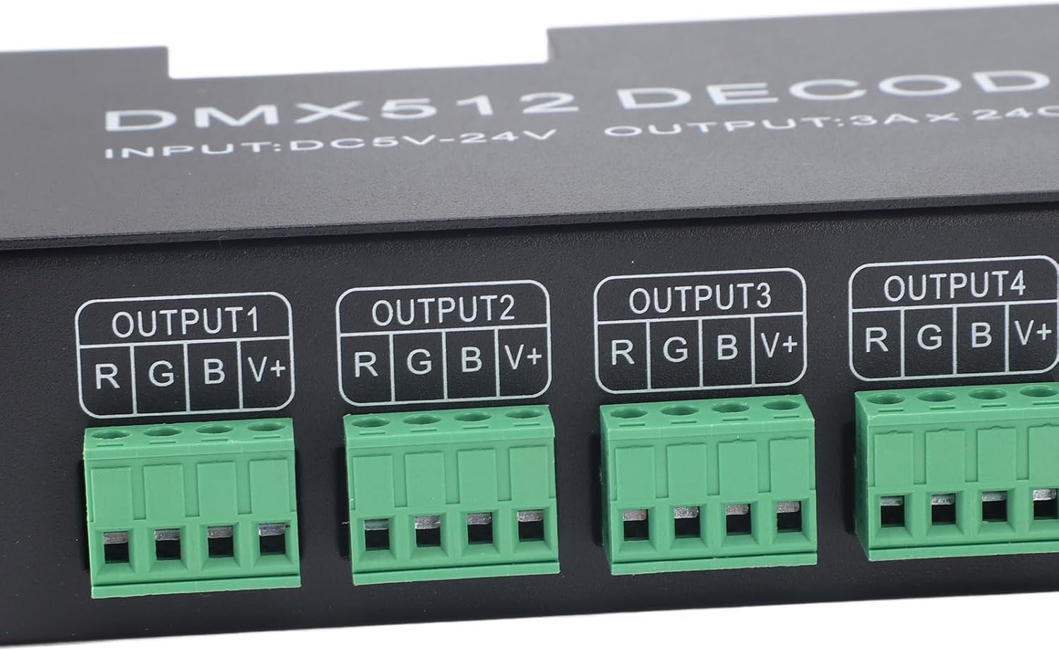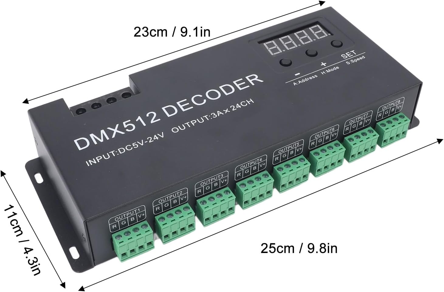il decodificatore adotta chip di controllo computerizzato avanzato per ricevere il segnale di controllo digitale standard 512 ampiamente utilizzato a livello internazionale nel segnale del controller PWM per pilotare il LED. Funzione controller: quando il decoder non è collegato alla console , questa macchina può essere utilizzata come controller di sincronizzazione, che può essere utilizzata per sincronizzare il controllo di più decoder e luci LED. Applicazione: il decoder 24CH è ampiamente utilizzato in progetti e attività di decorazione esterna a LED di grandi dimensioni. effetto sbiadito e levigante, rendendo il colore del LED più ricco. Connessione estesa: può essere collegato alla console digitale e può aumentare il decoder per espandere continuamente il canale di uscita, al fine di ottenere una maggiore attenuazione o una varietà di effetti di programma. Display digitale: il decodificatore adotta tubo digitale LED per visualizzare il codice 'indirizzo e premere il tasto per impostare l'aumento o la diminuzione 'indirizzo, il che rende l'operazione flessibile e conveniente e il display è facile da vedere e comprendere.