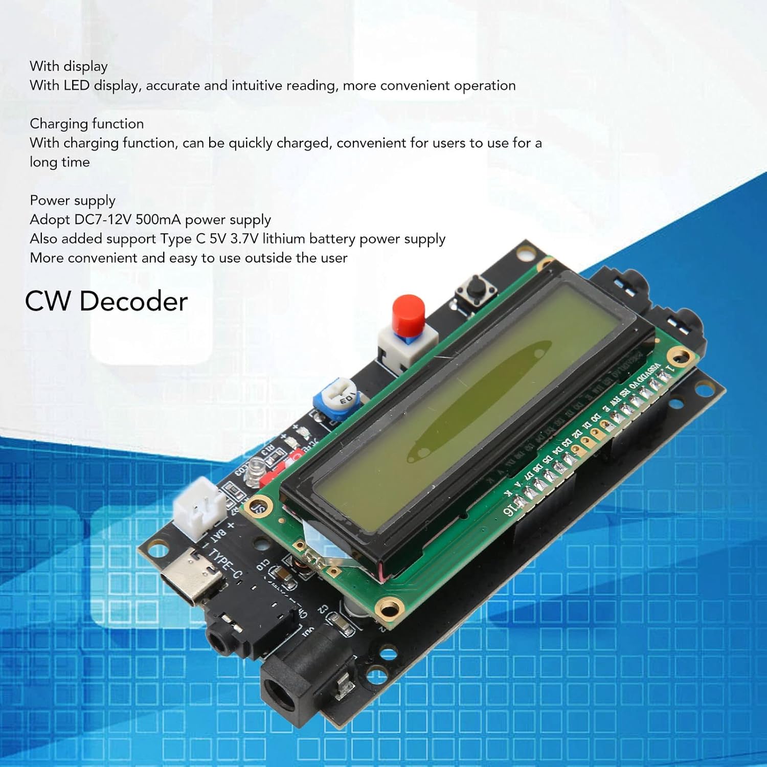 FUNZIONE DI RICARICA: il decoder CW è dotato di una funzione di ricarica, che può essere caricata rapidamente ed è conveniente per gli utenti da utilizzare a lungo. CON DISPLAY: decoder CW essenziale per radioamatori con display a LED, lettura accurata e intuitiva, funzionamento più conveniente. PICCOLO E PORTATILE: decodificatore di codice Morse di piccole dimensioni e leggero, non occupa spazio, facile da trasportare e utilizzare, adatto per esterni. STRUMENTO PRATICO: il traduttore del lettore di codice Morse è strumento molto pratico che può aiutare gli appassionati di radioamatori a imparare e utilizzare meglio il codice Morse. ALIMENTAZIONE: il lettore di codice Morse utilizza l'alimentazione DC7‑12V 500mA e aggiunge anche il supporto per l'alimentazione della batteria al litio di tipo C 5V 3,7V.