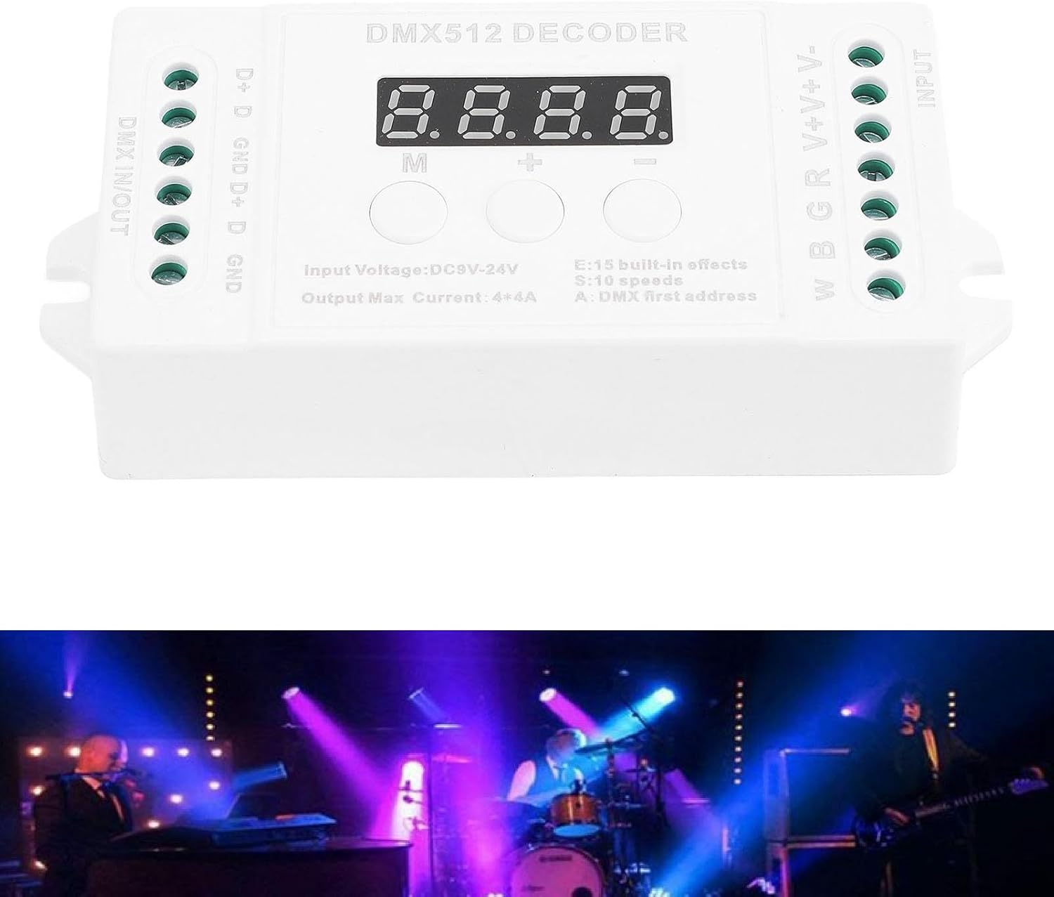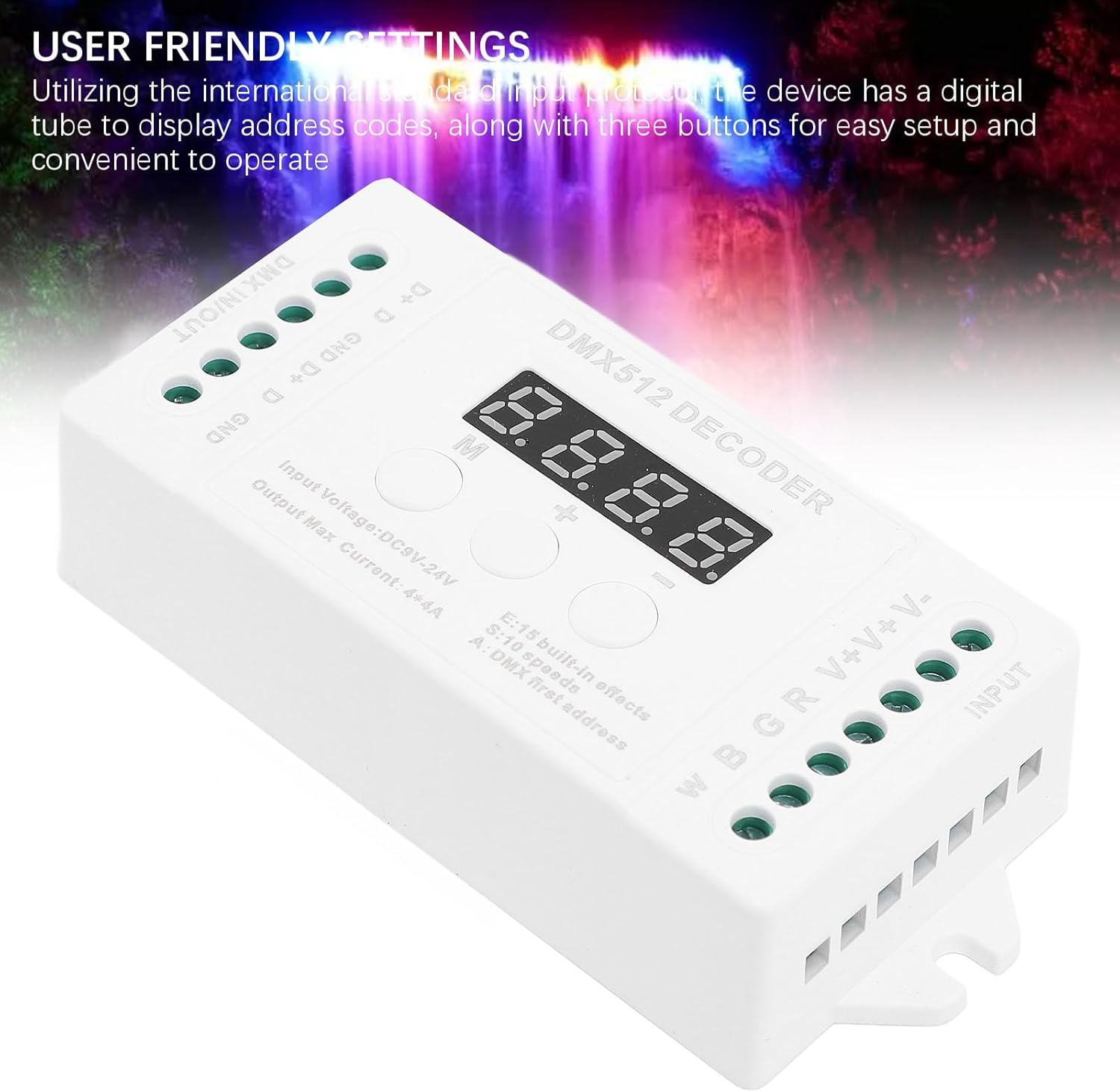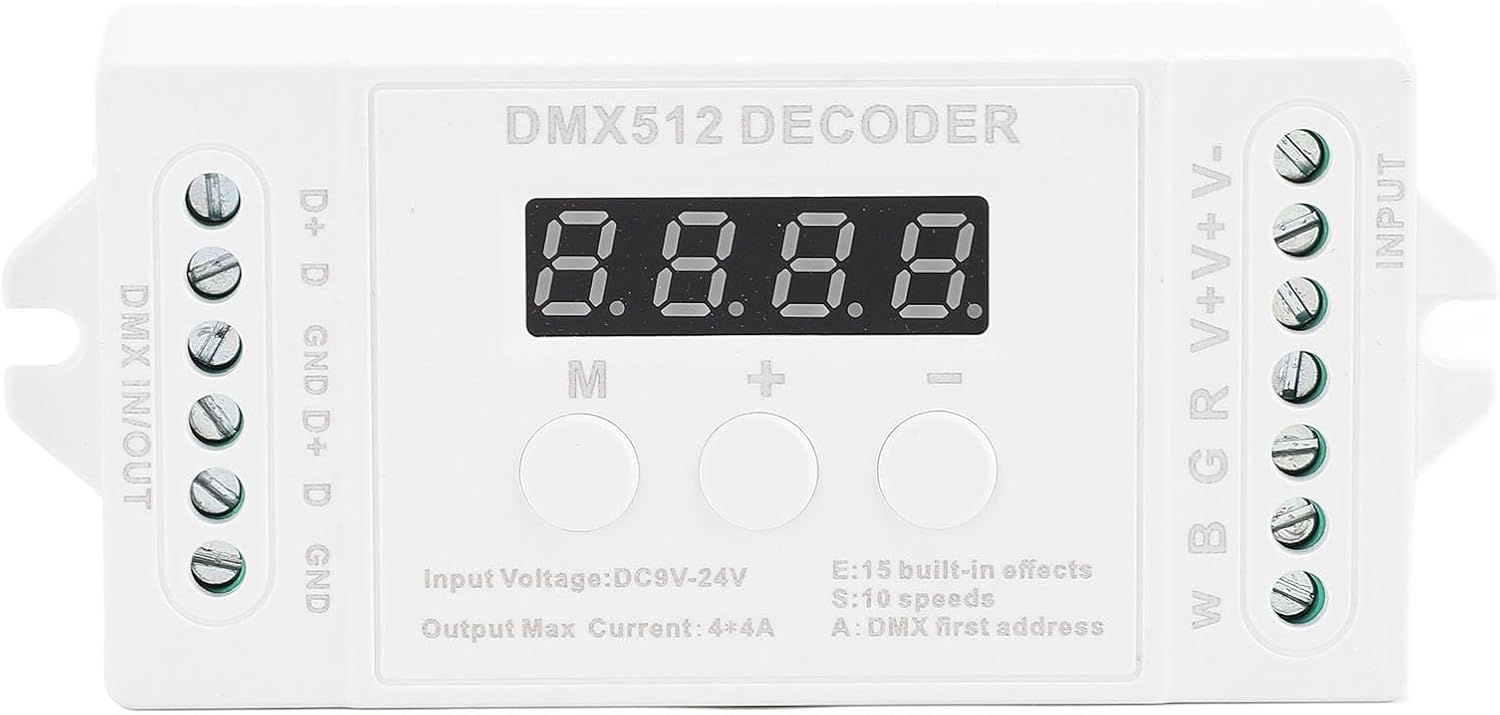[Uscita flessibile a 4 canali] - Collegare più strisce luminose a LED per diverse disposizioni di illuminazione [Controllo premium -stupido] - attenuazione regolare da 0 a 256 scala di grigi per canale [Effetti di illuminazione animati] - 15 effetti costruiti e 8 modalità dinamiche per schermi di illuminazione dinamica [Design amico dell'utente] - Display digitale del tubo per codici di indirizzo, configurazione facile con tre tasti [Supporto per prestazioni massime] - Intervallo di tensione di ingresso DC9V -DC24V, uscita fino a 192W (12V) / 384W (24V)