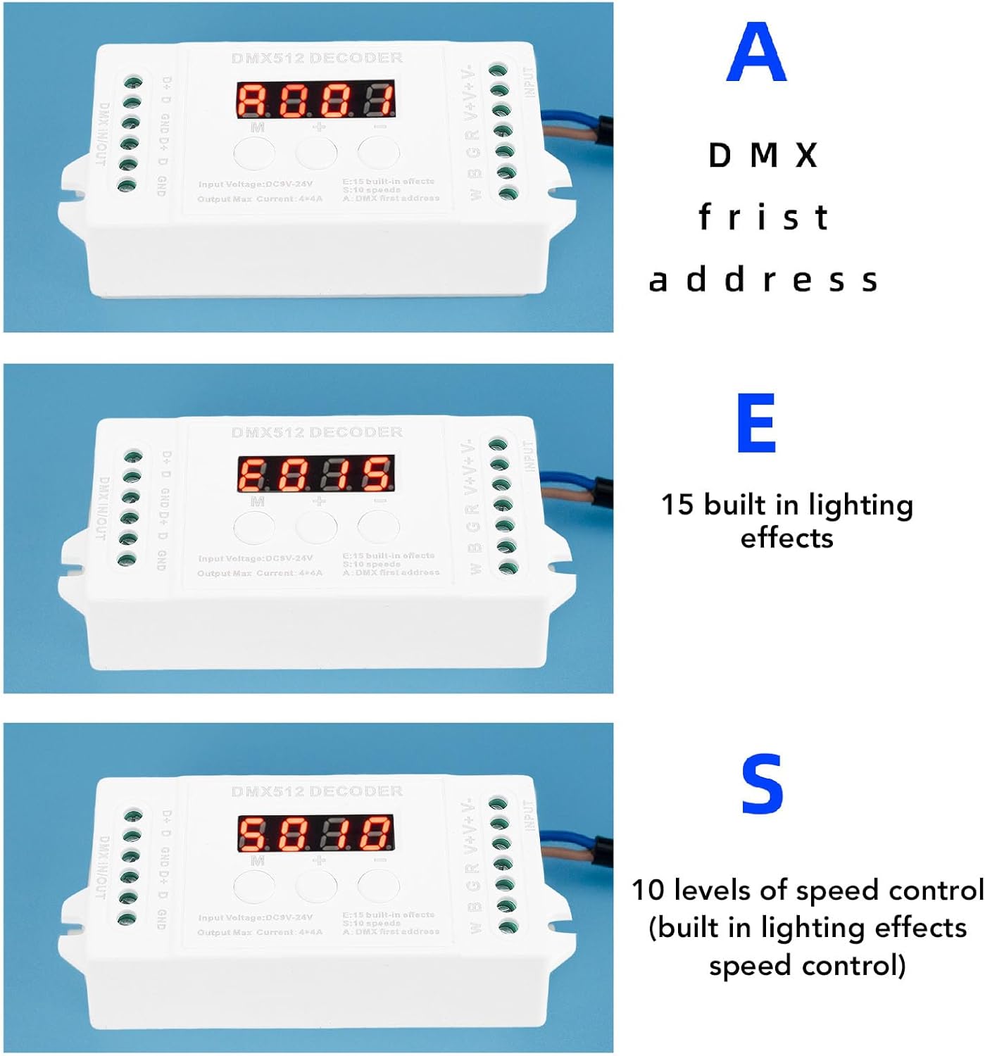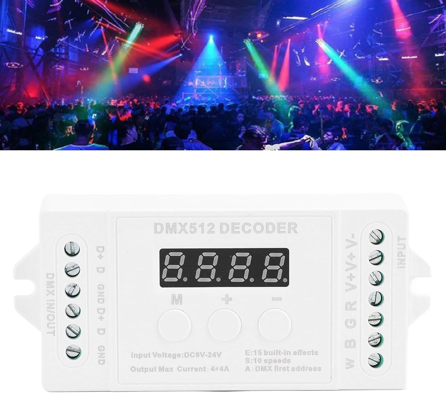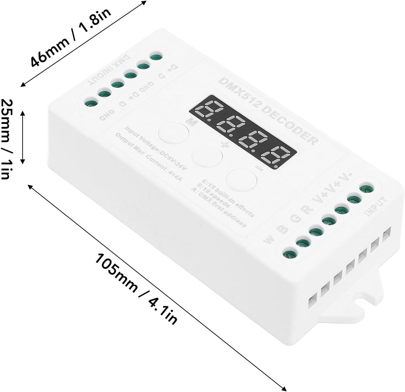 [Uscita flessibile a 4 canali] - Collegare più strisce luminose a LED per diverse disposizioni di illuminazione [Controllo premium -stupido] - attenuazione regolare da 0 a 256 scala di grigi per canale [Effetti di illuminazione animati] - 15 effetti costruiti e 8 modalità dinamiche per schermi di illuminazione dinamica [Design amico dell'utente] - Display digitale del tubo per codici di indirizzo, configurazione facile con tre tasti [Supporto per prestazioni massime] - Intervallo di tensione di ingresso DC9V -DC24V, uscita fino a 192W (12V) / 384W (24V)