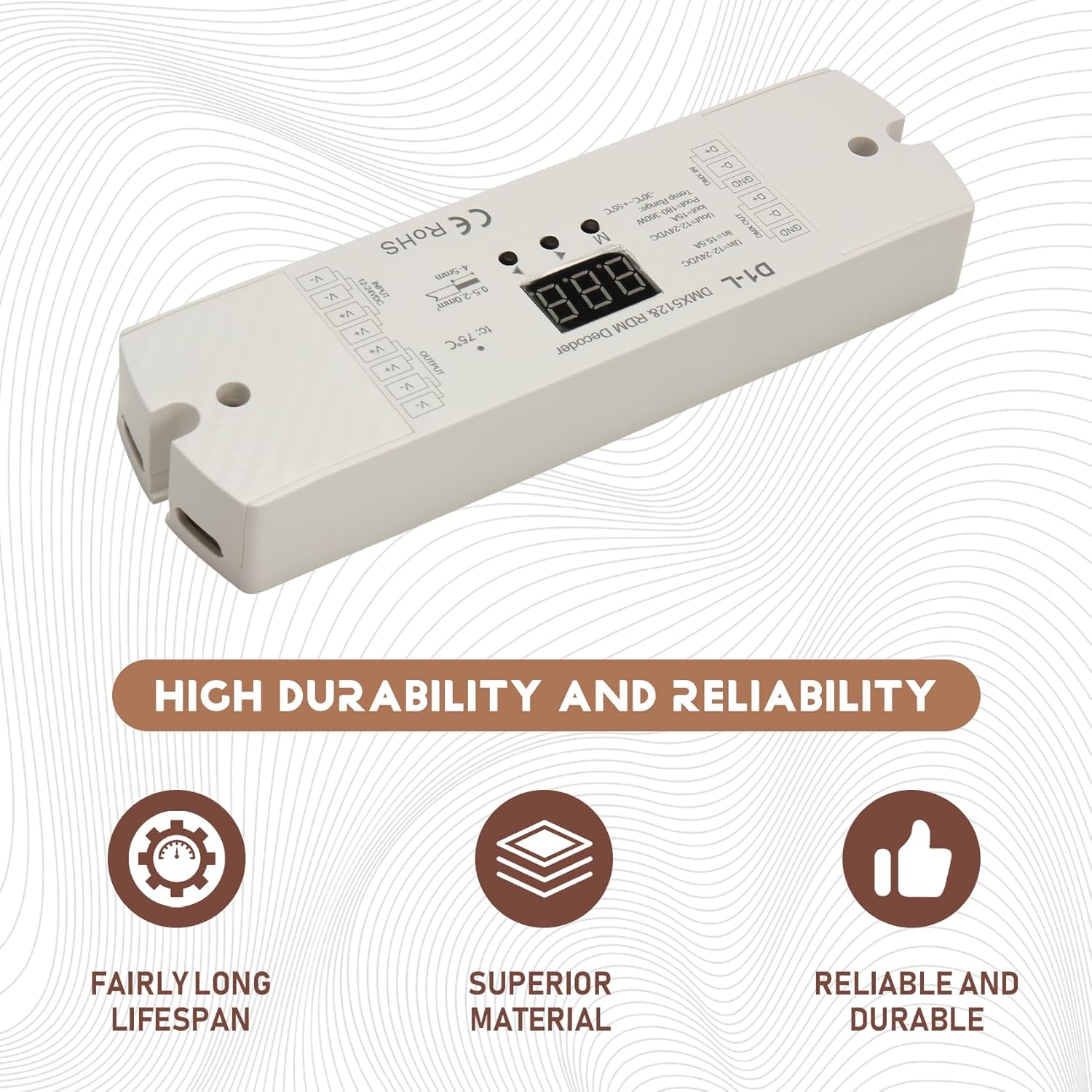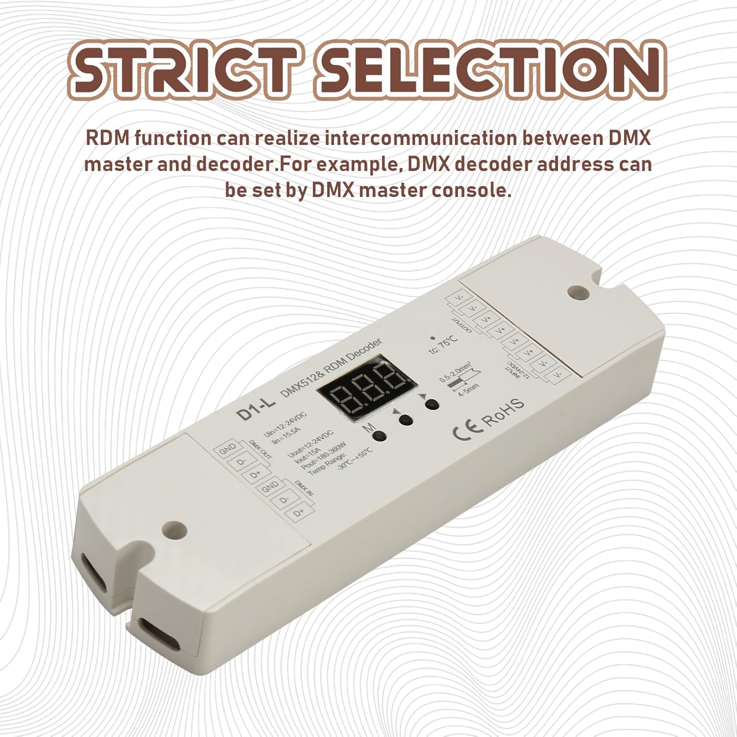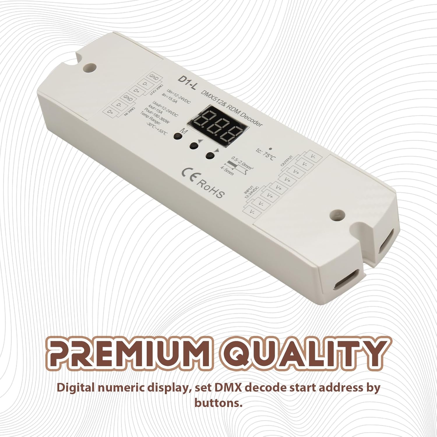 2. Display numerico digitale, imposta l'indirizzo di avvio della decodifica tramite pulsanti. 3. La funzione RDM può realizzare l'intercomunicazione tra il master e il decoder. Ad esempio, l'indirizzo del decoder può essere impostato console master . 1. Rispettare i protocolli standard DMX512. 4. Protezione da surriscaldamento/sovraccarico/cortocircuito, ripristino automatico.