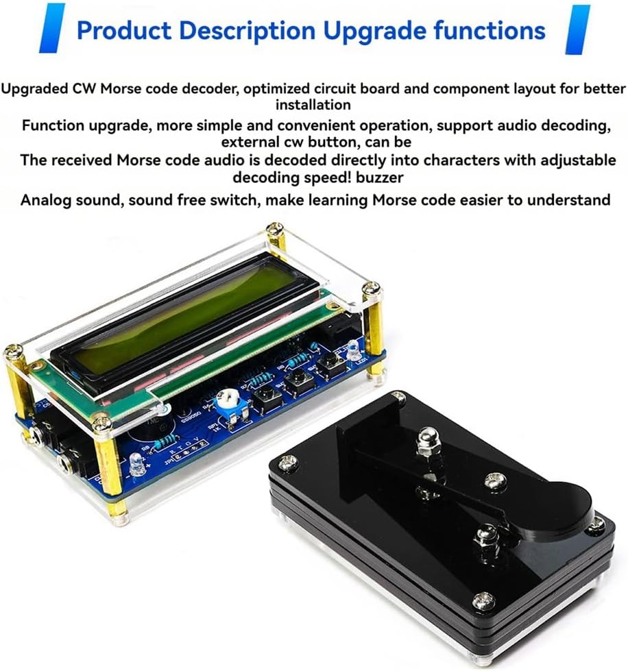 Le parti DIY devono essere saldate e assemblate da soli e sono necessari strumenti di saldatura. Aggiornamento delle funzioni, funzionamento più semplice e conveniente, supporto della decodifica Audio, pulsante CW esterno, possibilità di decodificare direttamente l'Audio del codice Morse ricevuto in caratteri, velocità di decodifica regolabile, cicalino. Decoder codice Morse CW aggiornato, circuito stampato e layout dei componenti ottimizzati, migliore installazione. Suono simulato, interruttore Audio gratuito, per facilitare la comprensione 'apprendimento del codice Morse.