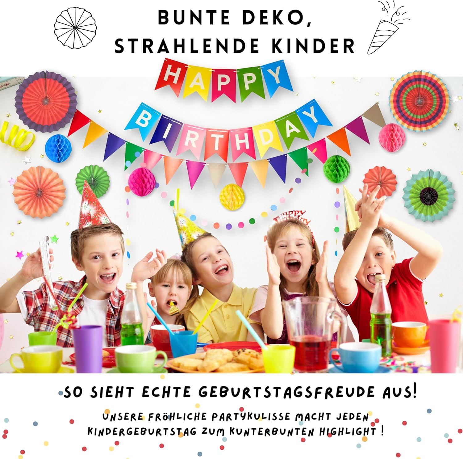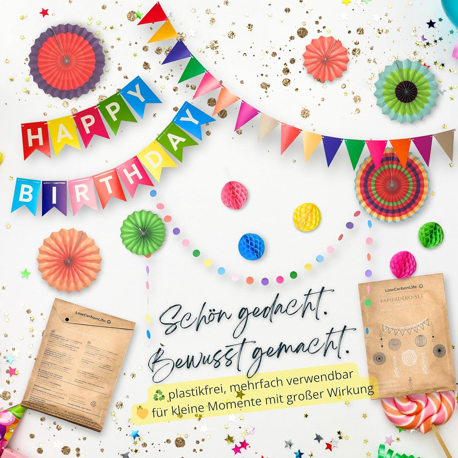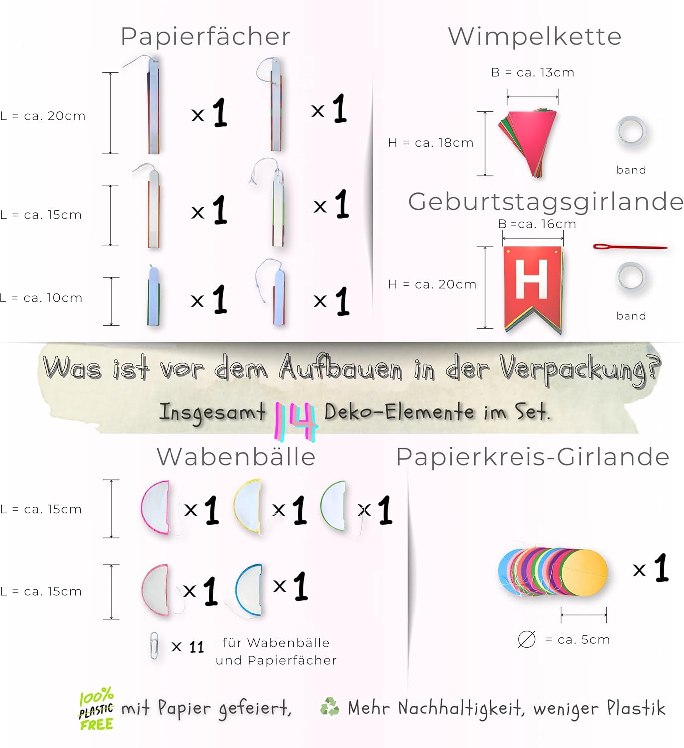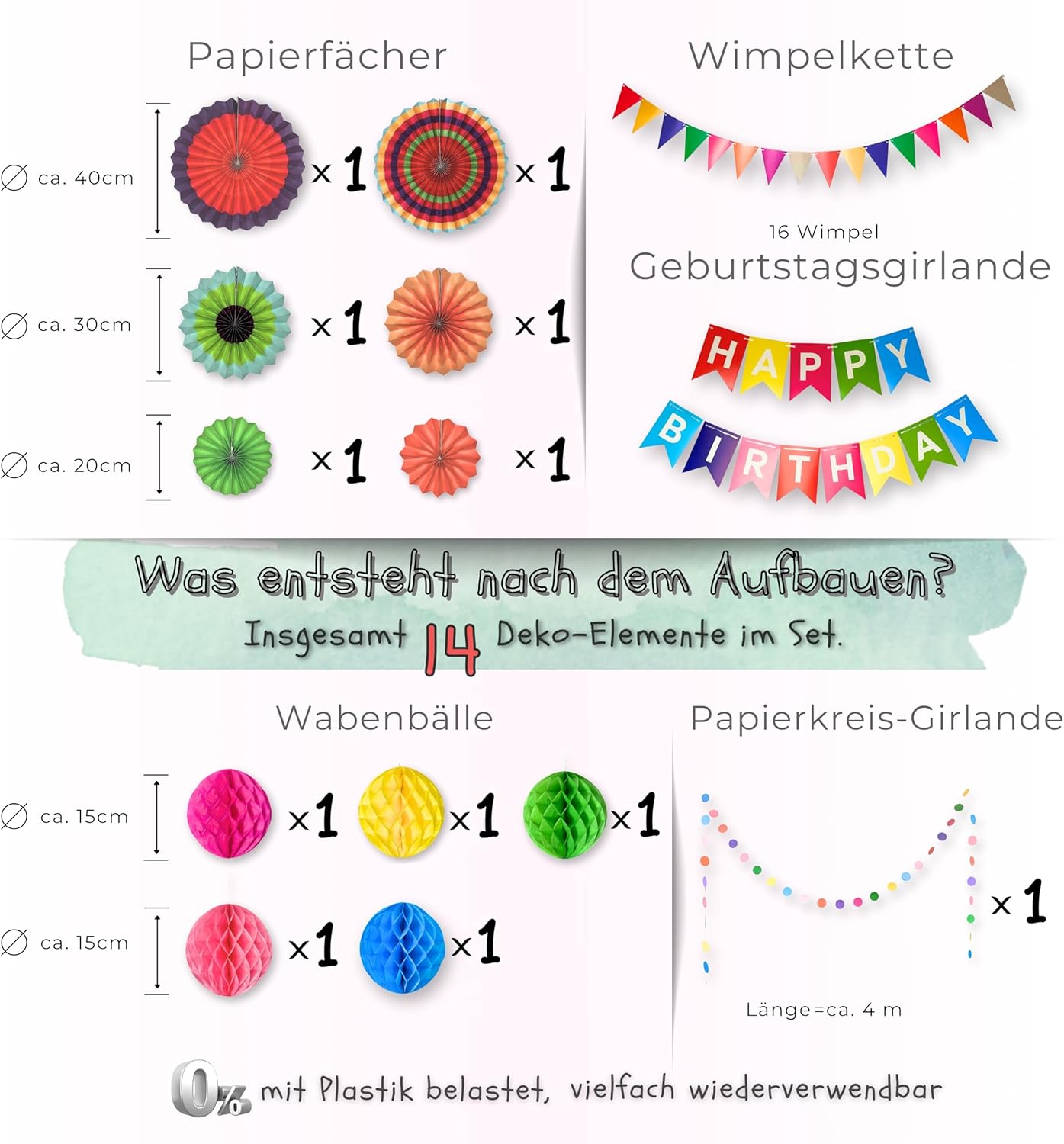 Decorazioni colorate per ogni occasione: il nostro classico set di decorazioni combina vivaci colori arcobaleno con affascinanti trame di carta, ideale per feste di compleanno per bambini, feste scolastiche, feste in giardino o allegre feste a sorpresa. Imballato in modo sostenibile e senza plastica: tutti gli elementi sono realizzati in carta resistente e di alta qualità. Senza plastica, senza pellicola: solo celebrazioni ecologiche con stile. La consegna avviene in busta di carta kraft con istruzioni illustrate (lingua italiana non garantita). Contenuto versatile: 14 pezzi: 6 ventagli di carta (Ø 40/30/20 cm), 5 palline a nido d'ape (Ø 15 cm), 1 ghirlanda "Happy Birthday" con design arcobaleno, 1 festone con 12 bandierine colorate e 1 ghirlanda a punti (circa 4 m) – tutto armoniosamente abbinato. Riutilizzabile e pratico: gli scomparti, le ghirlande e le palline possono essere riposte dopo la festa e riutilizzarle nuovamente alla prossima festa. Ideale per gli appassionati di decorazioni consapevoli con un senso di sostenibilità. Attira l'attenzione e idea regalo: per bambini, amici o familiari, questo set colorato non è solo funzionale, ma anche una vera attrazione con personalità.