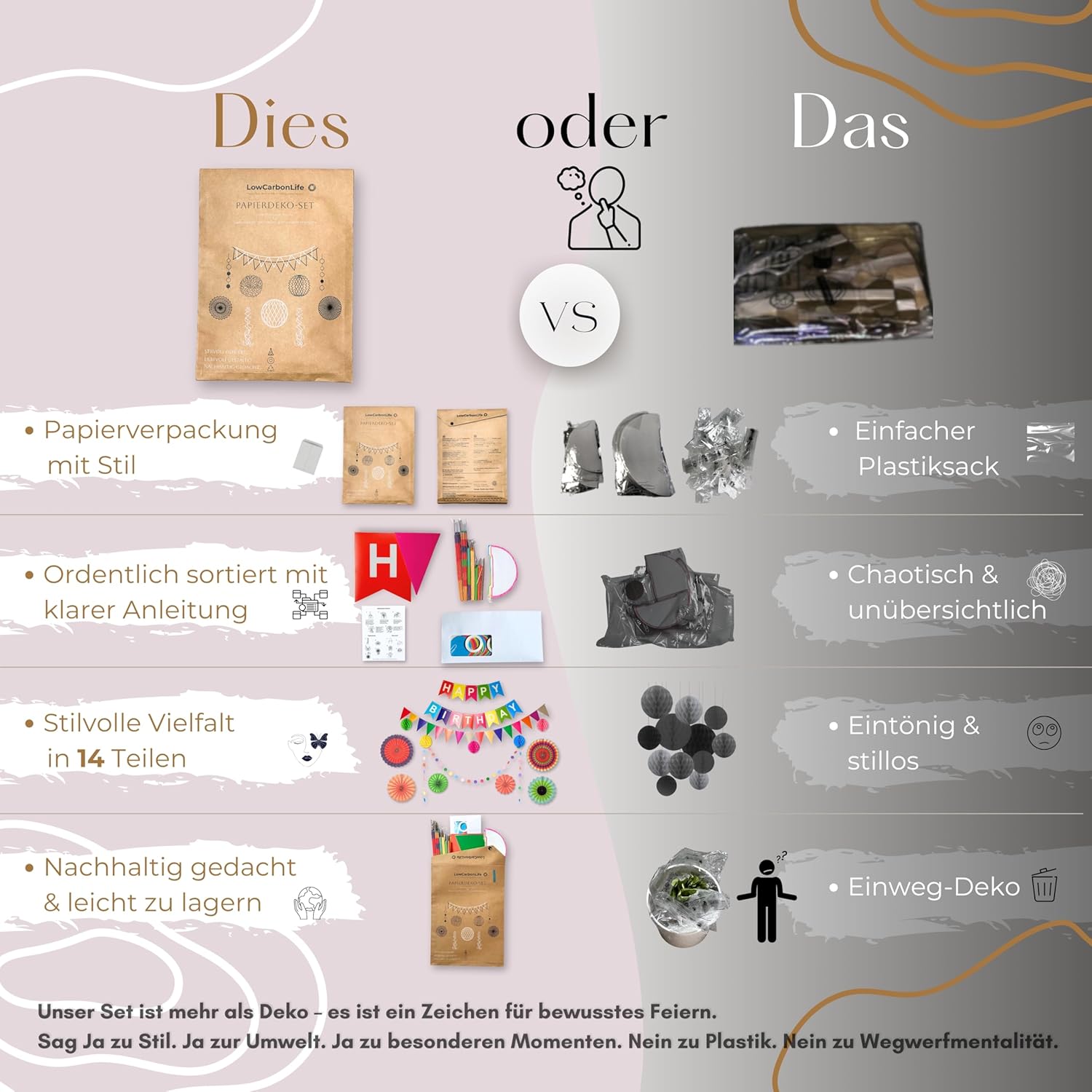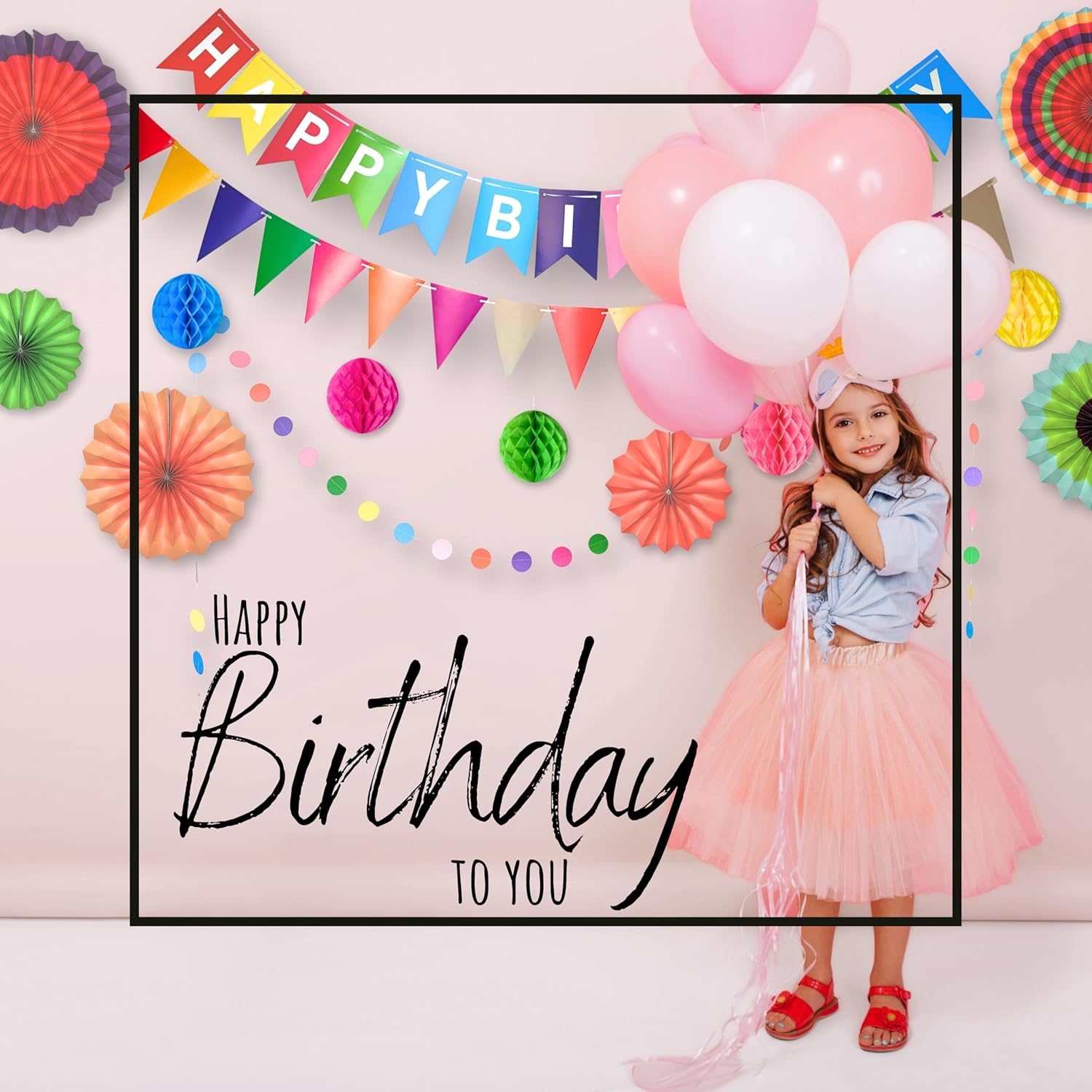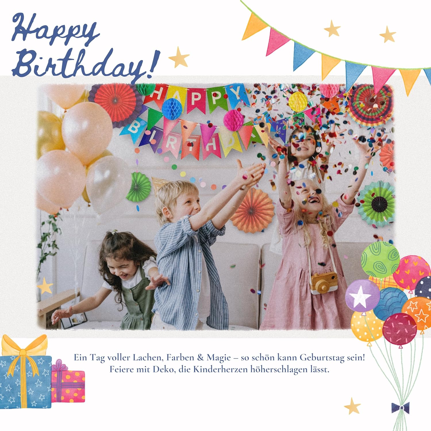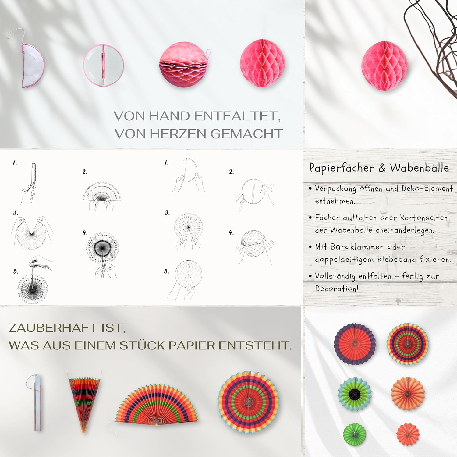 Decorazioni colorate per ogni occasione: il nostro classico set di decorazioni combina vivaci colori arcobaleno con affascinanti trame di carta, ideale per feste di compleanno per bambini, feste scolastiche, feste in giardino o allegre feste a sorpresa. Imballato in modo sostenibile e senza plastica: tutti gli elementi sono realizzati in carta resistente e di alta qualità. Senza plastica, senza pellicola: solo celebrazioni ecologiche con stile. La consegna avviene in busta di carta kraft con istruzioni illustrate (lingua italiana non garantita). Contenuto versatile: 14 pezzi: 6 ventagli di carta (Ø 40/30/20 cm), 5 palline a nido d'ape (Ø 15 cm), 1 ghirlanda "Happy Birthday" con design arcobaleno, 1 festone con 12 bandierine colorate e 1 ghirlanda a punti (circa 4 m) – tutto armoniosamente abbinato. Riutilizzabile e pratico: gli scomparti, le ghirlande e le palline possono essere riposte dopo la festa e riutilizzarle nuovamente alla prossima festa. Ideale per gli appassionati di decorazioni consapevoli con un senso di sostenibilità. Attira l'attenzione e idea regalo: per bambini, amici o familiari, questo set colorato non è solo funzionale, ma anche una vera attrazione con personalità.