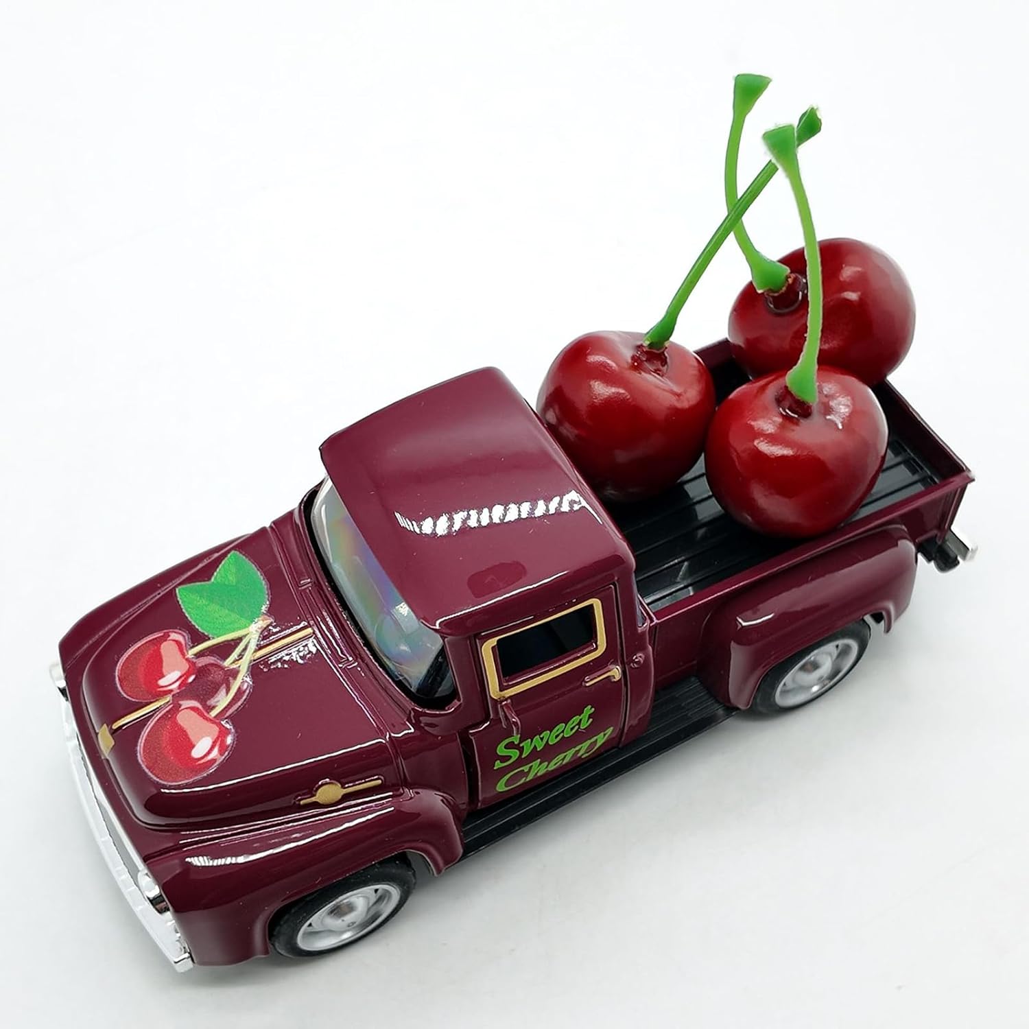 Resistenza Duratura: Struttura in lega di zinco ad alte prestazioni, resistente alla ruggine nel , dotato di elementi assorbivibrazioni e finitura opaca morbida per un aspetto realistico migliorato Decorazione Frutta Realistica: Migliora il camion giocattolo con un tocco naturale grazie a dettagliati frutti finti per tetto, finitura gradiente rosso e design dei gambi flessibili per un effetto realistico Estetica Vintage Accattivante: Corpo curvo liscio con finitura metallizzata opaca cattura lo spirito anni '50. Rifiniture cromate donano stile vintage autentico amato dagli appassionati. Dettagli realistici: porte definita e fari luminosi completano ruote a raggi con lavorazione precisa, garantendo autenticità nel camionismo in Utilizzo Versatile: Progettato per adattarsi facilmente in qualsiasi spazio, questo camion modello è per esposizione su scrivanie, aggiunge fascino come centrotavola in vetrine e funge da eccellente accessorio per fotografie creative grazie al design adattabile