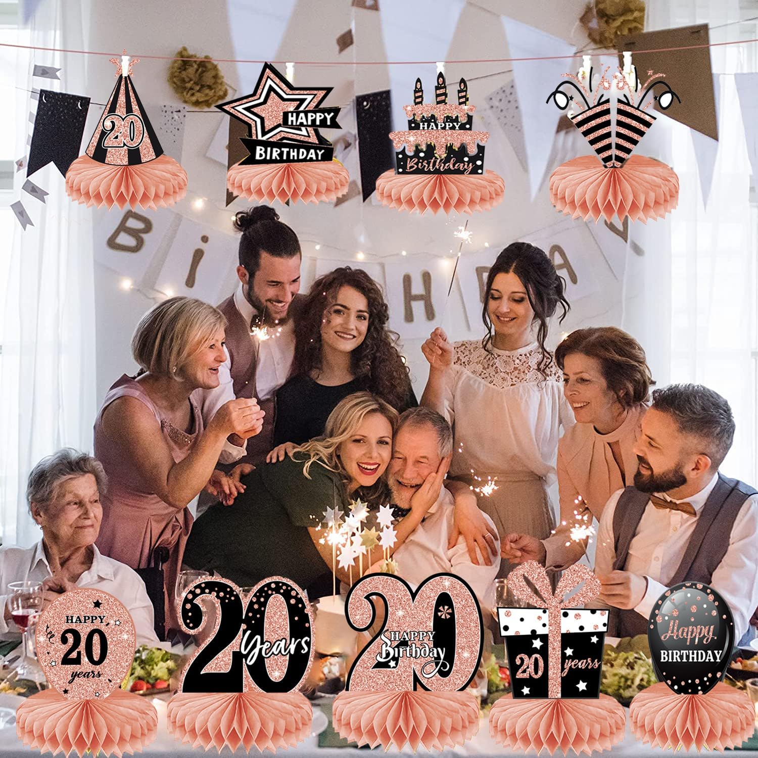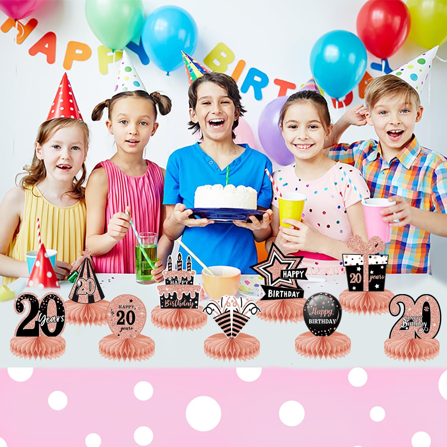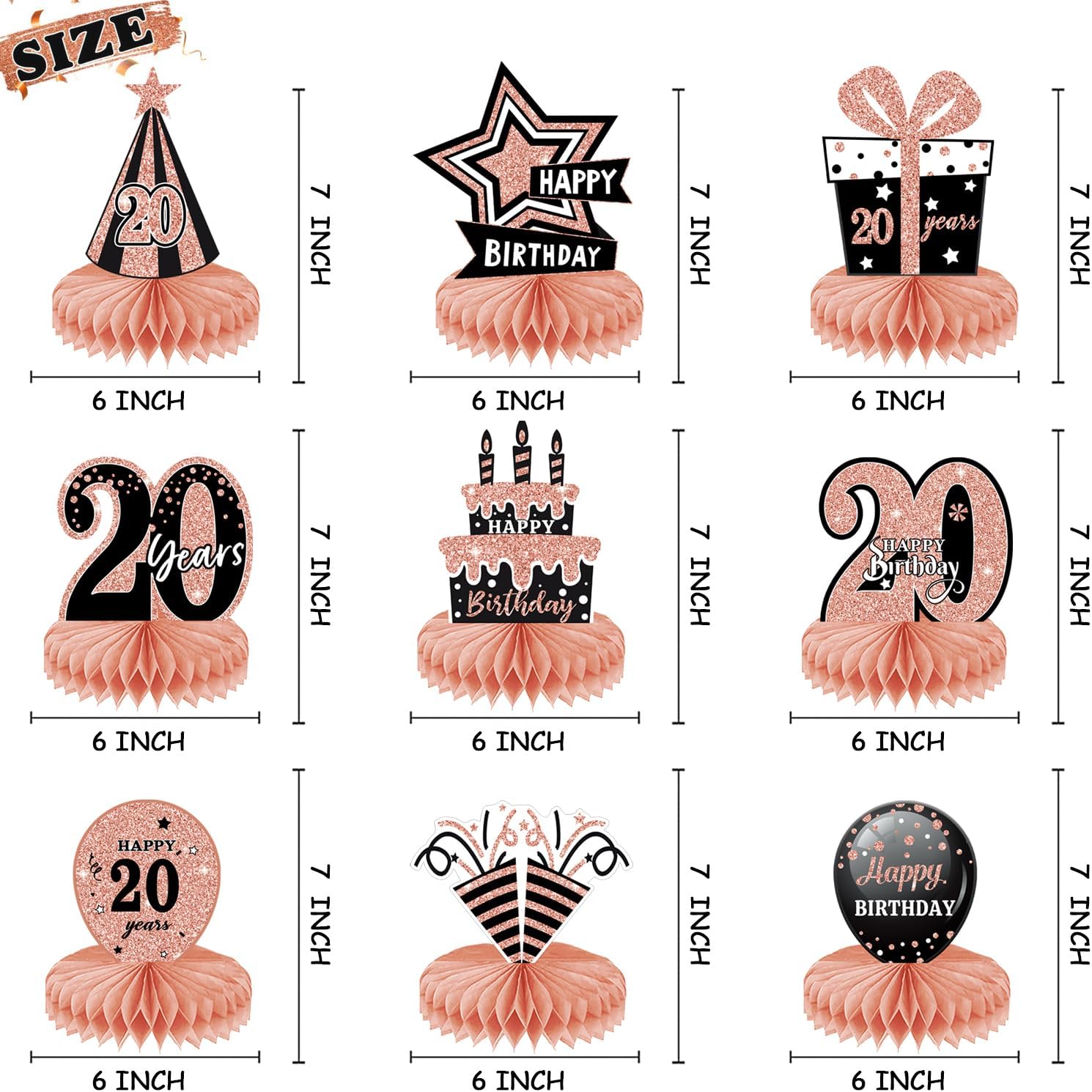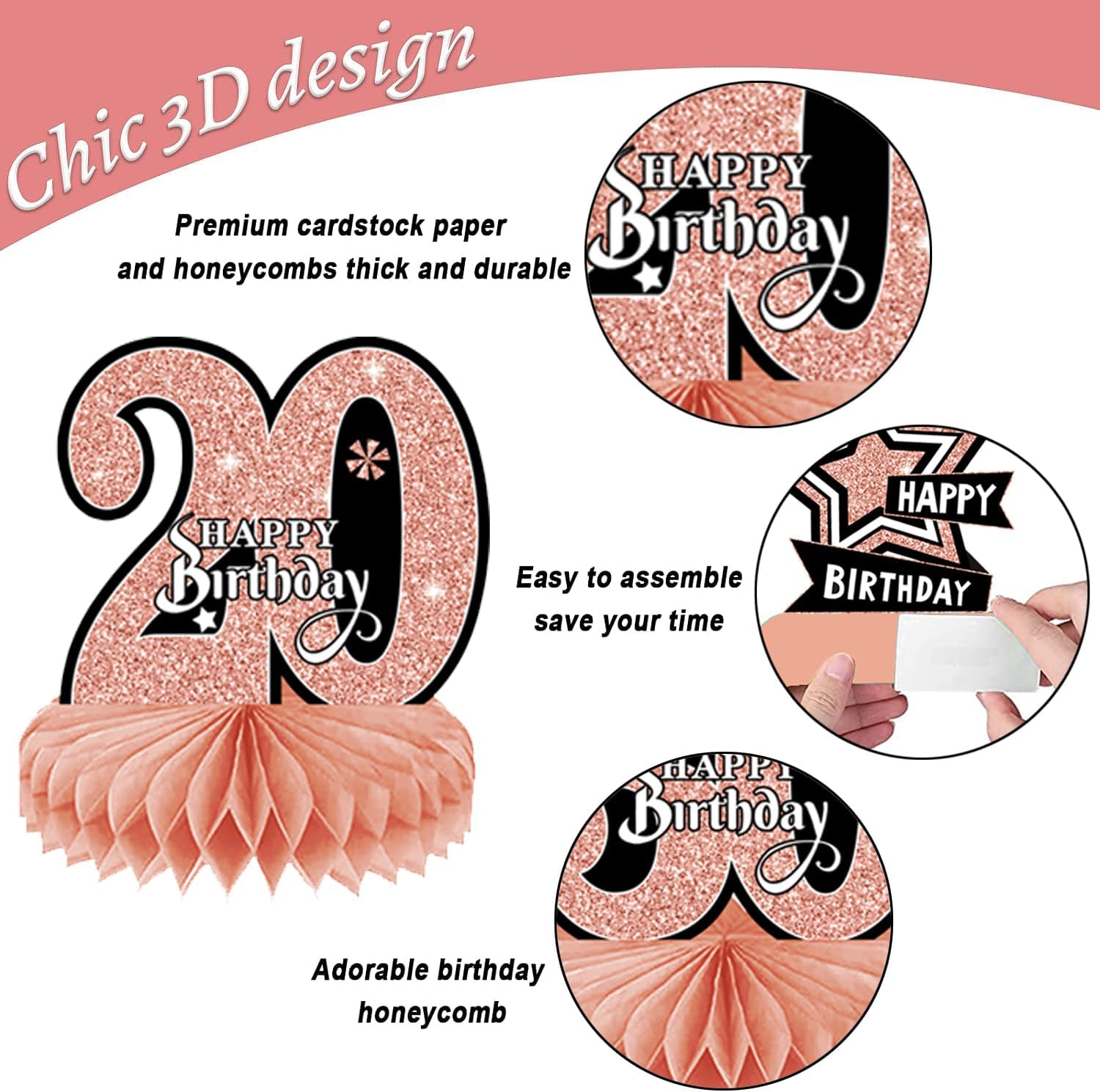 ALTA QUALITÀ: le decorazioni per la tavola di compleanno sono realizzate con materiali cartacei ecologici con superficie laminata e tecnologia di stampa delicata. Non sbiadisce facilmente e può essere utilizzato ripetutamente, leggero, sicuro e non tossico. Decorazione davvero fantastica per la sala delle feste per un compleanno. DESIGN CON STAMPA DOPPIO LATO: i centrotavola di compleanno 3D utilizzano una buona stampa digitale, stampati su entrambi i lati, colori fantastici, puoi vedere bellissimi colori su ciascun lato, offrendoti un'esperienza visiva di alta qualità. FACILE DA ASSEMBLARE: strappare l'adesivo centrale a nido d'ape, aprire il nido d'ape e incollarlo sulla superficie della carta. Ripeti il passaggio successivo sull'altro lato della carta e infine posizionala sul tavolo. Ogni pezzo centrale ha un'area di assemblaggio del telaio. TEMI IN ORO ROSA: Vari design di compleanno, come birra, scatole regalo, torte e cappelli, aggiungono un'atmosfera festosa. Il tema Rose Gold e i graziosi motivi rendono questo accessorio decorativo per il 20° compleanno più attraente. AMPIO UTILIZZO: decorazioni da tavola adatte per cerimonie, decorazioni per feste di compleanno, anniversari e altre scene di festa. Può essere utilizzato come decorazione per la tavola di compleanno e anche come sfondo fotografico.