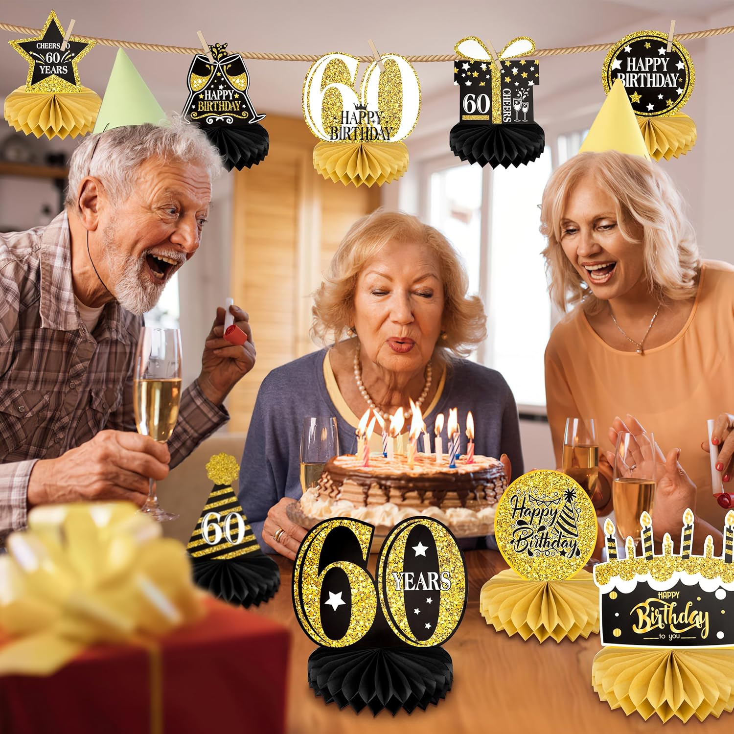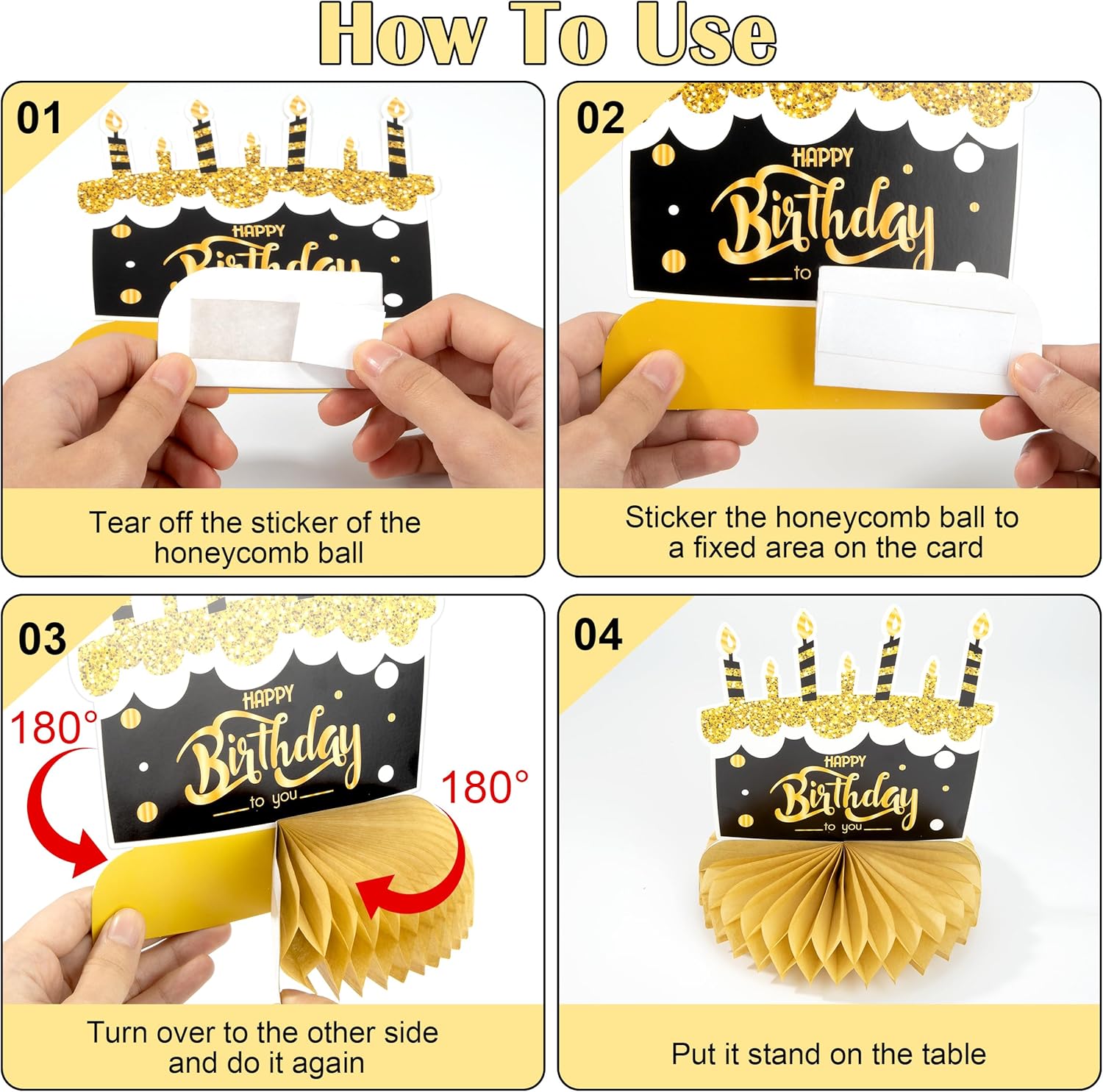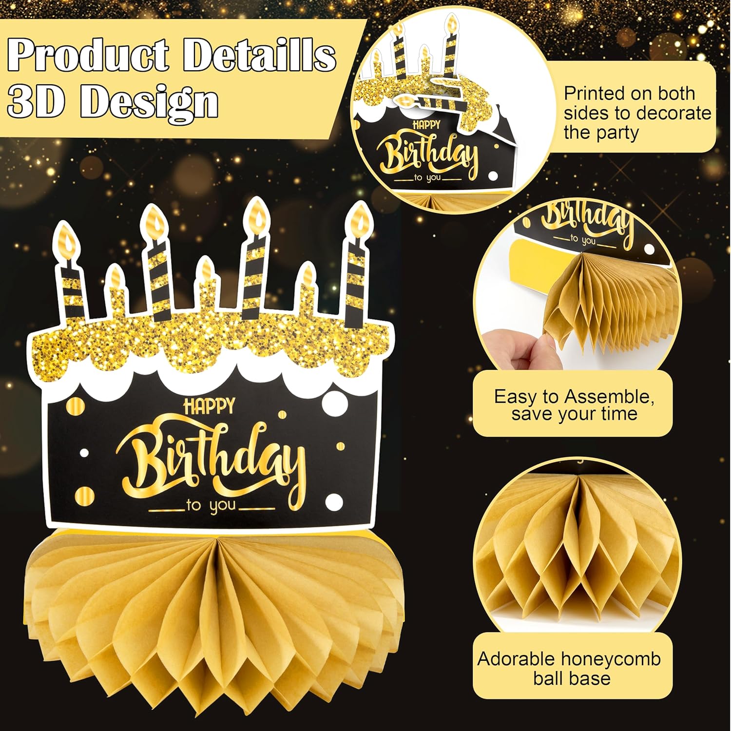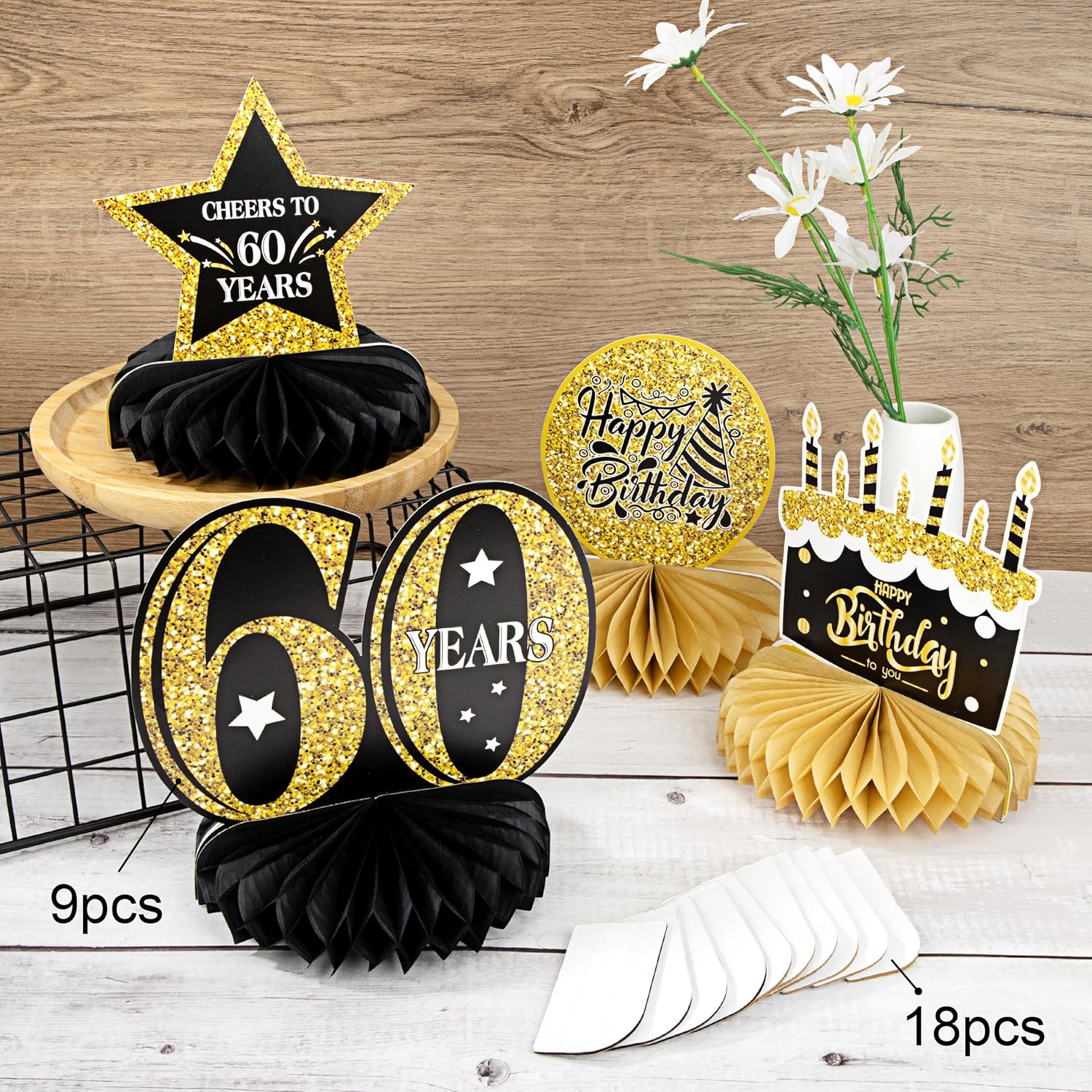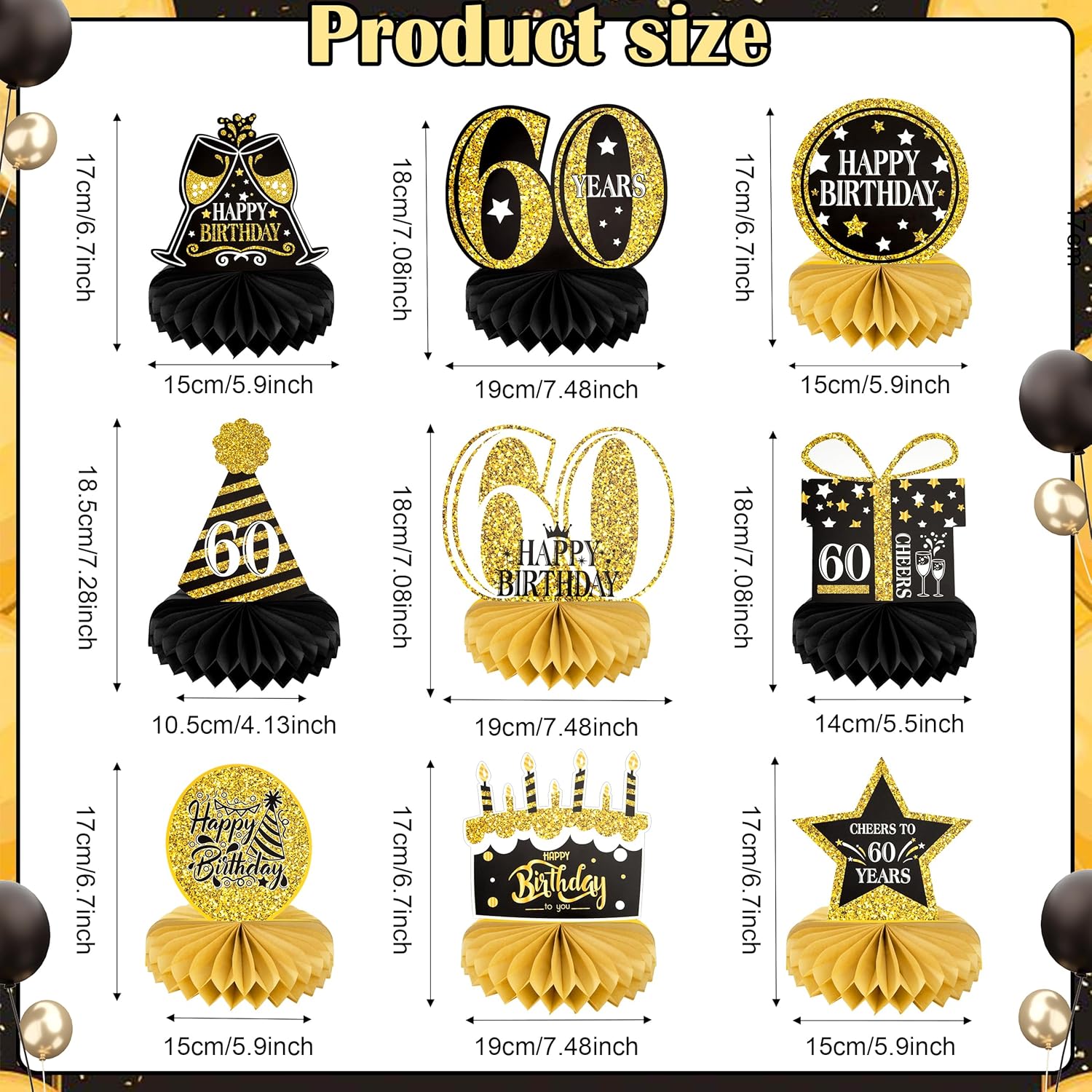 Design 3D: decorazioni di compleanno a tema nero e oro, motivi fronte-retro, nobili e alla moda, che producono forti effetti visivi, le decorazioni del desktop a nido d'ape fanno una forte impressione. Decorazioni per il 60° compleanno: include 9 diversi design (torta, stelle, champagne, scatole regalo, ecc.) e decorazioni a nido d'ape per decorare la casa e la festa per aggiungere un'atmosfera romantica. Alta qualità: i centrotavola a nido d'ape sono realizzati in cartone con buona stampa digitale, motivi chiari, colori brillanti, non facili da sbiadire e strappare, riutilizzabili. Facile da montare: stacca l'adesivo dalla sfera a nido d'ape, incollalo sul fondo della carta e aprilo, quindi ripeti sull'altro lato. Ogni palla di compleanno a nido d'ape richiede due basi. Scenario di decorazioni multiple: decorazioni creative per la festa a tema del 60° compleanno sul tavolo o appendile con clip e usale come oggetti fotografici creativi per ricordi divertenti e meravigliosi!