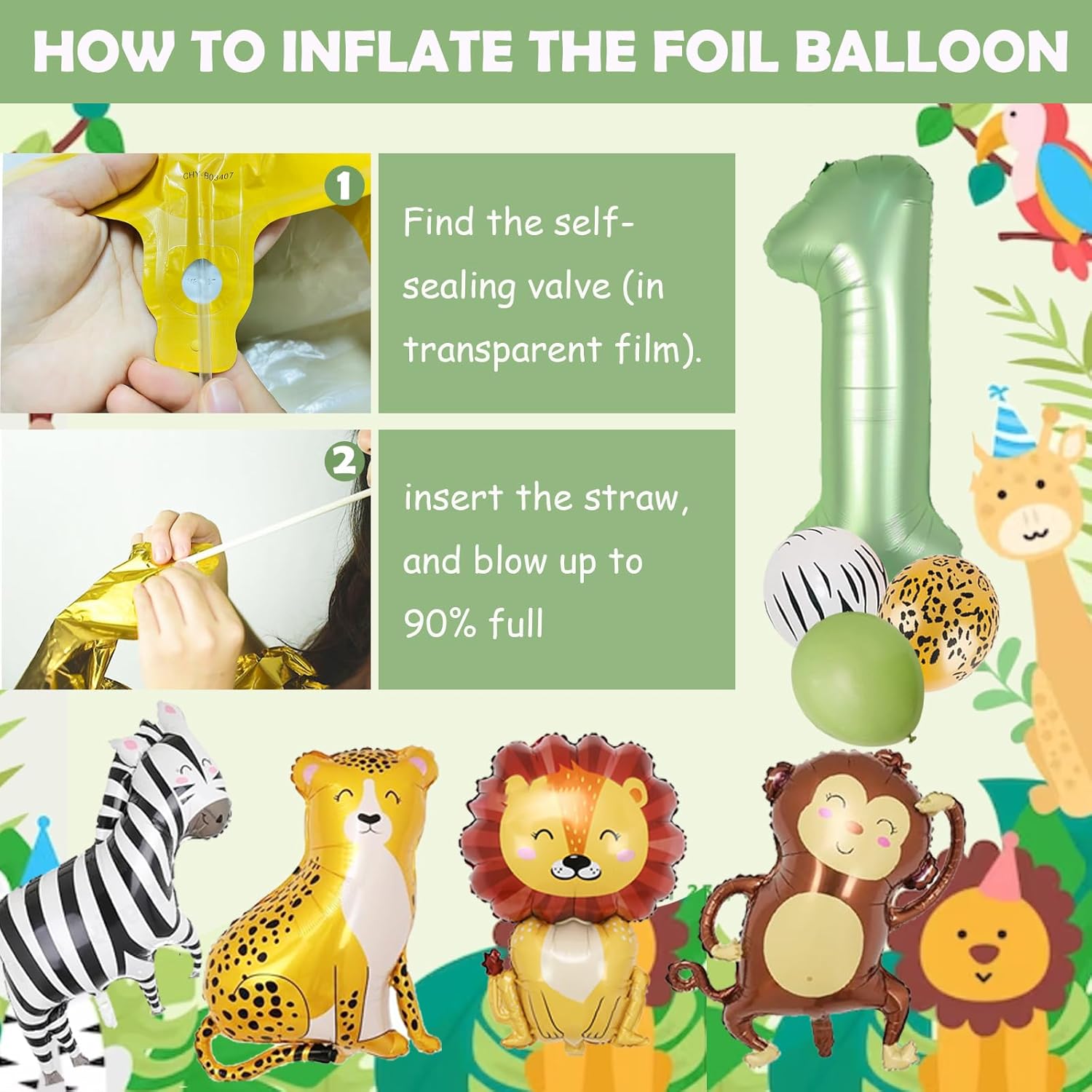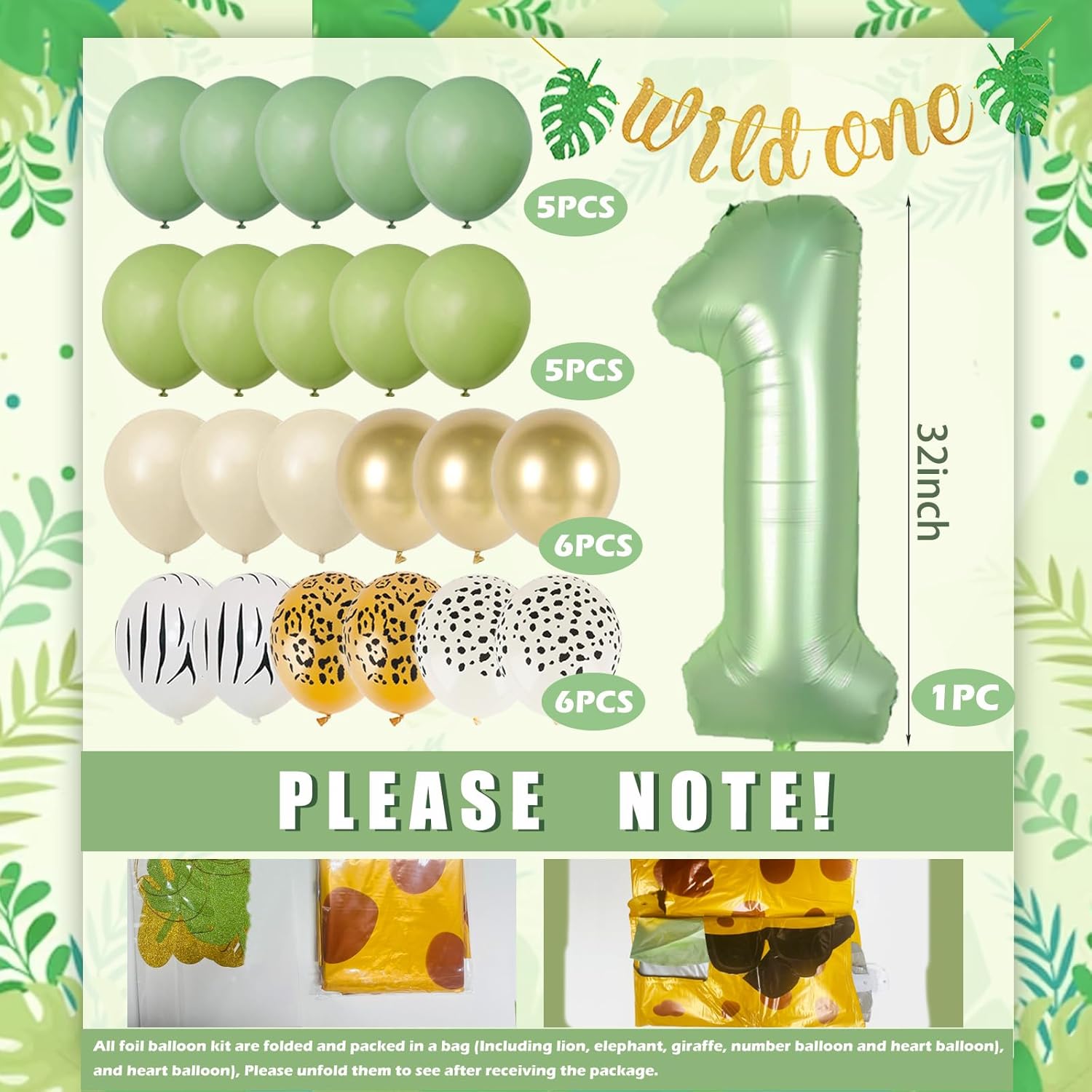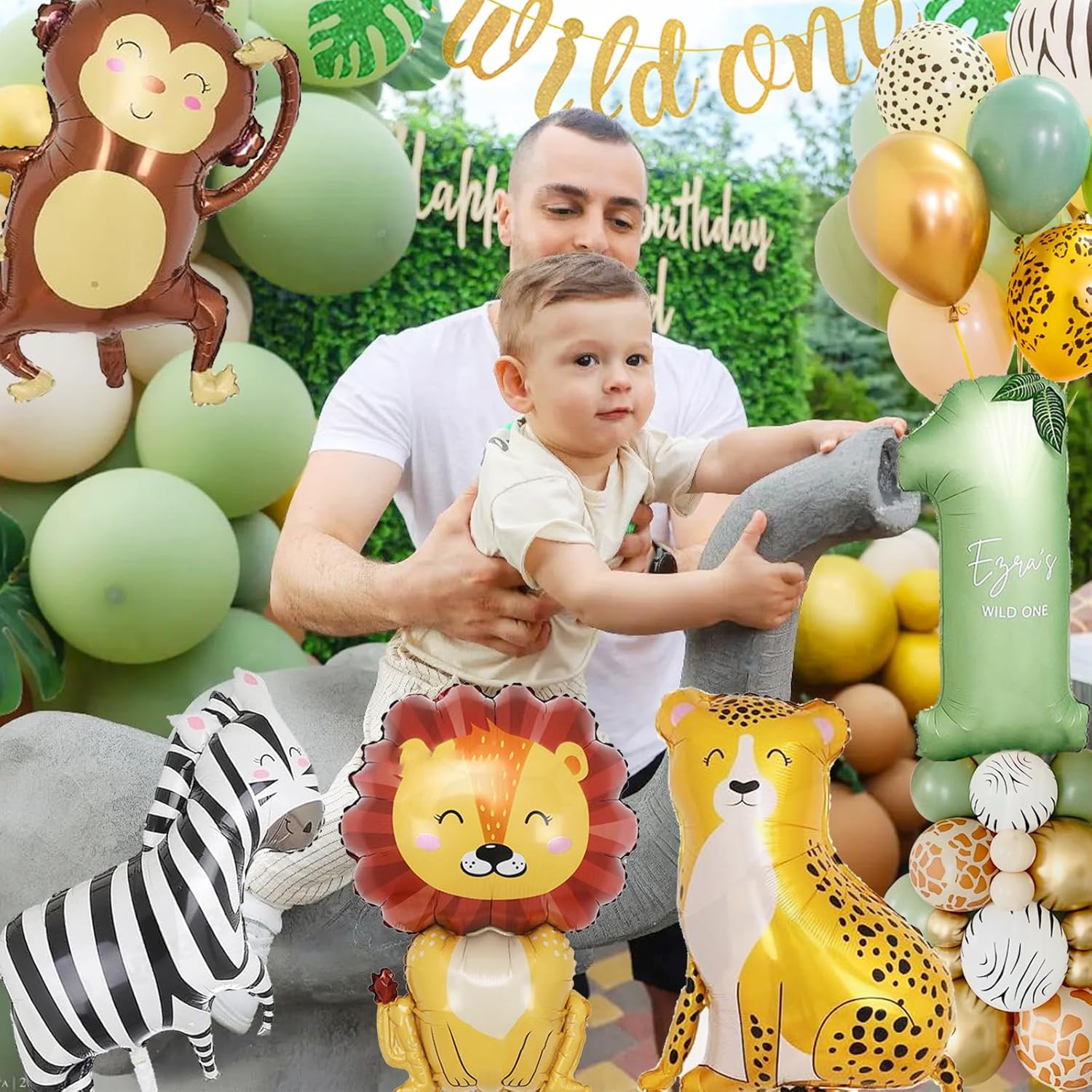 Decorazione compleanno Wild One: questo set di decorazioni per il primo compleanno di un ragazzo, tra cui: palloncino "1"; Palloncino leone*1; palloncino scimmia * 1; Palloncino zebrato*1; Palloncino leopardo * 1; Ghirlanda del "selvaggio"; 22 * Palloncini in lattice; Decorazione di compleanno con nastro per palloncini da 3 m, ragazzo di 1 anno: palloncini foil Safari in combinazione con palloncini con motivi zebrati e leopardati. Questo bellissimo set di palloncini crea un'atmosfera da caccia per celebrare il tema del primo compleanno del ragazzo. Alta qualità: i palloncini in foil con animali sono realizzati con la moderna tecnologia di stampa e hanno cuciture rinforzate. Sono riutilizzabili e durano circa 2 settimane una volta gonfiati. Assemblare la decorazione del 1° compleanno è facile e può essere gonfiata subito per decorare la festa. Multiuso: perfetto per decorazioni per il primo compleanno di ragazzi e ragazze, feste a tema selvaggio, decorazioni nella giungla, feste safari. Può essere utilizzato sia all'interno che all'esterno. Servizio: se hai domande sulla decorazione di compleanno di 1 anno che hai ricevuto, contattaci immediatamente via e-mail. Questa è la soluzione più veloce. Elaboreremo la tua richiesta il più rapidamente possibile e offriremo una soluzione! Suggerimento: gonfiare i palloncini degli animali all'85%-90% per evitare che scoppino (vedere il video dell'immagine principale per istruzioni dettagliate). I palloncini in lattice sono realizzati con stampa a inchiostro e potrebbero emanare un leggero odore durante il trasporto sigillato. Non preoccuparti, questo è innocuo.
