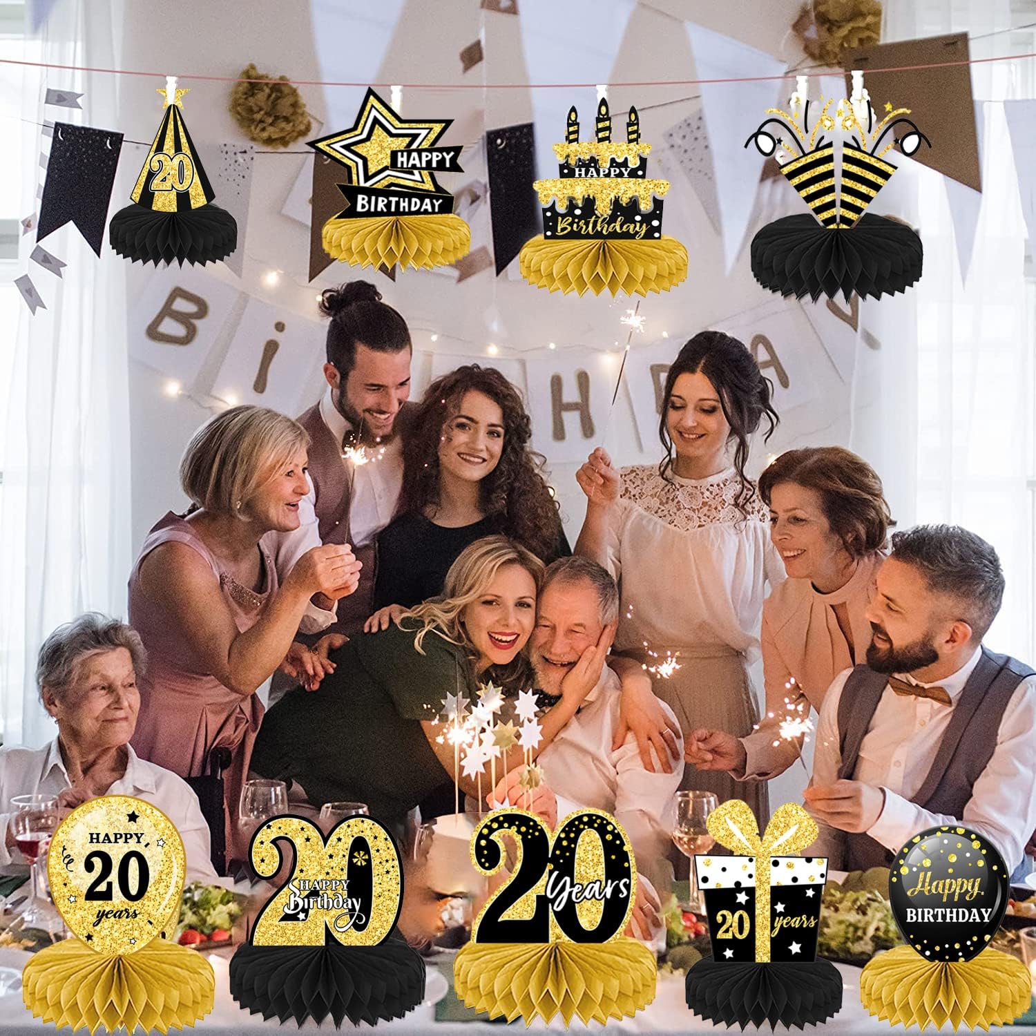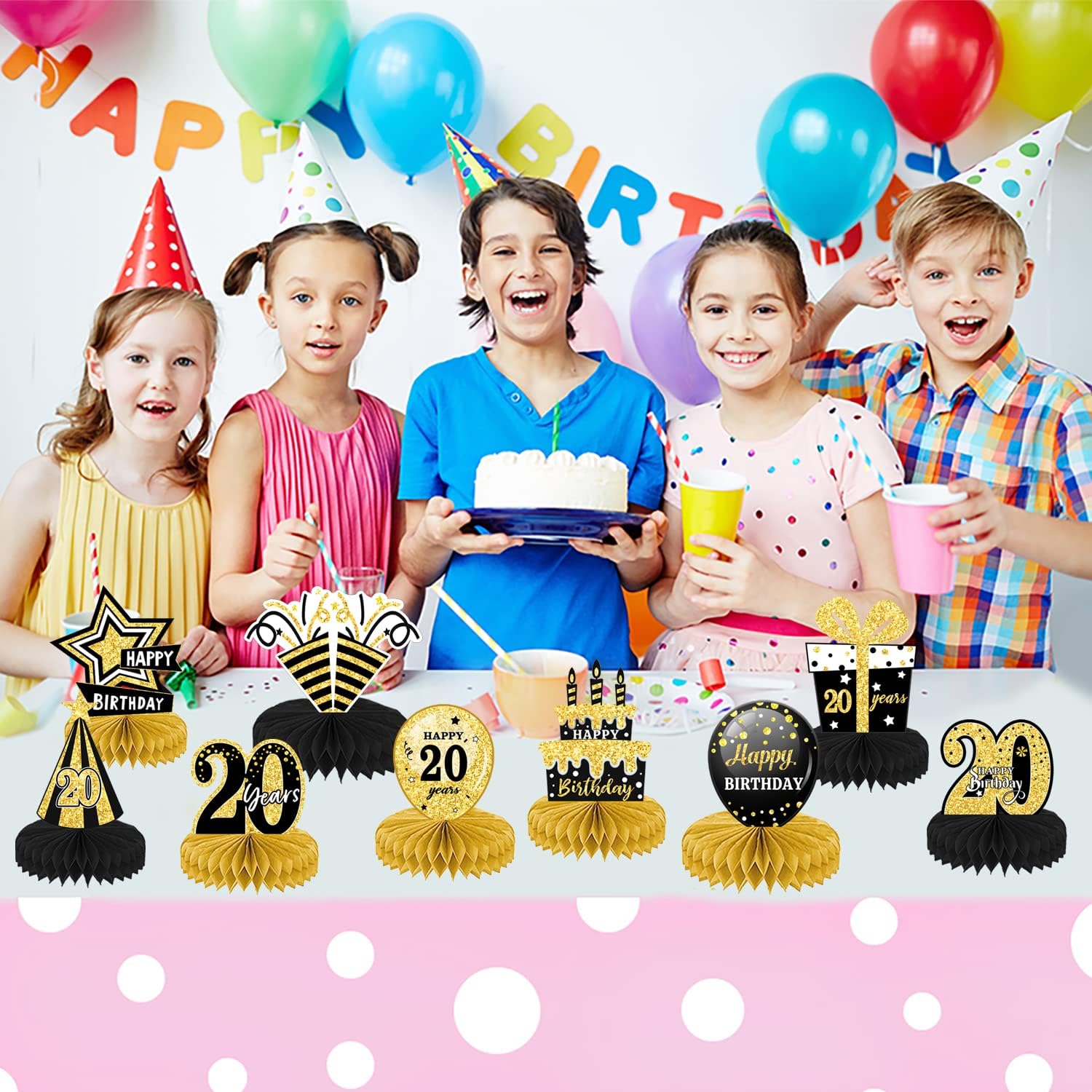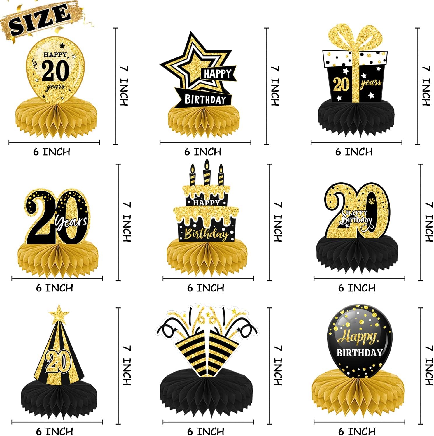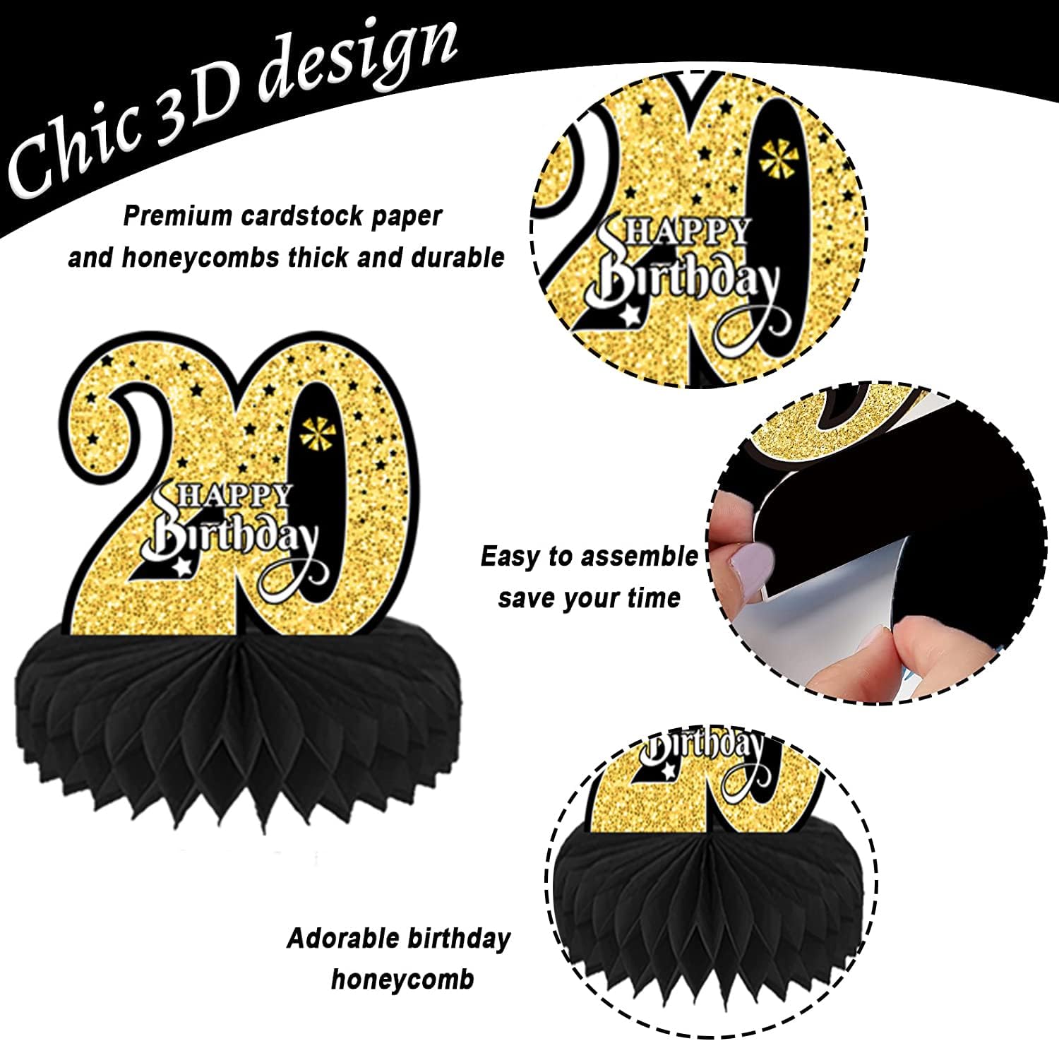 ALTA QUALITÀ: le decorazioni per il 20° compleanno sono realizzate con materiali cartacei ecologici con superficie laminata e tecnologia di stampa delicata. Non sbiadisce facilmente e può essere utilizzato ripetutamente, leggero, sicuro e non tossico. Decorazione davvero fantastica per la sala delle feste per un compleanno. DESIGN CON STAMPA A DOPPIO LATO: le decorazioni per la tavola di compleanno 3D utilizzano una buona stampa digitale, stampata su entrambi i lati, colori fantastici, puoi vedere bellissimi colori su ciascun lato, offrendoti un'esperienza visiva di alta qualità. FACILE DA ASSEMBLARE: strappare l'adesivo centrale a nido d'ape, aprire il nido d'ape e incollarlo sulla superficie della carta. Ripeti il passaggio successivo sull'altro lato della carta e infine posizionala sul tavolo. Ogni pezzo centrale ha un'area di assemblaggio del telaio. TEMI NERO E ORO: vari design di compleanno, come birra, scatole regalo, torte e cappelli, aggiungono un'atmosfera festosa. Il tema nero e oro e i graziosi motivi rendono questo accessorio decorativo per la tavola di compleanno più attraente. AMPIO UTILIZZO: decorazioni da tavola adatte per cerimonie, decorazioni per feste di compleanno, anniversari e altre scene di festa. Può essere utilizzato come decorazione per la tavola di compleanno e anche come sfondo fotografico.
