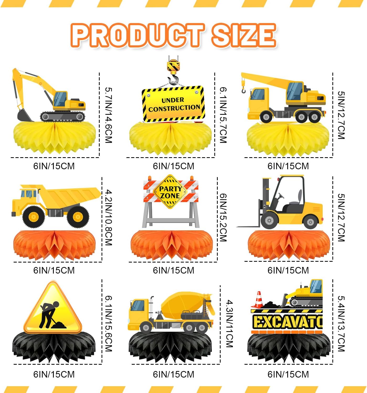 Centrotavola a nido d'ape da costruzione: questo set contiene 9 pezzi di centrotavola a nido d'ape per veicoli da costruzione, perfetti come decorazioni per compleanno in cantiere e decorazioni per feste in cantiere e possono rendere la tua festa di compleanno in architettura più attraente e accattivante. Alta qualità: i nostri centrotavola a nido d'ape per veicoli da barricata per camion sono realizzati in cartone rigido di alta qualità e materiale cartaceo sottile, sono stampati in modo chiaro e durevoli, rendendoli la scelta migliore per centrotavola a nido d'ape a tema di costruzione e decorazioni per feste di compleanno per bambini. DESIGN UNICO: questa decorazione a nido d'ape per veicoli ingegneristici presenta molti bellissimi elementi a tema costruttivo, tra cui gru, escavatori, carrelli elevatori, betoniere, bulldozer, segnali di sicurezza e altri modelli di costruzione classici, che possono aggiungere sorprendenti effetti visivi ai centrotavola della tua festa del costruttore. Facile da usare: devi solo dedicare qualche secondo ad attaccare la carta a tema sulla base a nido d'ape, e poi otterrai un'adorabile decorazione da tavolo a forma di centrotavola a nido d'ape per veicoli da barricata per camion, che ti darà più tempo per goderti la felice decorazione di compleanno del cantiere con la tua famiglia e i tuoi amici. Scene applicabili: i centrotavola a nido d'ape a tema di costruzione in queste decorazioni per feste di compleanno per bambini possono essere utilizzati in una varietà di occasioni e sono molto adatti per decorazioni per feste in cantiere, decorazioni per compleanno in cantiere, feste di compleanno in architettura, feste con escavatori, feste con camion da costruzione e altre feste festive.