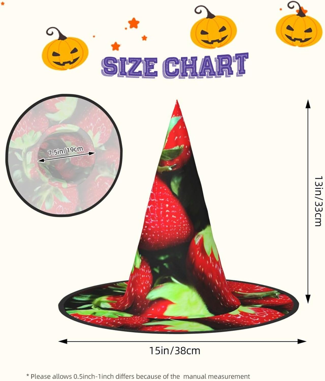 Realizzati in tessuto Oxford superiore, i nostri cappelli con stampa a fragola garantiscono durata e longevità. Il design unico consente di ridurre al minimo la parte superiore del cappello e i bordi di essere attorcigliati e piegati, rendendo i cappelli salvaspazio e facilmente portatili. Ogni cappello con stampa a fragola è di dimensioni generose per adattarsi alla maggior parte delle persone ed è leggero per un uso confortevole. Si prega di leggere la tabella delle taglie prima di effettuare l'ordine. Il design versatile dei nostri cappelli da strega di Halloween con stampa a fragola li rende perfetti per varie occasioni. Sono lavabili in lavatrice e ad asciugatura rapida per una facile manutenzione.