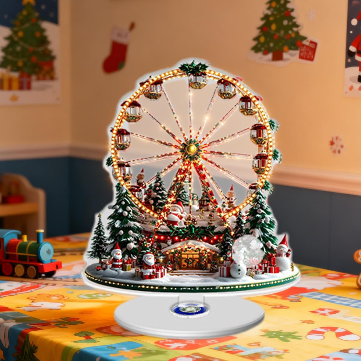 Base rotante delicata: questo pezzo di stazione natalizia è dotato di una base rotante che garantisce una rotazione particolarmente fluida e fluida. Questo display dinamico conferisce ai tuoi interni festivi un fascino speciale e affascina gli ospiti durante le celebrazioni e le vacanze con il suo movimento aggraziato. La rotazione crea un ambiente vivace che aumenta l'atmosfera durante le riunioni e le completa idealmente. Scelte di regali festivi: le impostazioni della tavola festiva offrono un'opzione regalo festiva che integra le tradizionali usanze festive e crea un'atmosfera accogliente durante banchetti festivi e pasti in famiglia. Ispirano momenti condivisi di gioia e gratitudine durante tutta la stagione e supportano così il mantenimento dei legami familiari. Uso efficiente dello spazio: questa decorazione per la tavola di Natale è progettata per massimizzare l'efficienza e combina un posizionamento versatile con vantaggi funzionali che migliorano l'impostazione della tavola di casa e sono perfetti per spazi più piccoli durante le vacanze o riunioni informali. Con il suo design salvaspazio e personalizzabile, ottimizza lo spazio disponibile ed esalta lo spirito natalizio senza compromettere l'estetica o la praticità per un'impostazione della tavola di successo in qualsiasi casa. Materiale acrilico: questi tavoli da tavola natalizi sono realizzati in materiale acrilico altamente trasparente, che fornisce una forte trasmissione della luce e migliora l'atmosfera festosa con un aspetto pulito ed elegante. Si adattano perfettamente a qualsiasi ambiente di vacanza e sono estremamente resistenti per l'uso in riunioni di famiglia, feste o eventi festivi. La struttura robusta garantisce che mantengano la loro bellezza anche con un uso frequente. È un elemento decorativo versatile che arricchisce l'atmosfera festosa negli ambienti interni ed esterni e contribuisce così al comfort natalizio. Con il suo design incantevole attira l'attenzione in ogni occasione.