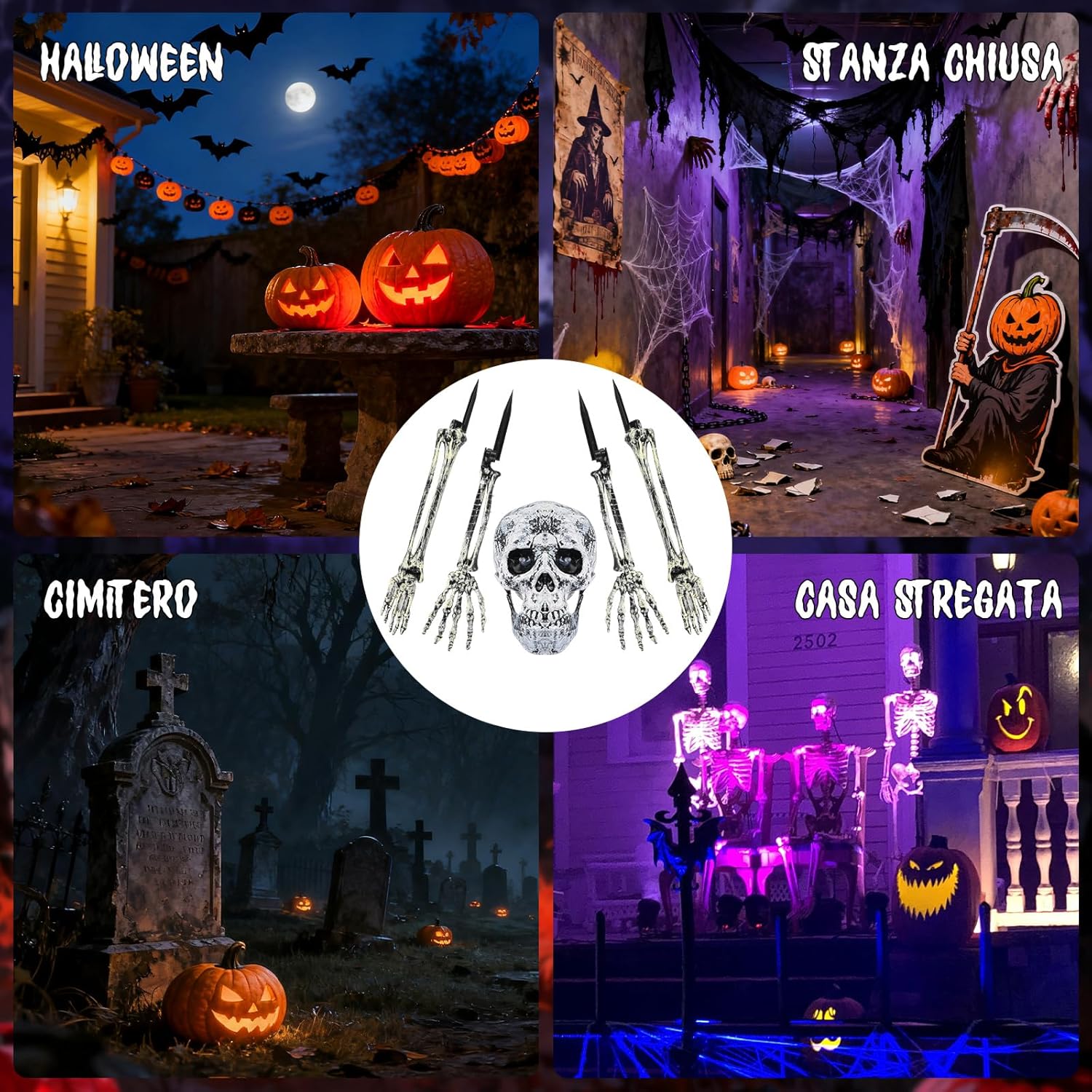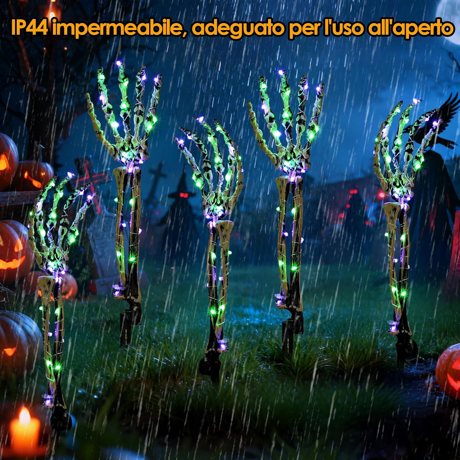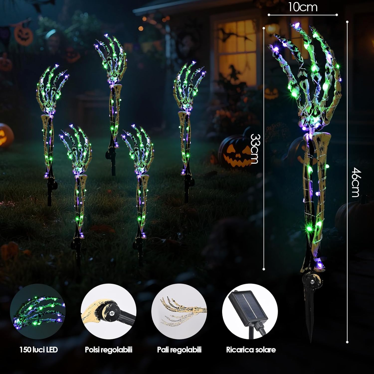 DECORAZIONE DI BRACCI DI SCHELETRO PER HALLOWEEN : La nostra decorazione esterna per Halloween include stecche di bracci di scheletro luminescenti, con 8 modalità di illuminazione, 150 LED e impermeabilità IP65 — perfetta per creare un’atmosfera spaventosa. 8 MODALITÀ DI ILLUMINAZIONE + ENERGIA SOLARE : I bracci di scheletro grusevoli funzionano con pannelli solari. Dopo 6-8h di carica completa, illuminano 9-12h in continuo ; il design ad induzione luminosa garantisce la carica di giorno e l’accensione automatica di notte. COSTRUZIONE DURATURA : Realizzati in plastica di qualità, resistono alla pioggia ; il polso è regolabile a 90 gradi, adatto a decori interni ed esterni. INSTALLAZIONE SEMPLICE Installazione Semplice : Inserisci le stecche nel suolo morbido ; i bracci possono essere ajustati a 90 gradi per diverse forme e posizioni. APPLICAZIONI VERSATILI : Adatta a feste di Halloween, decori di scena, nonché giardini, terrazze, recinzioni e case stregate — crea un’atmosfera realistica per la tua famiglia.