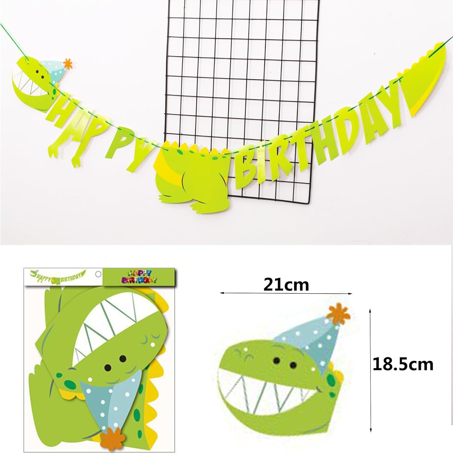 Le dimensioni della confezione della ghirlanda Happy Birthday sono di circa 22 x 25 cm, leggermente più grandi del solito striscione Happy Birthday. L'intera ghirlanda di compleanno dei dinosauri ha la forma di un adorabile dinosauro, molto attraente. Due grandi palloncini di elio di dinosauro. Uno è un palloncino T-Rex verde selvaggio e l'altro è un palloncino di dinosauro con un cappello da festa di buon compleanno. Inoltre, in regalo sono inclusi due piccoli palloncini con dinosauri. 13 palloncini in lattice da 30 cm nei colori verde scuro, verde mela e bianco, stampati con dinosauri, foglie, numeri e altri disegni per rendere i palloncini ancora più vari e speciali.