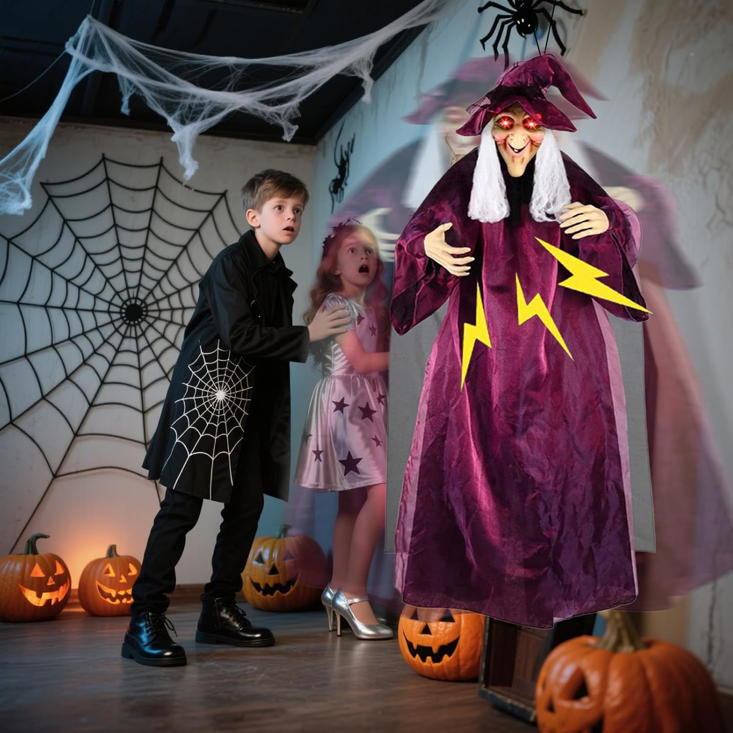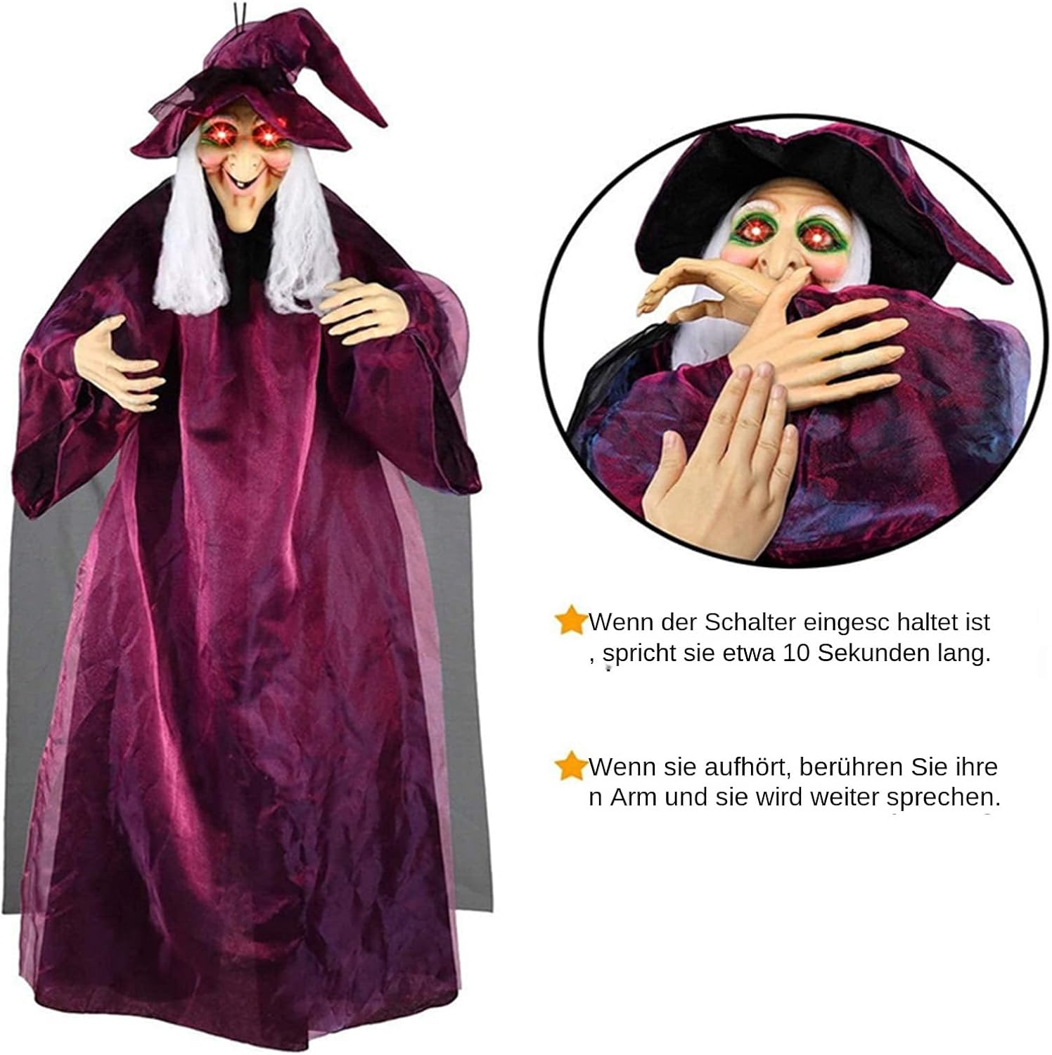 Decorazione istantanea: si appende facilmente ai telai delle porte, alle ringhiere e ai rami degli alberi per trasformarsi istantaneamente in uno spettrale mondo di Halloween Bracci flessibili: la struttura rotante del braccio supporta varie pose in base al punto di posizionamento, fornisce un'espressione decorativa migliorata e design adattabili per l'arredamento della strega di Halloween Conversazioni automatiche: il sistema di sensori integrato consente alla strega di parlare senza sforzo, migliorando l'atmosfera festosa e spettrale delle tue decorazioni di Halloween Uso flessibile: perfetto per case spettrali, stanze di fuga o feste spaventose. La versatile decorazione di Halloween trasforma giardini e giardini in inquietanti mondi di esperienza per vari eventi. Miglioratore dell'atmosfera: aumenta l'atmosfera di Halloween con effetti sonori spaventosi e occhi luminosi rosso sangue. Questo crea un'intensa esperienza horror che lascia un'impressione duratura e si integra perfettamente con qualsiasi festa spaventosa.