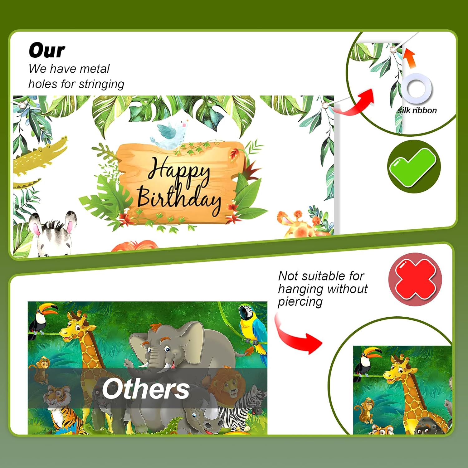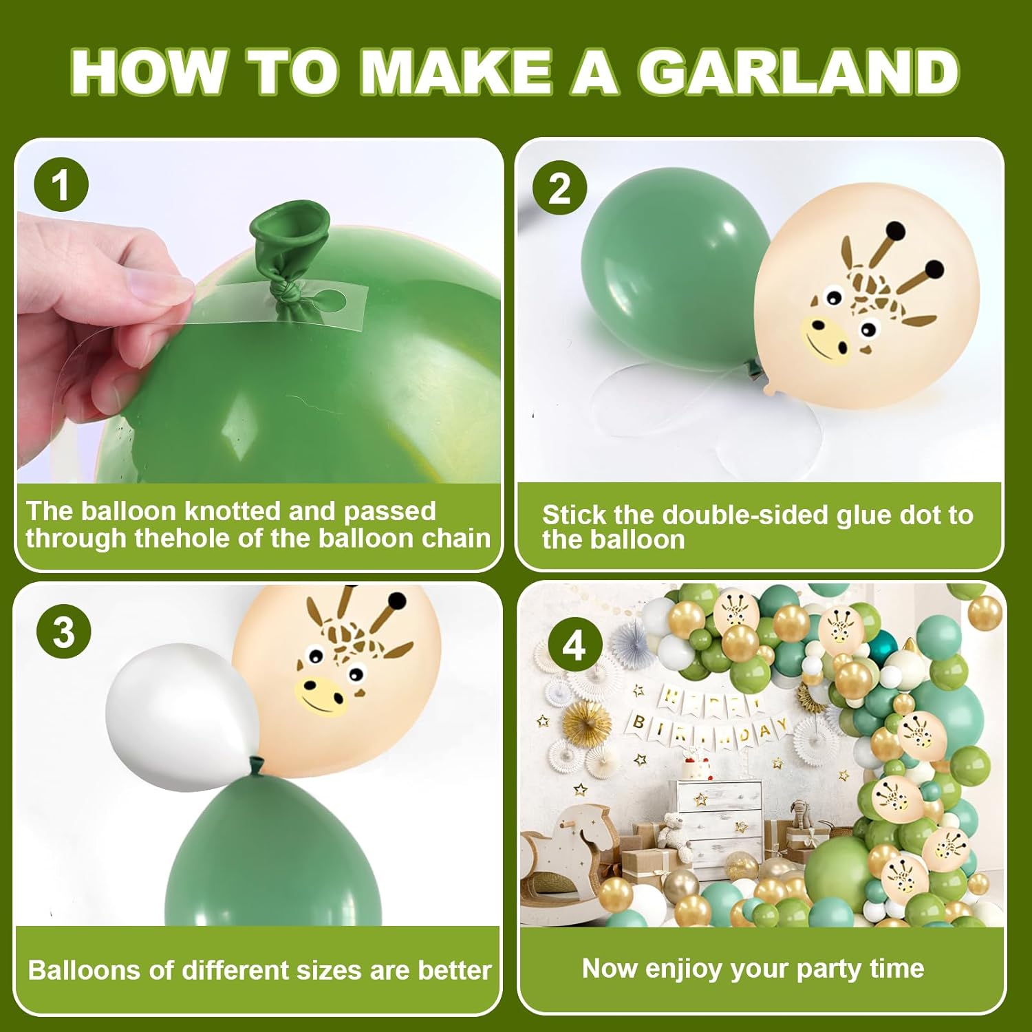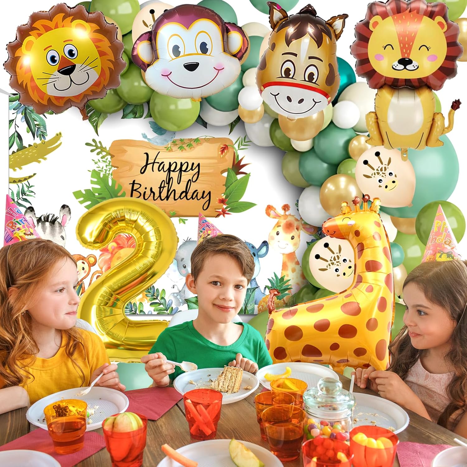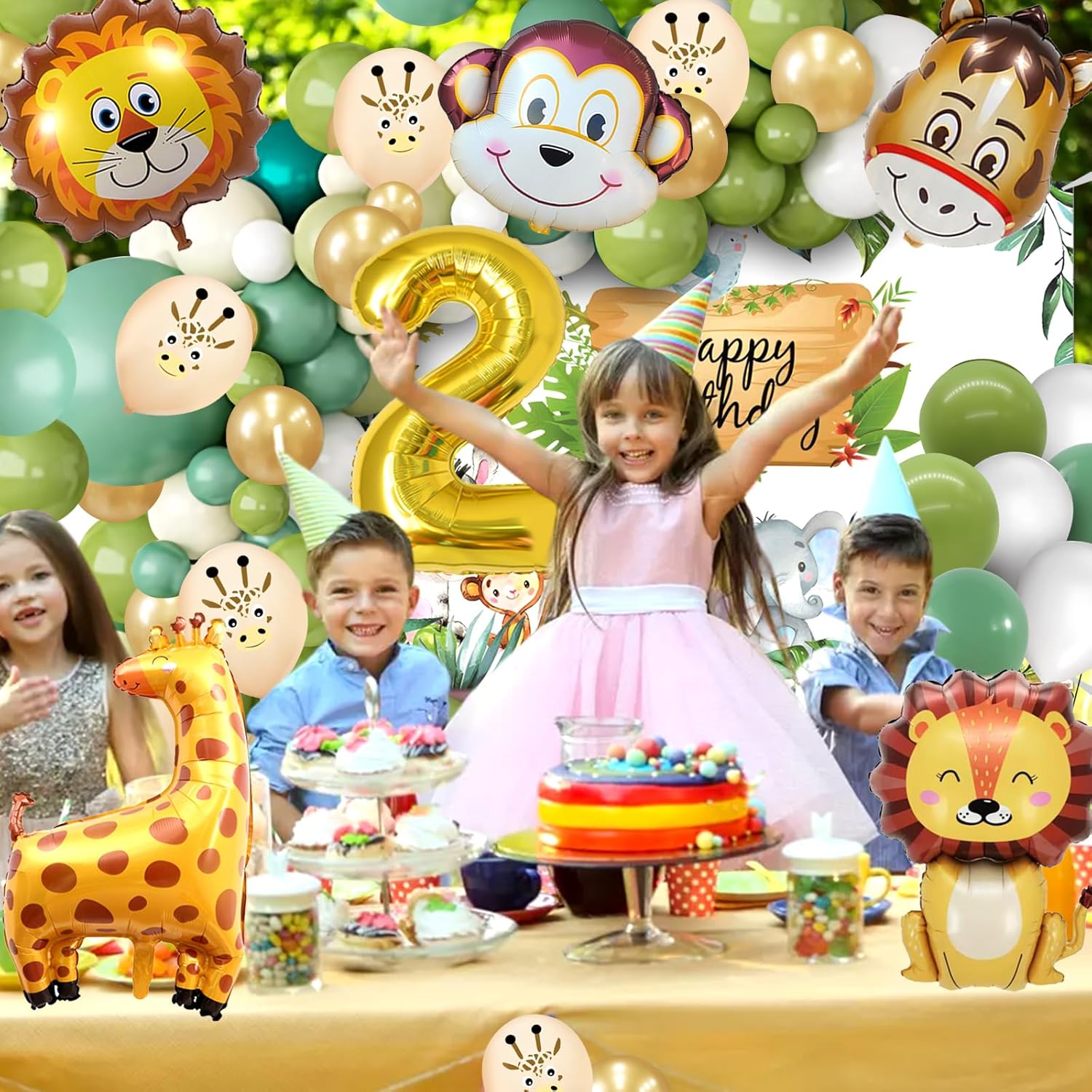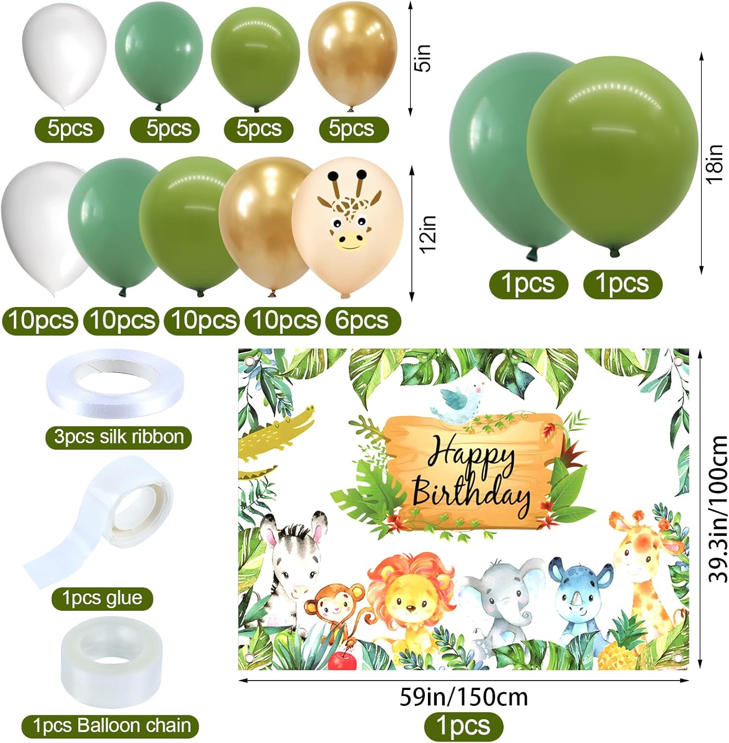 【Palloncini compleanno giungla di 2 anni】 Il set compleanno per bambini contiene: panno di sfondo Happy Birthday *1, palloncino foil numero 2 *1, palloncino foil animale *5, palloncino in lattice da 5 pollici (bianco *5, verde *5, verde scuro *5, oro *5), palloncino in lattice da 12 pollici (bianco *10, verde *10, verde scuro *10, oro chiaro *10, palloncino giraffa *6), palloncino da 18 pollici (verde *1, verde scuro *1), fiocco *3, nastro a palloncino * 1, catena a palloncino * 1. Abbastanza per una grande festa di compleanno con animali selvatici. 【Design unico degli animali della giungla】 I palloncini per il compleanno degli animali utilizzano palloncini verdi e dorati unici che si abbinano tra loro. Non puoi sbagliare con simpatici palloncini con animali e sfondi di compleanno con animali selvatici per decorare qualsiasi festa. Puoi decorare una festa di compleanno per bambini nella giungla unica con qualsiasi altra decorazione di compleanno. 【Materiale di alta qualità】 I palloncini per animali sono realizzati in lattice e foglio di alluminio di alta qualità, adatti per aria ed elio, robusti e durevoli, non facili da rompere e perdere, pieni d'aria possono essere conservati per giorni. Invita alla festa gli animali del bosco più amati, tutti gli amanti degli animali saranno deliziati da questa festa di compleanno. 【Ampiamente usato】 I simpatici palloncini della giungla sono perfetti per decorazioni di compleanno per bambini, decorazioni per feste selvagge, baby shower nella giungla, feste a tema animali, eventi all'aperto, decorazioni quotidiane e usati per decorare qualsiasi evento tu voglia, i simpatici palloncini con animali possono essere uno sfondo indelebile e divertente per le tue foto con amici e familiari. Facile da usare: i palloncini decorativi per la festa della giungla possono essere facilmente gonfiati con una cannuccia o una pompa, quindi legati semplicemente con un nastro. I palloncini con animali sono una buona decorazione per stanze, soffitti, pareti, finestre, porte, giardini, ecc., ravvivano rapidamente il luogo della festa mentre tu e la tua famiglia vi godete insieme il divertimento delle decorazioni della festa.