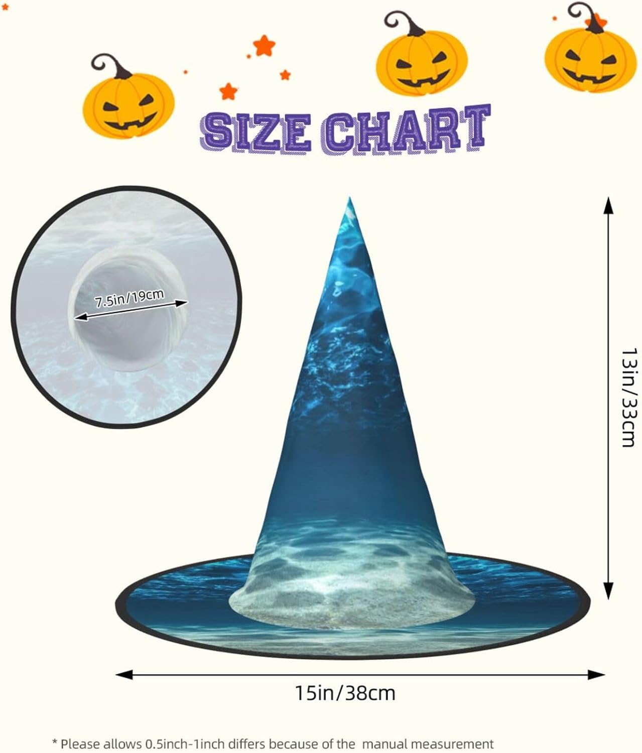 Realizzati in tessuto Oxford superiore, i nostri cappelli con stampa blu oceano mare garantiscono durata e longevità. Il design unico consente di ridurre al minimo la parte superiore del cappello e i bordi di essere attorcigliati e piegati, rendendo i cappelli salvaspazio e facilmente portatili. Ogni cappello con stampa blu oceano mare è di dimensioni generose per adattarsi alla maggior parte delle persone ed è leggero per un uso confortevole. Si prega di leggere la tabella delle taglie prima di effettuare l'ordine. Il design versatile dei nostri cappelli da strega di Halloween con stampa blu oceano mare li rende perfetti per varie occasioni. Sono lavabili in lavatrice e ad asciugatura rapida per una facile manutenzione.