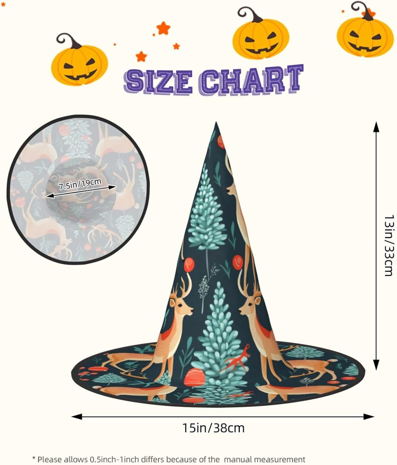 Realizzato in tessuto Oxford, il cappello con stampa di alce dell'albero di Natale promette comfort che durerà per molti Halloween a venire. È leggero, facile da trasportare e versatile, consente di ruotare e piegare i bordi per risparmiare spazio. Con dimensioni precise, il cappello con stampa di alce dell'albero di Natale è progettato per ospitare la maggior parte delle persone. Usalo per feste di Halloween, carnevale, feste in maschera o eventi di gioco di ruolo e lascia che il tuo affascinante fascino avvolga la folla. Facile da pulire e veloce da asciugare, il nostro cappello da strega offre una combinazione ideale di praticità e fascino.