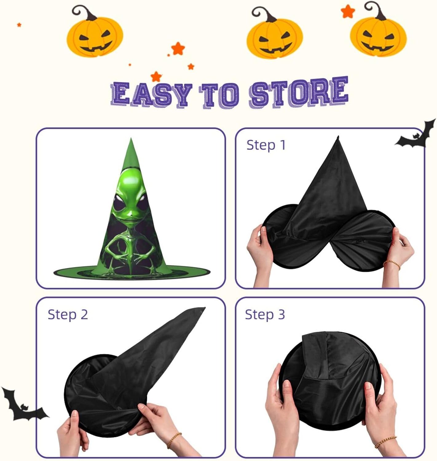Realizzati in tessuto Oxford superiore, i nostri cappelli verdi con stampa aliena garantiscono durata e longevità. Il design unico consente di ridurre al minimo la parte superiore del cappello e i bordi di essere attorcigliati e piegati, rendendo i cappelli salvaspazio e facilmente portatili. Ogni cappello verde con stampa aliena è di dimensioni generose per adattarsi alla maggior parte delle persone ed è leggero per un uso confortevole. Si prega di leggere la tabella delle taglie prima di effettuare l'ordine. Il design versatile dei nostri cappelli da strega di Halloween con stampa aliena verde li rende perfetti per varie occasioni. Sono lavabili in lavatrice e ad asciugatura rapida per una facile manutenzione.