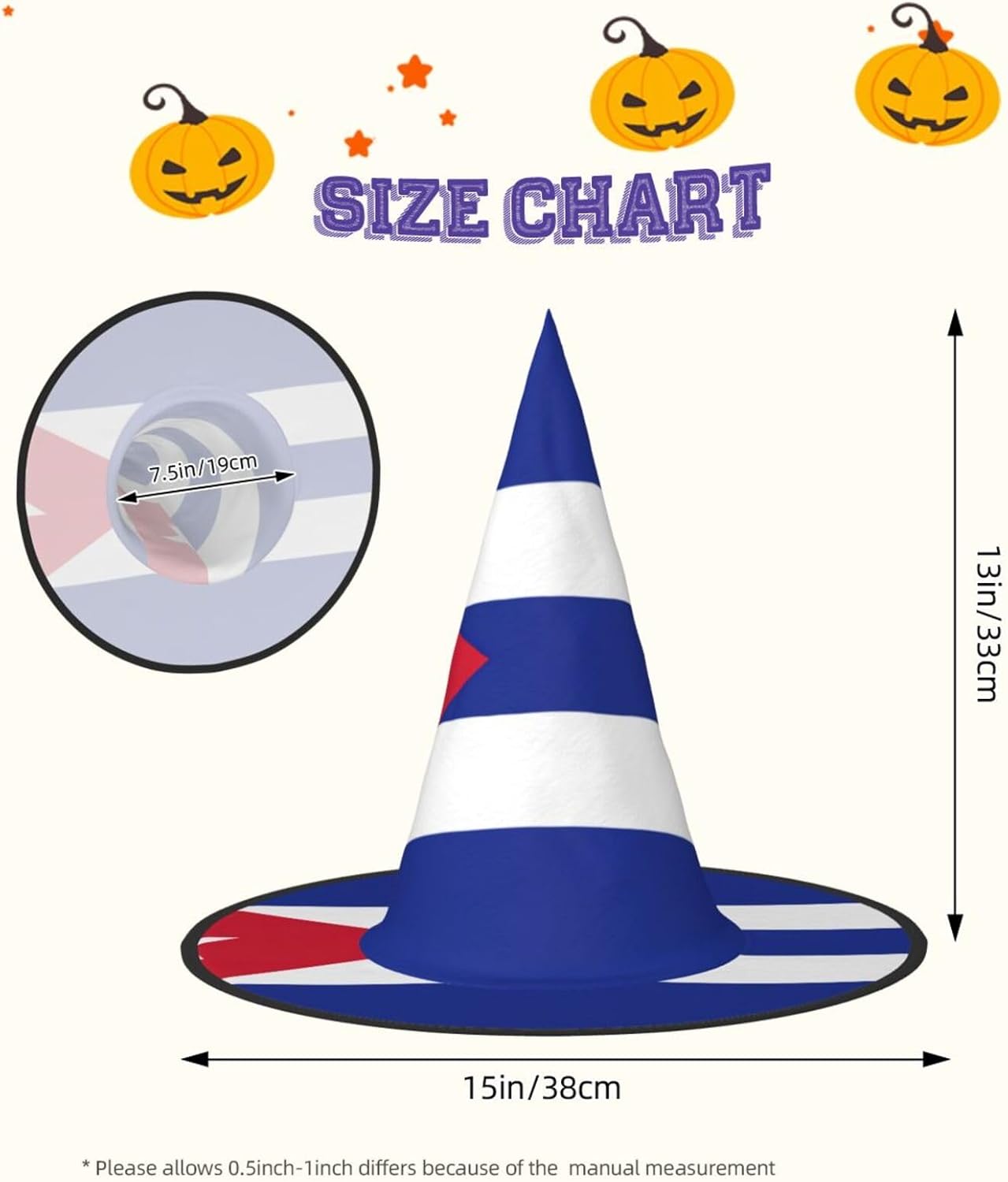 Realizzati in tessuto Oxford superiore, i nostri cappelli con stampa bandiera cubana garantiscono durata e longevità. Il design unico consente di ridurre al minimo la parte superiore del cappello e i bordi di essere attorcigliati e piegati, rendendo i cappelli salvaspazio e facilmente portatili. Ogni cappello con stampa bandiera cubana è di dimensioni generose per adattarsi alla maggior parte delle persone ed è leggero per un uso confortevole. Si prega di leggere la tabella delle taglie prima di effettuare l'ordine. Il design versatile dei nostri cappelli da strega di Halloween con stampa bandiera cubana li rende perfetti per varie occasioni. Sono lavabili in lavatrice e ad asciugatura rapida per una facile manutenzione.