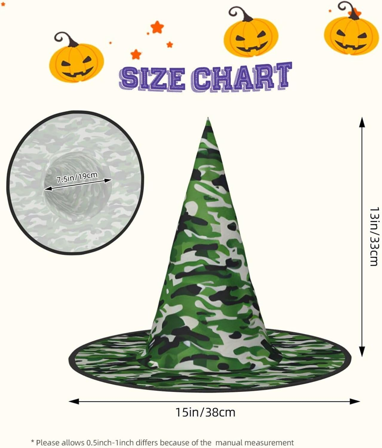 Realizzati in tessuto Oxford superiore, i nostri cappelli con stampa mimetica verde garantiscono durata e longevità. Il design unico consente di ridurre al minimo la parte superiore del cappello e i bordi di essere attorcigliati e piegati, rendendo i cappelli salvaspazio e facilmente portatili. Ogni cappello verde con stampa mimetica è di dimensioni generose per adattarsi alla maggior parte delle persone ed è leggero per un uso confortevole. Si prega di leggere la tabella delle taglie prima di effettuare l'ordine. Il design versatile dei nostri cappelli da strega di Halloween con stampa mimetica verde li rende perfetti per varie occasioni. Sono lavabili in lavatrice e ad asciugatura rapida per una facile manutenzione.