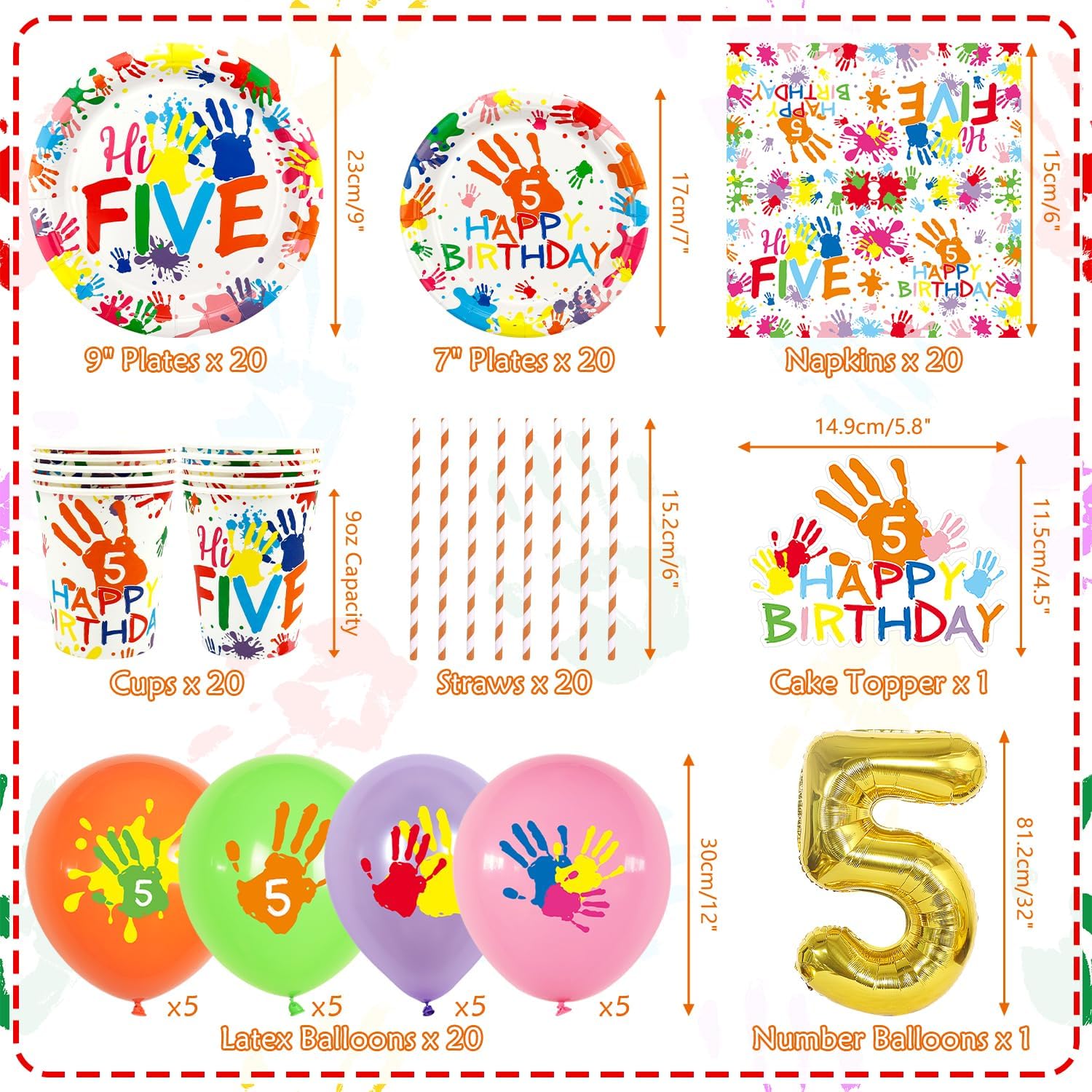 Quantità della confezione: include 1 striscione Hi Five, 1 striscione con motivo elemento, 20 piatti piani da 22,9 cm, 20 piatti da dessert da 17,8 cm, 20 tazze, 20 tovaglioli, 20 cannucce, 1 tovaglia, 20 palloncini in lattice, 12 decorazioni per torte piccole, 1 decorazione per torta grande. Tutto in quantità perfetto per servire 20 ospiti. Materiali: striscioni, piatti, tazze e tovaglioli sono realizzati in cartone bianco ecologico, materiali 100% per uso alimentare, i palloncini sono realizzati in lattice. Facile da installare: questi biglietti per banner "Hi Five " sono stati assemblati, è possibile utilizzare gli striscioni "Happy Birthday "per decorare una parete, uno sfondo, una recinzione, un tavolo da dessert, un soffitto, applicato come accessorio fotografico e altro ancora. Design colorato: le nostre belle decorazioni per il 5° compleanno per ragazzi e ragazze sono progettate in diversi stili con colori vivaci e forme di palma per adattarsi al tema di compleanno di 5 anni. Le stoviglie presentano un design vivace e giocoso con impronte di mani e la frase Hi Five, perfette per una festa di compleanno divertente e memorabile 。 Ampia applicazione: ideale per una festa di 5° compleanno a tema "Hi Five", riunioni casuali di familiari e amici, feste artistiche, eventi di vacanza, riunioni di famiglia, buffet o picnic all'aperto, stupirà la tua famiglia e gli amici.
