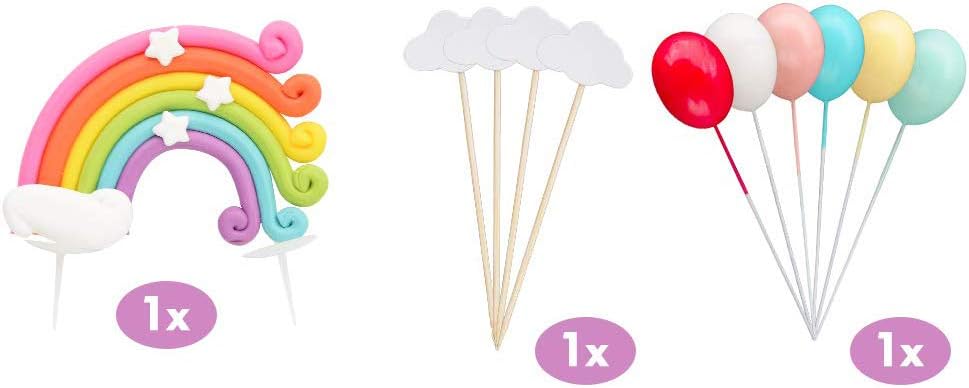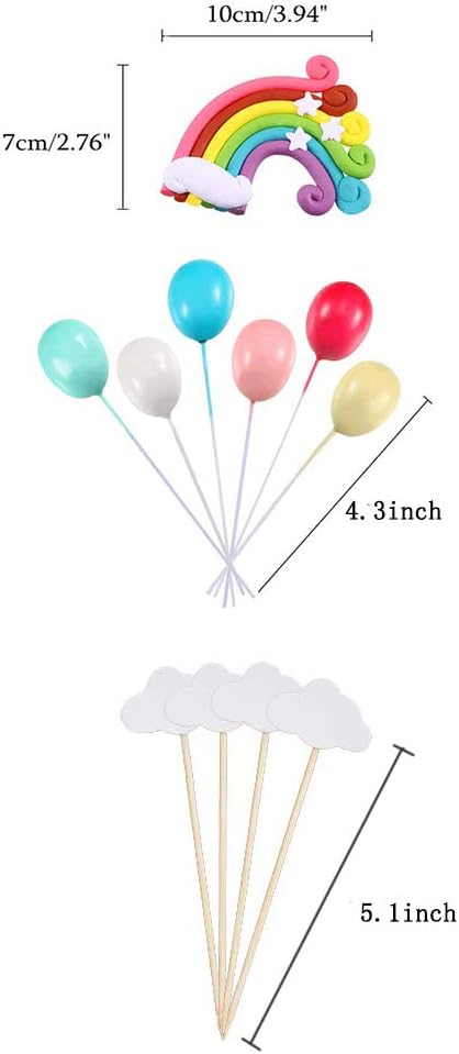 Decorazione per torte fatte in casa: puoi realizzare una deliziosa torta arcobaleno. Rendi le tue torte deliziose come sono. Materiali sicuri e riutilizzabili: il topper Happy Birthday è realizzato in materiale non commestibile, leggero ed estremamente resistente. L'arcobaleno è fatto di morbida argilla, le nuvole sono di cartone, i palloncini sono di schiuma, sicuri e leggeri. I nostri toppers per torta nuziale possono essere puliti e riutilizzati. Decorazione per torta di compleanno Ampia gamma di usi: la decorazione arcobaleno è adatta per la decorazione domestica, feste in giardino. La bellissima decorazione della torta crea un'atmosfera festosa ed è perfetta per feste di compleanno, matrimoni, festival e picnic. Accessori funzionali: per decorare cupcakes, muffin, torte, torte, dolcetti. Pacchetto decorazione torta di compleanno incluso: viene fornito con bastoncini di inserimento. Include 1 ponte arcobaleno, 6 palloncini, 4 decorazioni per torta a forma di nuvola, si adatta perfettamente a torte da 15-20 cm.