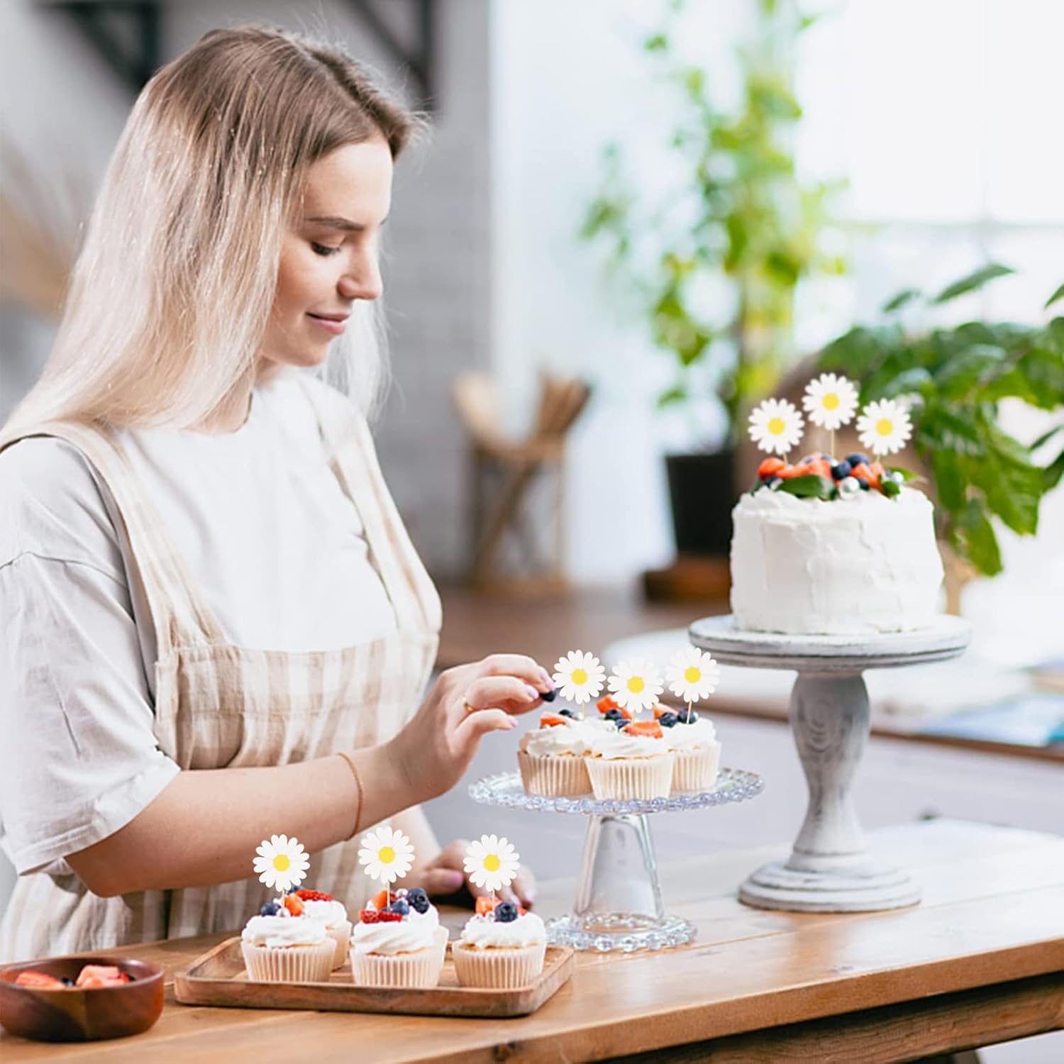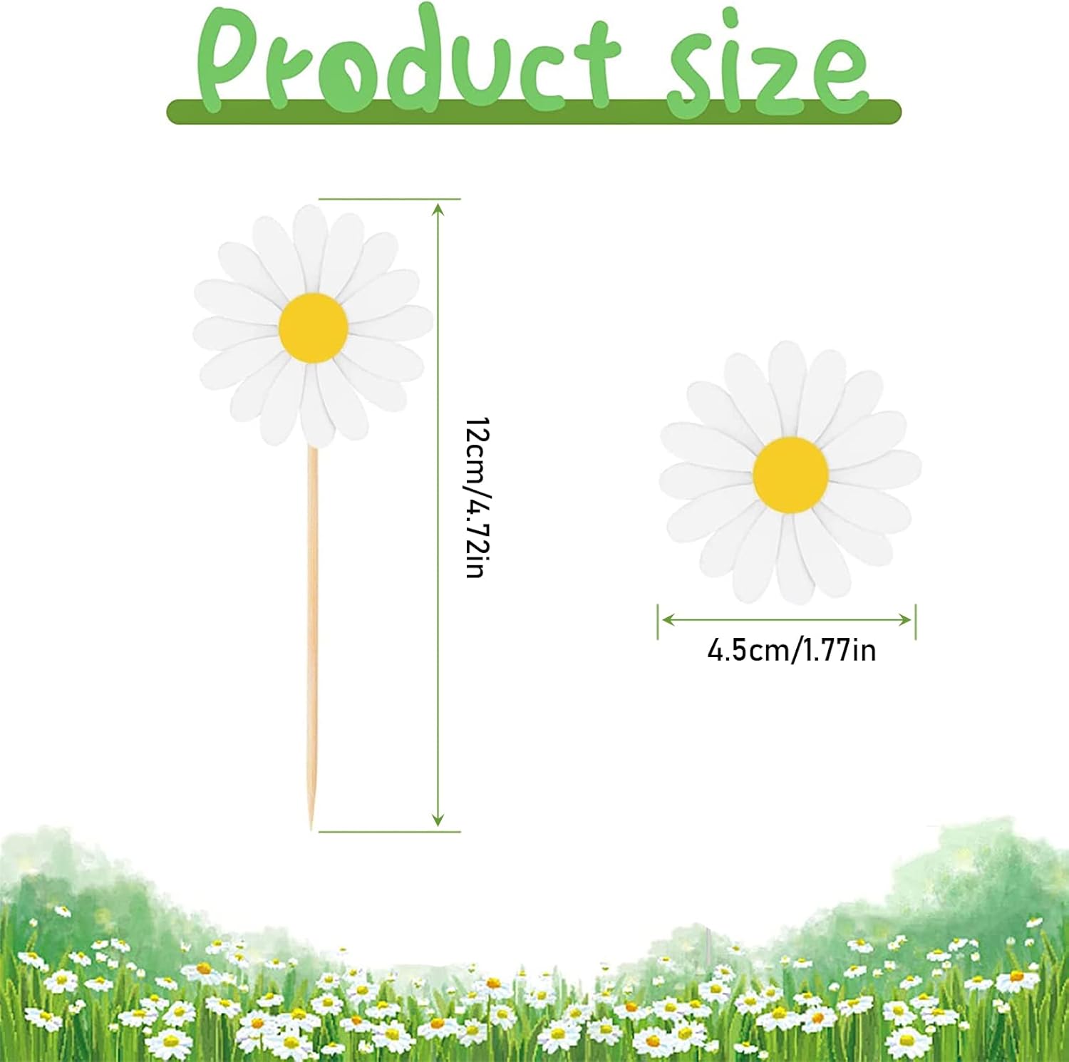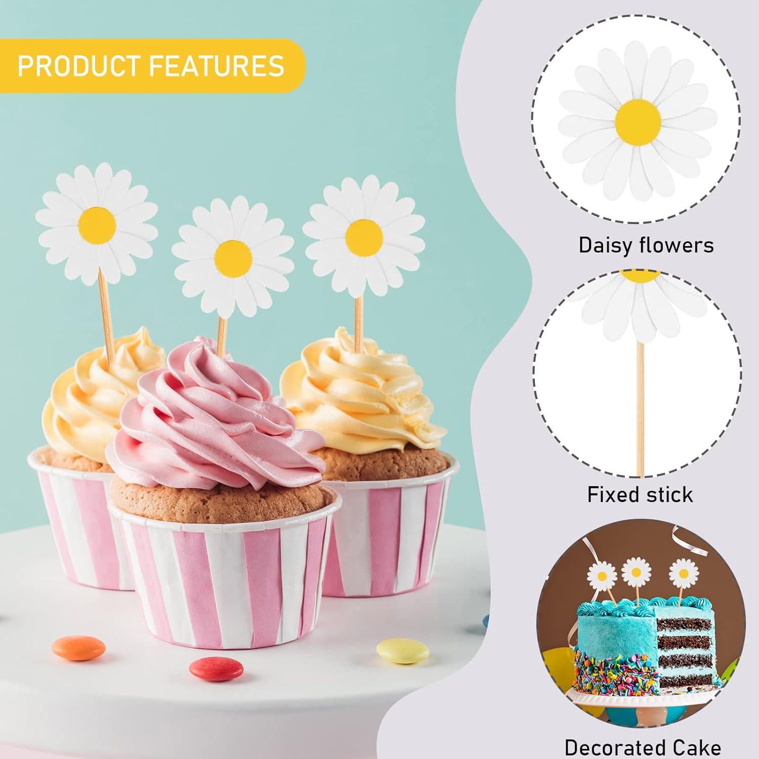 Materiale sicuro: il topper per torta con margherite è realizzato in materiale cartaceo molto sicuro, affidabile e inodore, con colori brillanti, non sbiadisce facilmente e può essere utilizzato più e più volte per lungo tempo. Aggiungi divertimento alla festa: vuoi rendere la tua torta più unica, i nostri accessori per torte possono fare proprio questo, e il simpatico set di decorazioni per torta con fiori di margherite è perfetto. Sorprendi i bambini e rendi perfetta la loro torta di compleanno Design unico: Il nostro topper per cupcake adotta il design delle margherite, ci sono due colori tra cui scegliere, il design delle margherite fa sì che i bambini e le donne apprezzino di più il nostro cake topper, possono essere combinati con diversi stili di torta per rendere la tua torta più accattivante Facile da usare: Ogni cake topper è dotato di uno stuzzicadenti in legno, che è molto rispettoso dell'ambiente e ti aiuta a collegare torte, cibo o frutta, facile e comodo da usare, più sicuro dei materiali plastici Adatto a tutte le occasioni: la decorazione della torta di compleanno è molto adatta per la decorazione di torte, feste di compleanno, adatta per decorare molti tipi di torte, cupcakes, gelati, dessert, decorazioni di muffin o puoi anche usarli per decorare altre cose